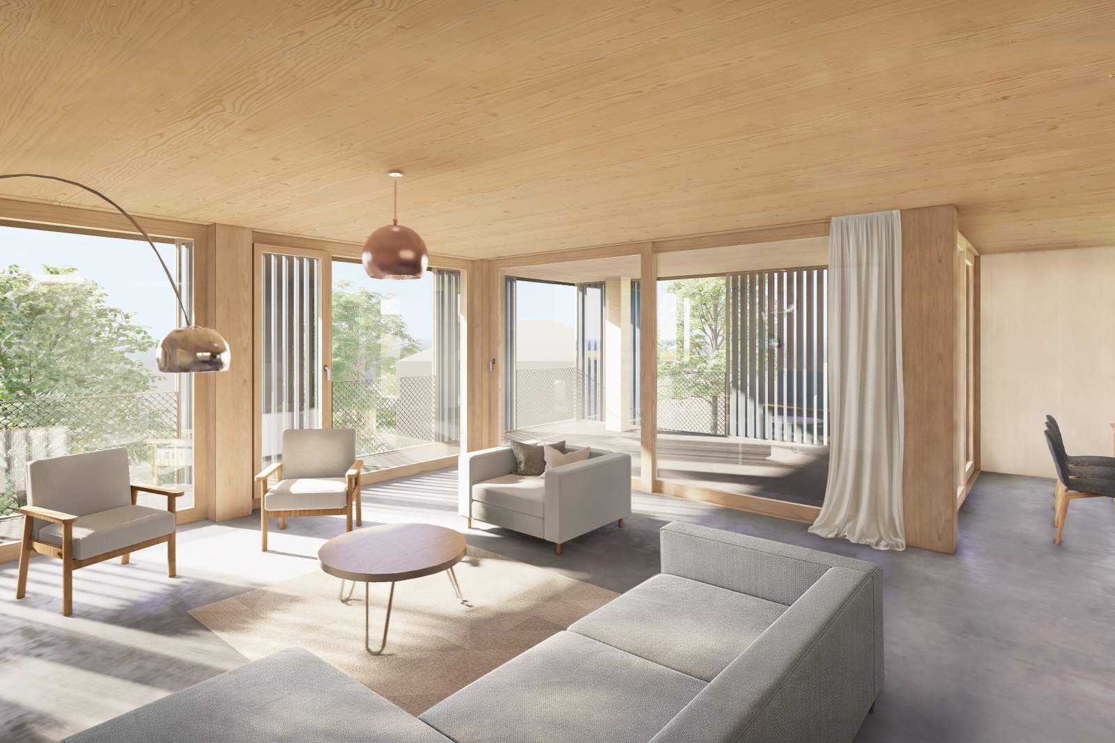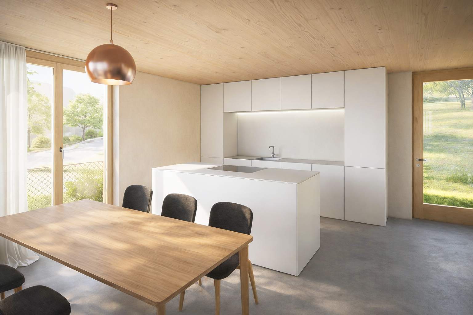 Der Aussenplatz ist einheitlich materialisiert und wird nur durch die Oblichter gegliedert. Ein Schopf mit Betondach und zwei Holzverschlägen schliesst den Platz räumlich gegen das Altersheim hin ab. Durch den weitestgehenden Erhalt der bestehenden Bausubstanz ist ein sehr nachhaltiges Projekt, mit einem Minimum an Abfallproduktion und einem schonungsvollen Umgang mit Ressourcen, realisiert worden.
