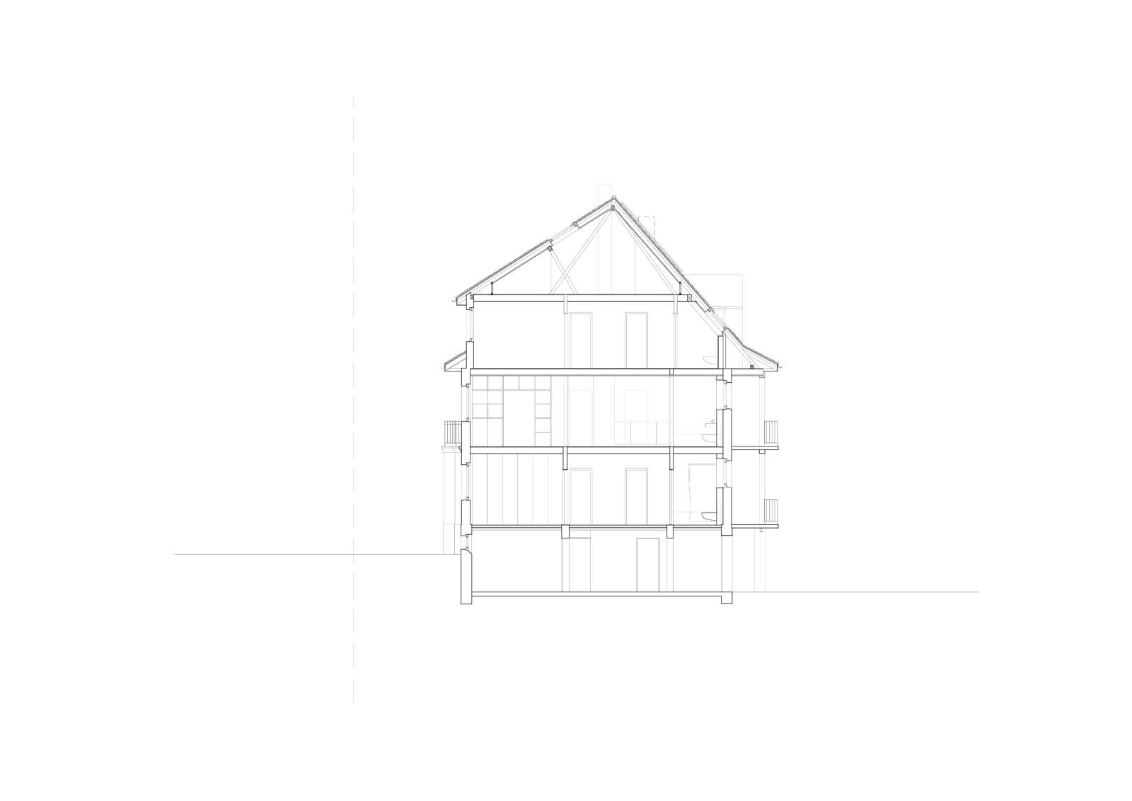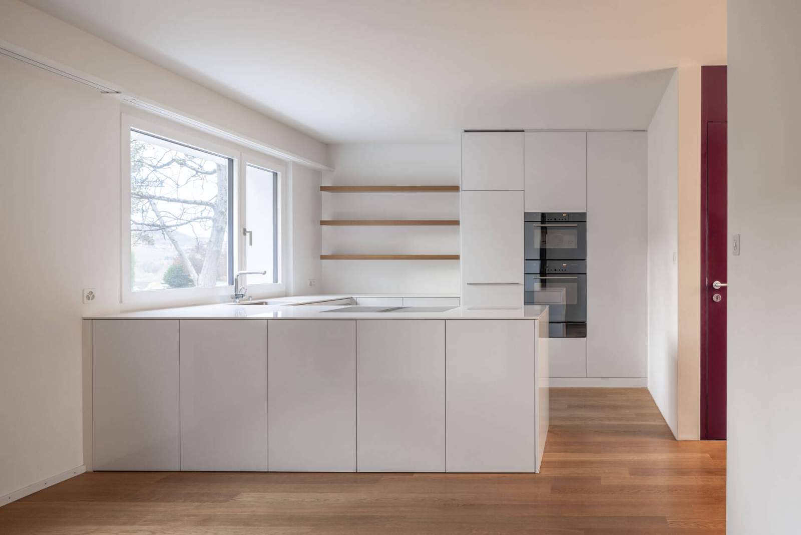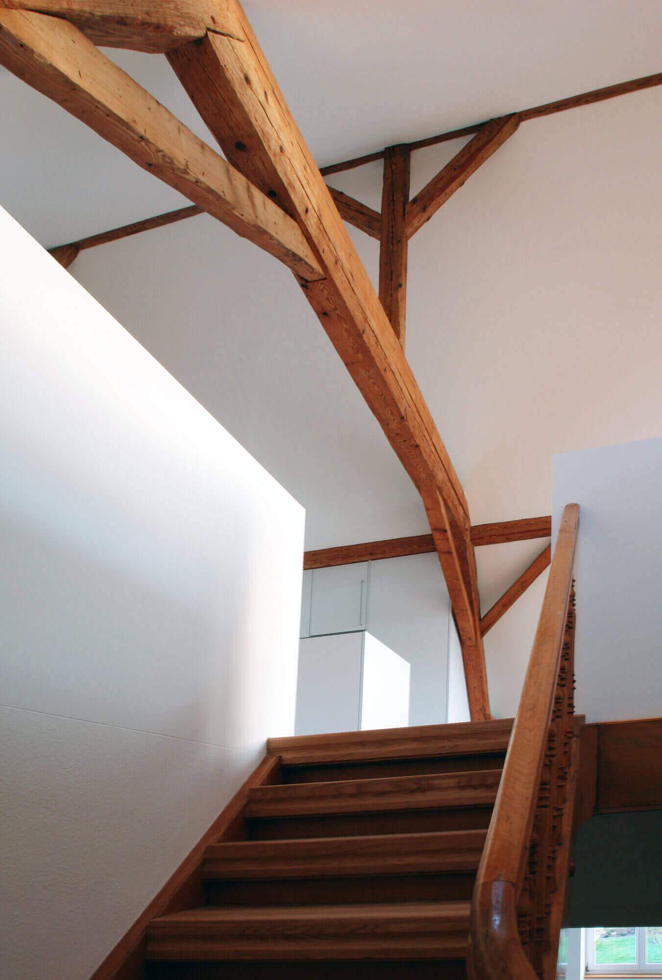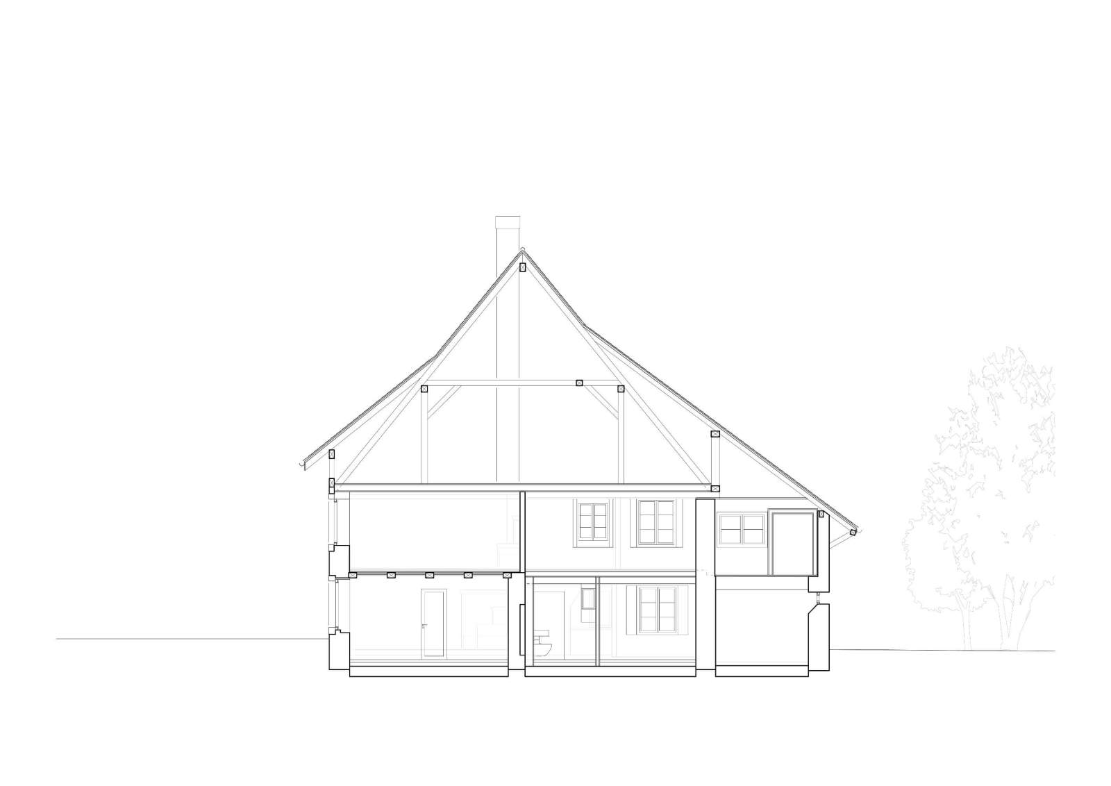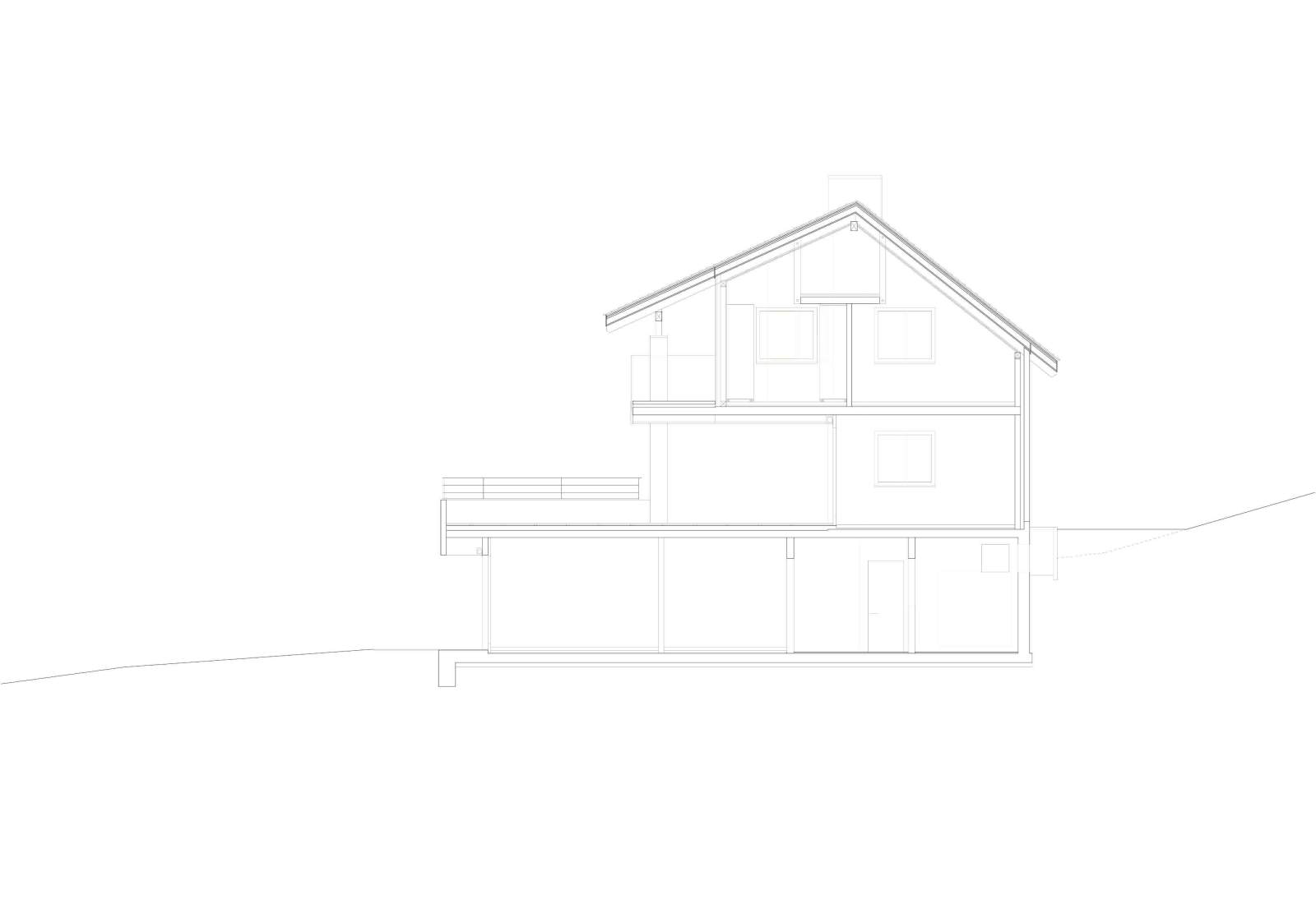 Die grössten Eingriffe erfährt das 1. Obergeschoss. Zugunsten einer grosszügigen Raumwirkung wird die Grundrissstruktur maximal aufgelöst und notwendige Wandabschnitte in raumbildende Körper integriert. Diese gliedern Küche, Wohn- und Arbeitsbereich. Das 2. Obergeschoss mit den Schlafräumen bleibt kleinteilig und erfährt bis auf die Öffnung zum Treppenraum kaum substantielle Eingriffe. Der ehemalige Estrich erhält zwei neue Dachfester und bietet den Kindern eine erweiterte Spielfläche. Um das ursprüngliche Fassadenbild zu erhalten, wurde lediglich das Dach saniert und alle Fenster ersetzt. Eine Photovoltaikanlage auf der südlichen Dachfläche ergänzt das energetische Konzept. Die haustechnischen Anlagen wurden modernisiert.