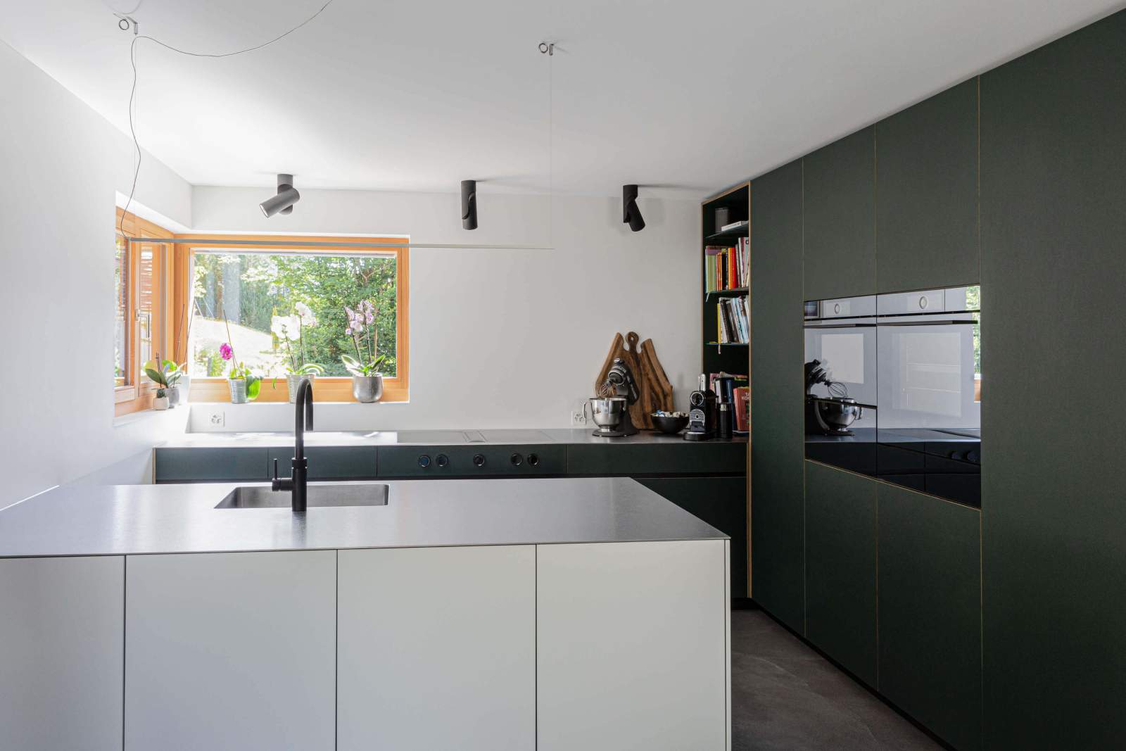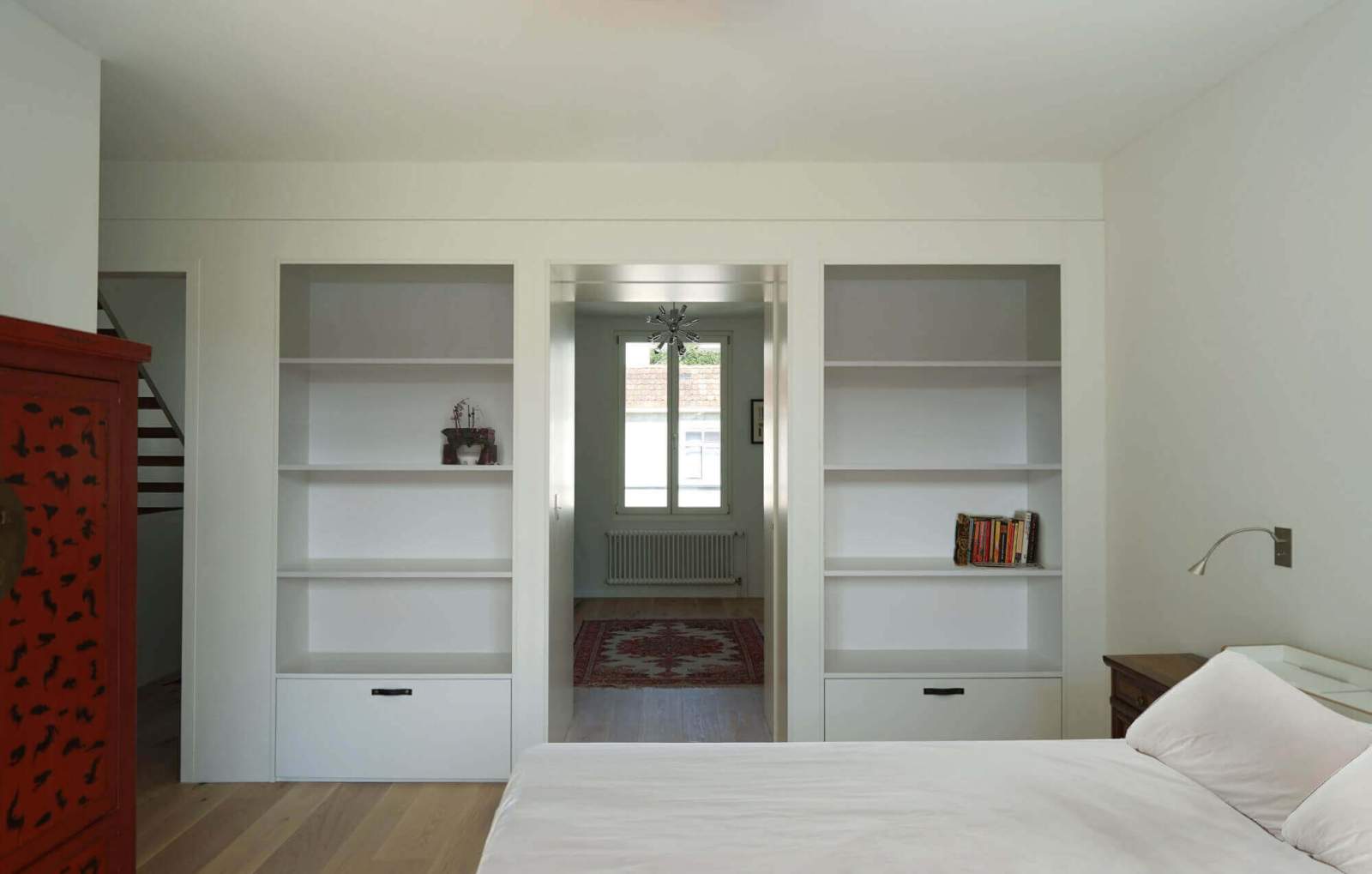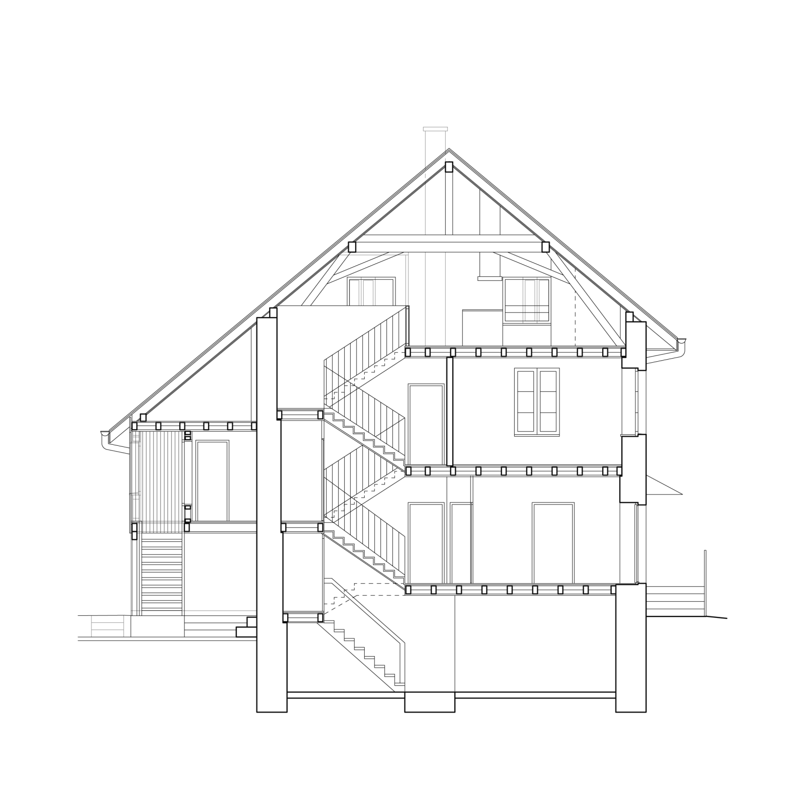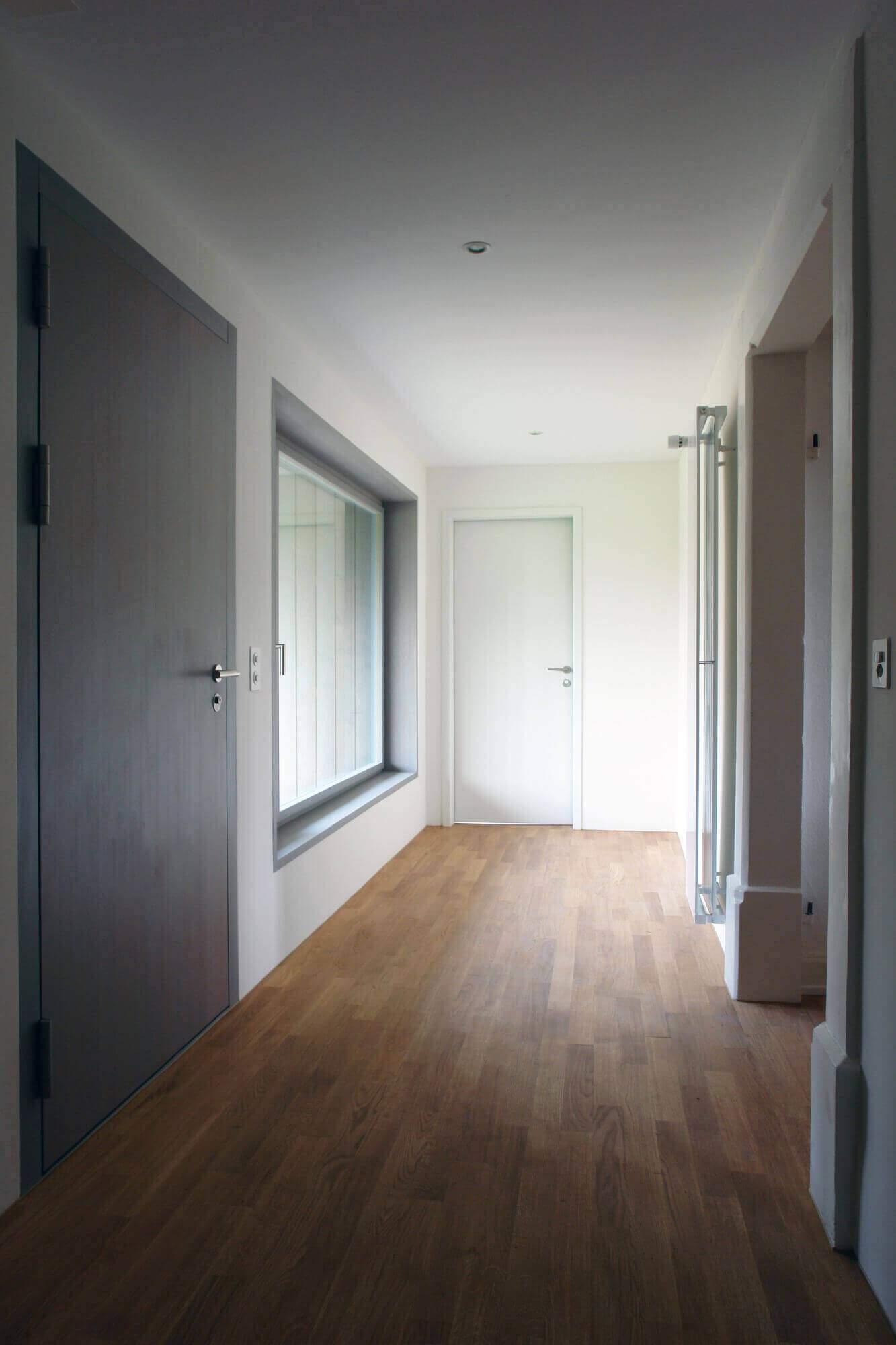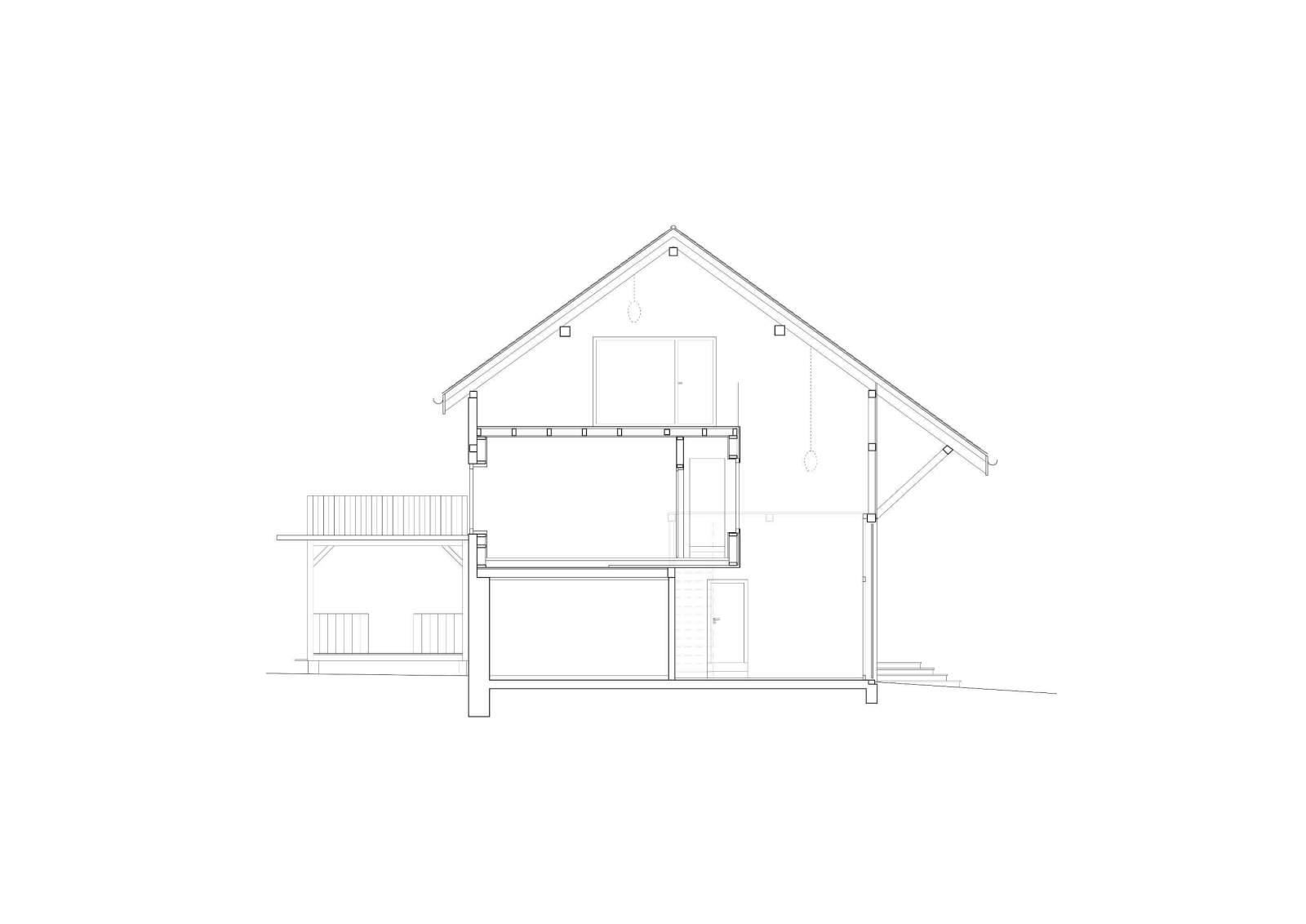Die grössten Eingriffe erfährt das 1. Obergeschoss. Zugunsten einer grosszügigen Raumwirkung wird die Grundrissstruktur maximal aufgelöst und notwendige Wandabschnitte in raumbildende Körper integriert. Diese gliedern Küche, Wohn- und Arbeitsbereich. Das 2. Obergeschoss mit den Schlafräumen bleibt kleinteilig und erfährt bis auf die Öffnung zum Treppenraum kaum substantielle Eingriffe. Der ehemalige Estrich erhält zwei neue Dachfester und bietet den Kindern eine erweiterte Spielfläche. Um das ursprüngliche Fassadenbild zu erhalten, wurde lediglich das Dach saniert und alle Fenster ersetzt. Eine Photovoltaikanlage auf der südlichen Dachfläche ergänzt das energetische Konzept. Die haustechnischen Anlagen wurden modernisiert.