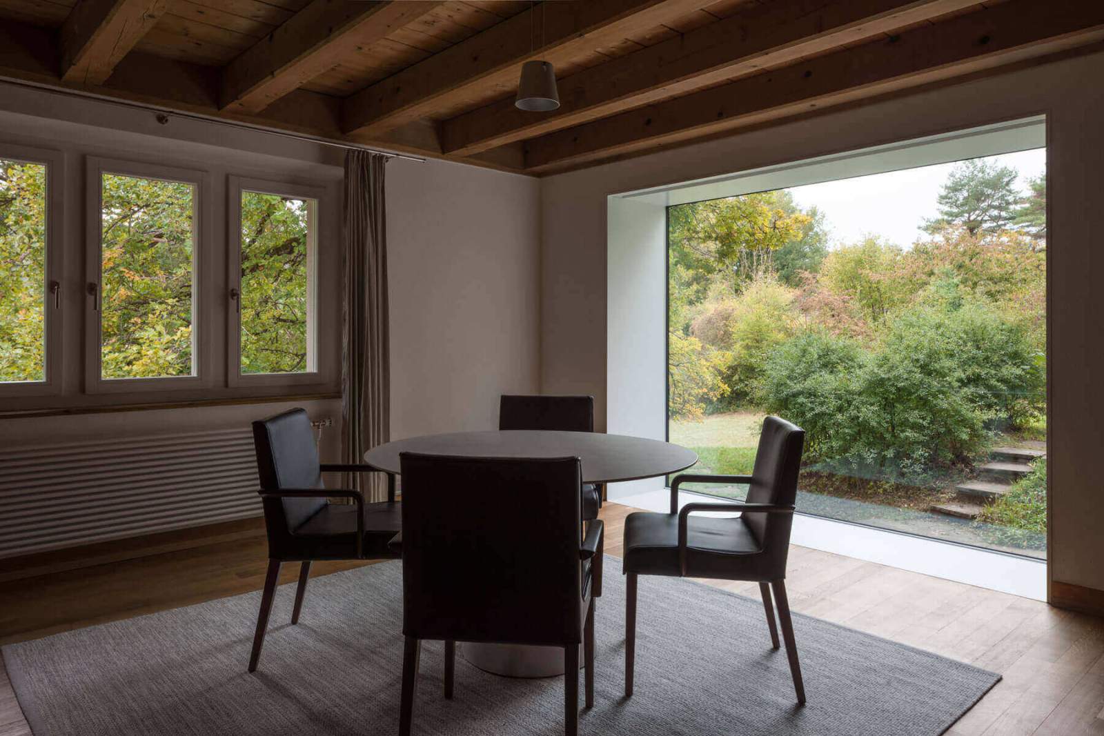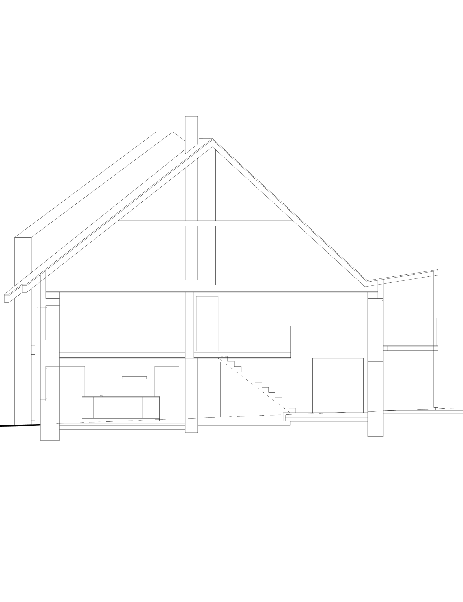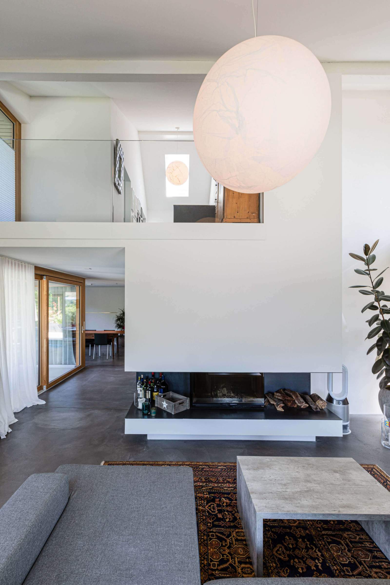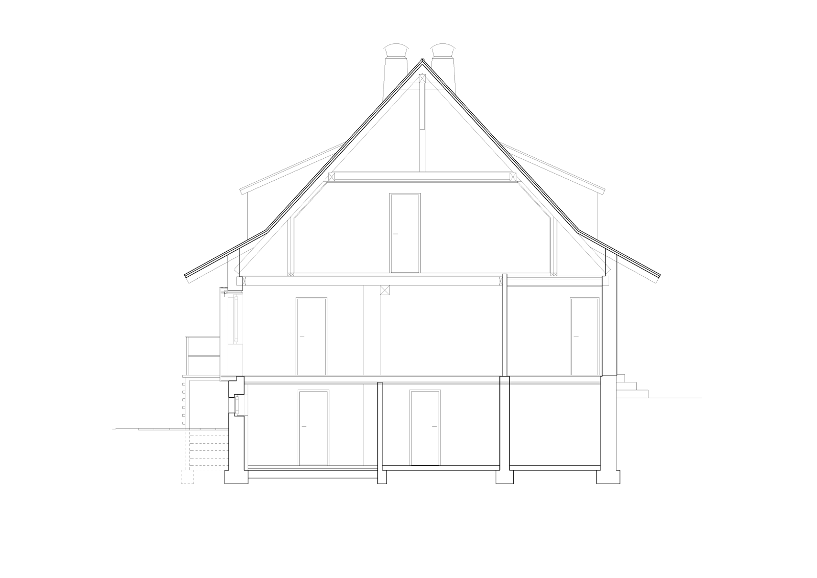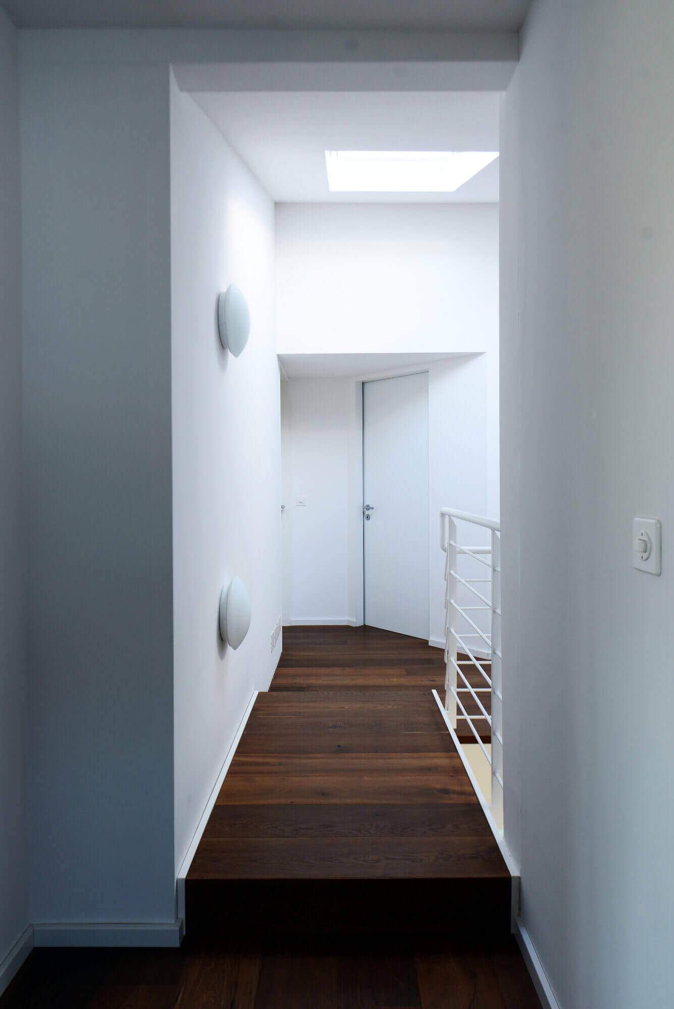 Die grössten Eingriffe erfährt das 1. Obergeschoss. Zugunsten einer grosszügigen Raumwirkung wird die Grundrissstruktur maximal aufgelöst und notwendige Wandabschnitte in raumbildende Körper integriert. Diese gliedern Küche, Wohn- und Arbeitsbereich. Das 2. Obergeschoss mit den Schlafräumen bleibt kleinteilig und erfährt bis auf die Öffnung zum Treppenraum kaum substantielle Eingriffe. Der ehemalige Estrich erhält zwei neue Dachfester und bietet den Kindern eine erweiterte Spielfläche. Um das ursprüngliche Fassadenbild zu erhalten, wurde lediglich das Dach saniert und alle Fenster ersetzt. Eine Photovoltaikanlage auf der südlichen Dachfläche ergänzt das energetische Konzept. Die haustechnischen Anlagen wurden modernisiert.