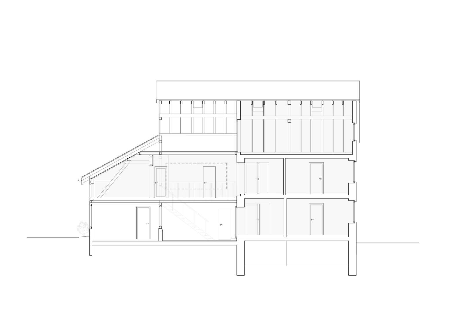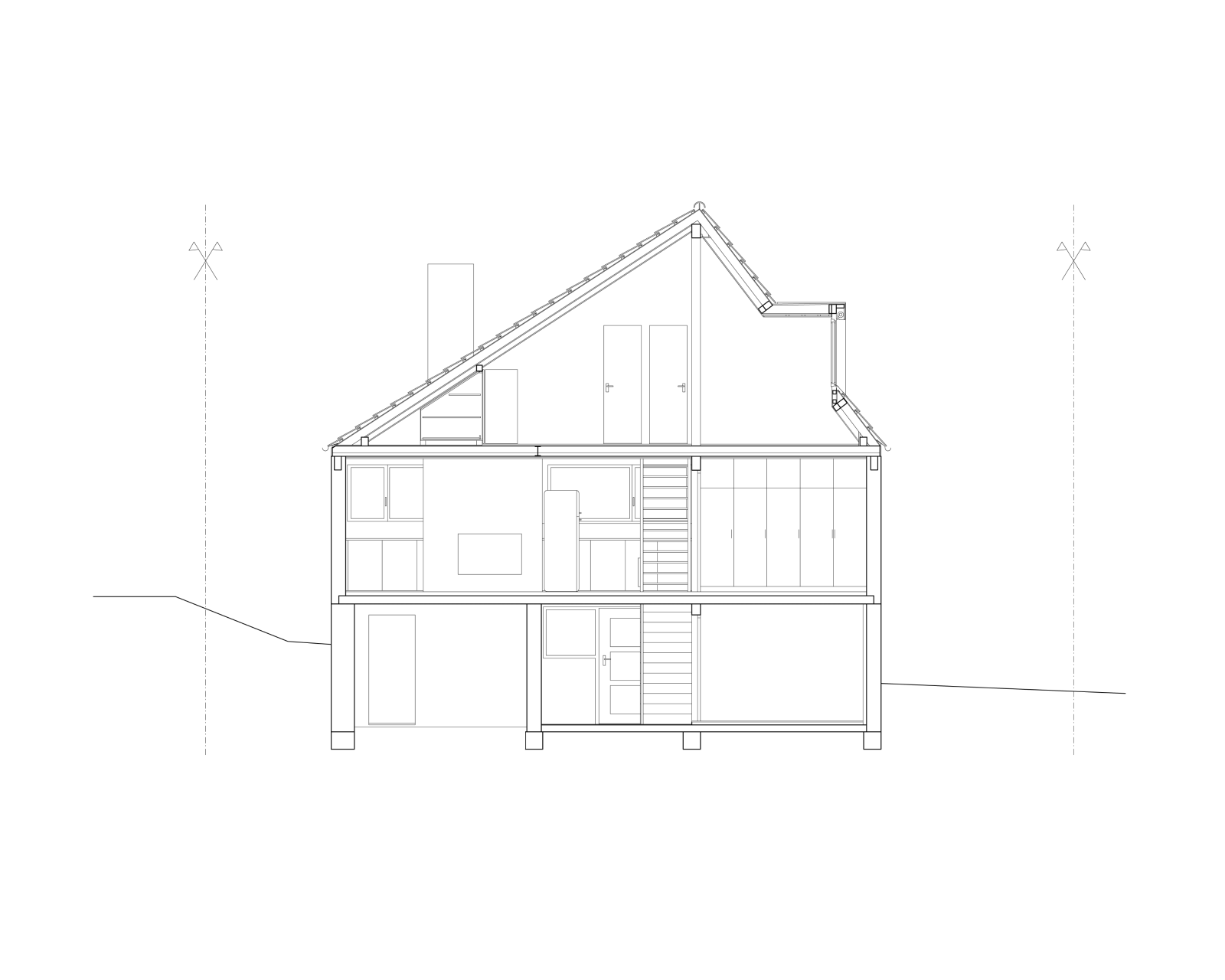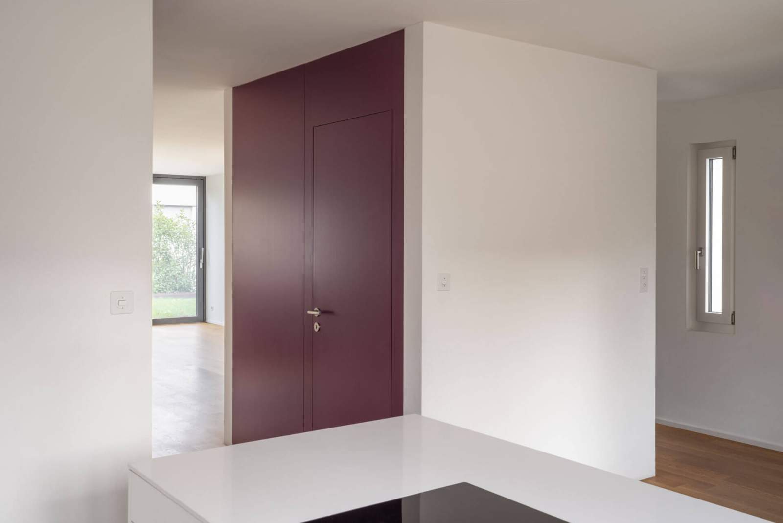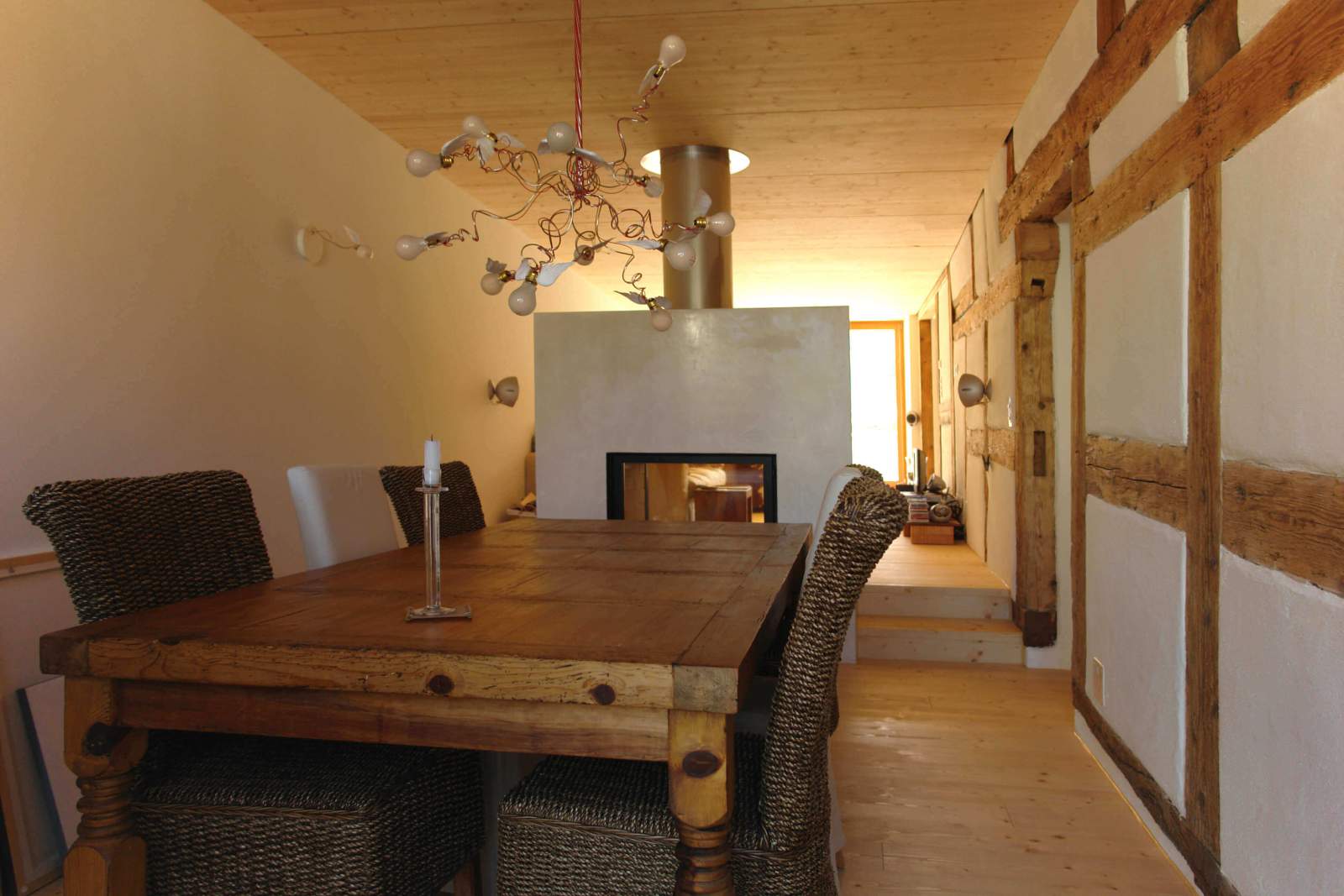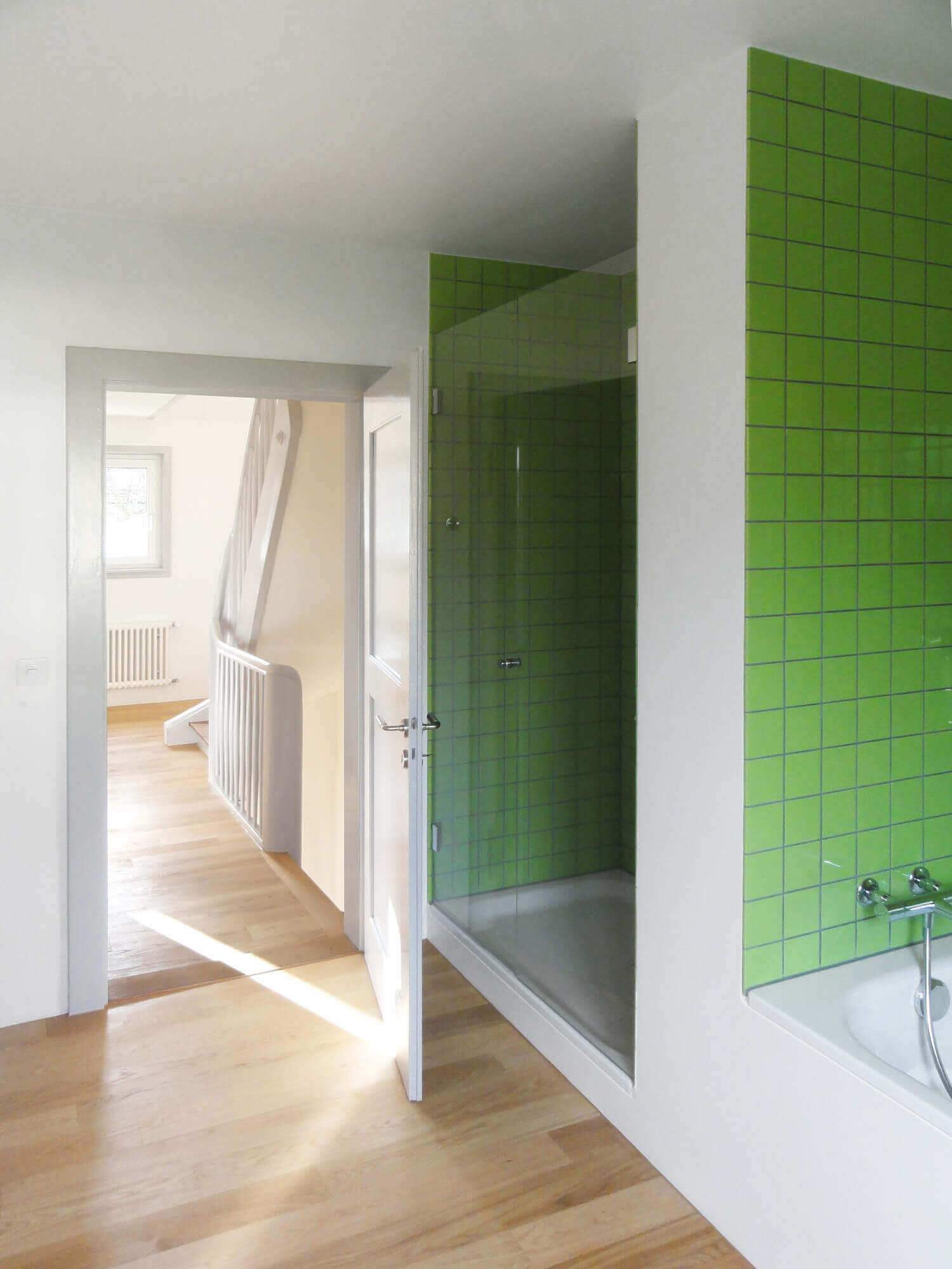 Die grössten Eingriffe erfährt das 1. Obergeschoss. Zugunsten einer grosszügigen Raumwirkung wird die Grundrissstruktur maximal aufgelöst und notwendige Wandabschnitte in raumbildende Körper integriert. Diese gliedern Küche, Wohn- und Arbeitsbereich. Das 2. Obergeschoss mit den Schlafräumen bleibt kleinteilig und erfährt bis auf die Öffnung zum Treppenraum kaum substantielle Eingriffe. Der ehemalige Estrich erhält zwei neue Dachfester und bietet den Kindern eine erweiterte Spielfläche. Um das ursprüngliche Fassadenbild zu erhalten, wurde lediglich das Dach saniert und alle Fenster ersetzt. Eine Photovoltaikanlage auf der südlichen Dachfläche ergänzt das energetische Konzept. Die haustechnischen Anlagen wurden modernisiert.
