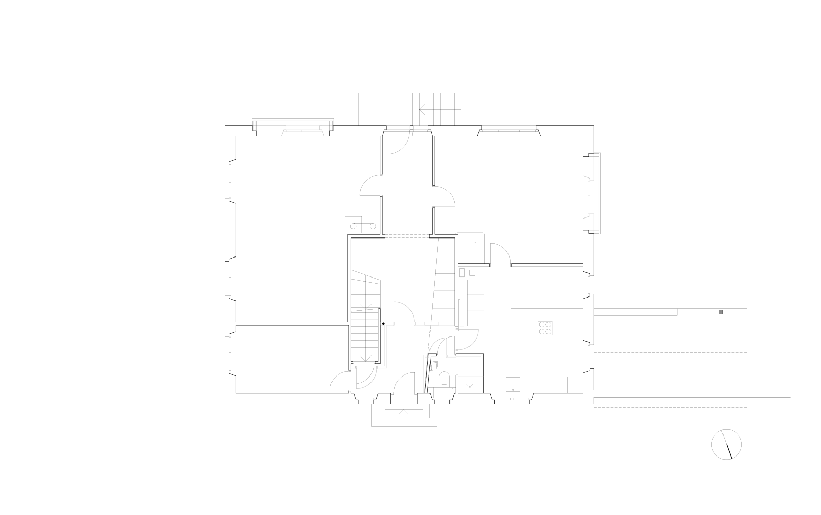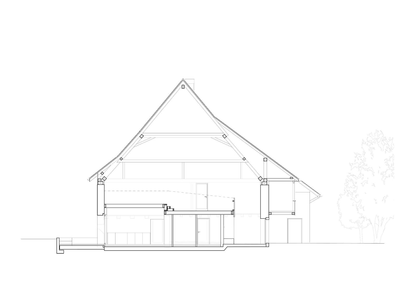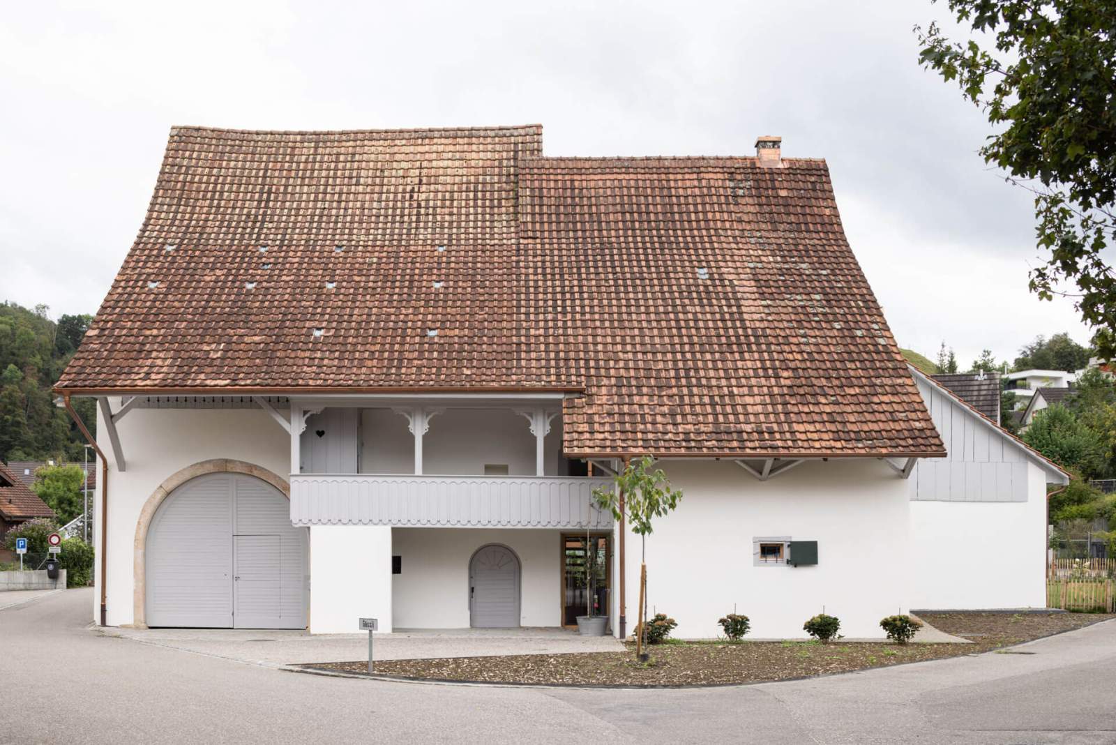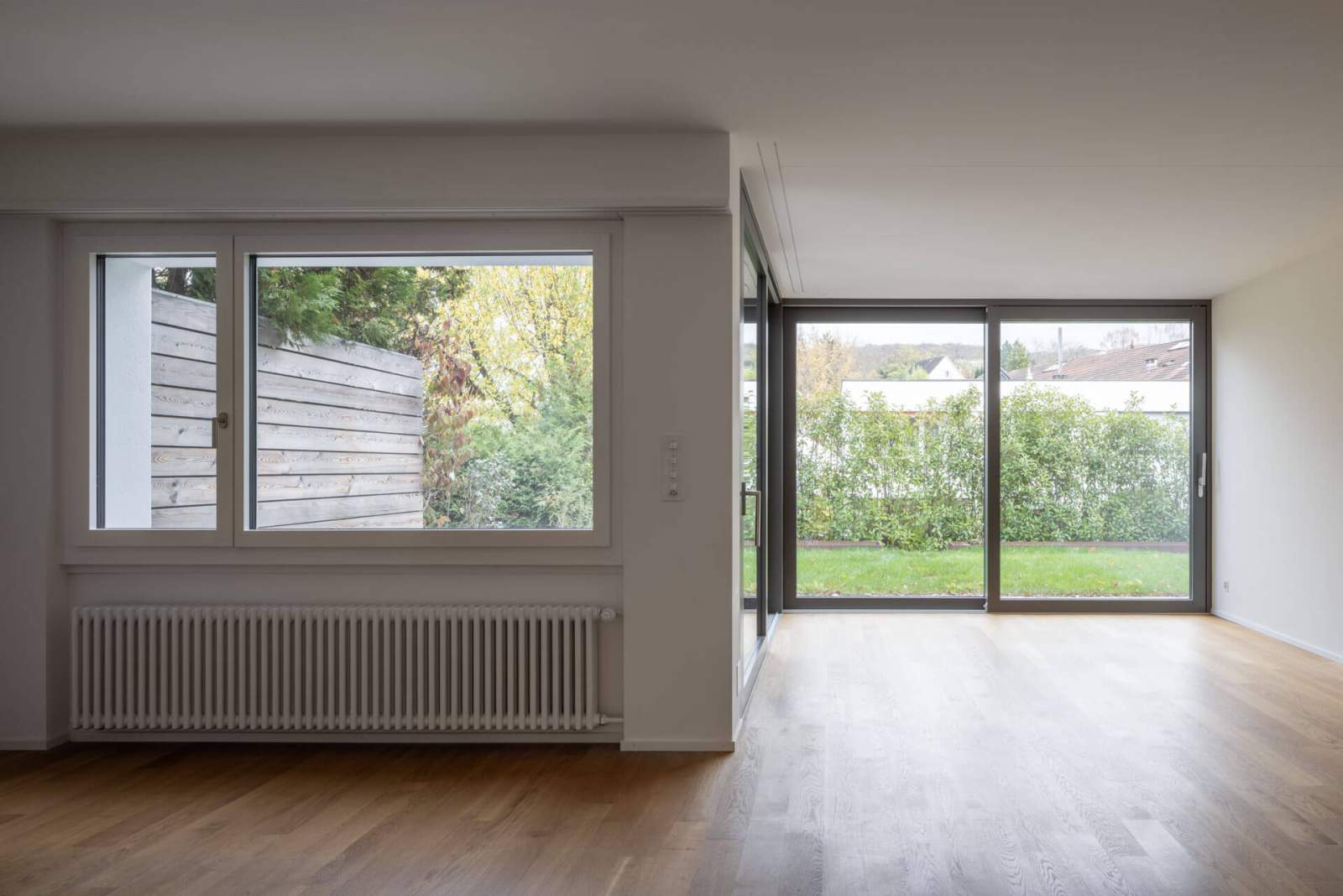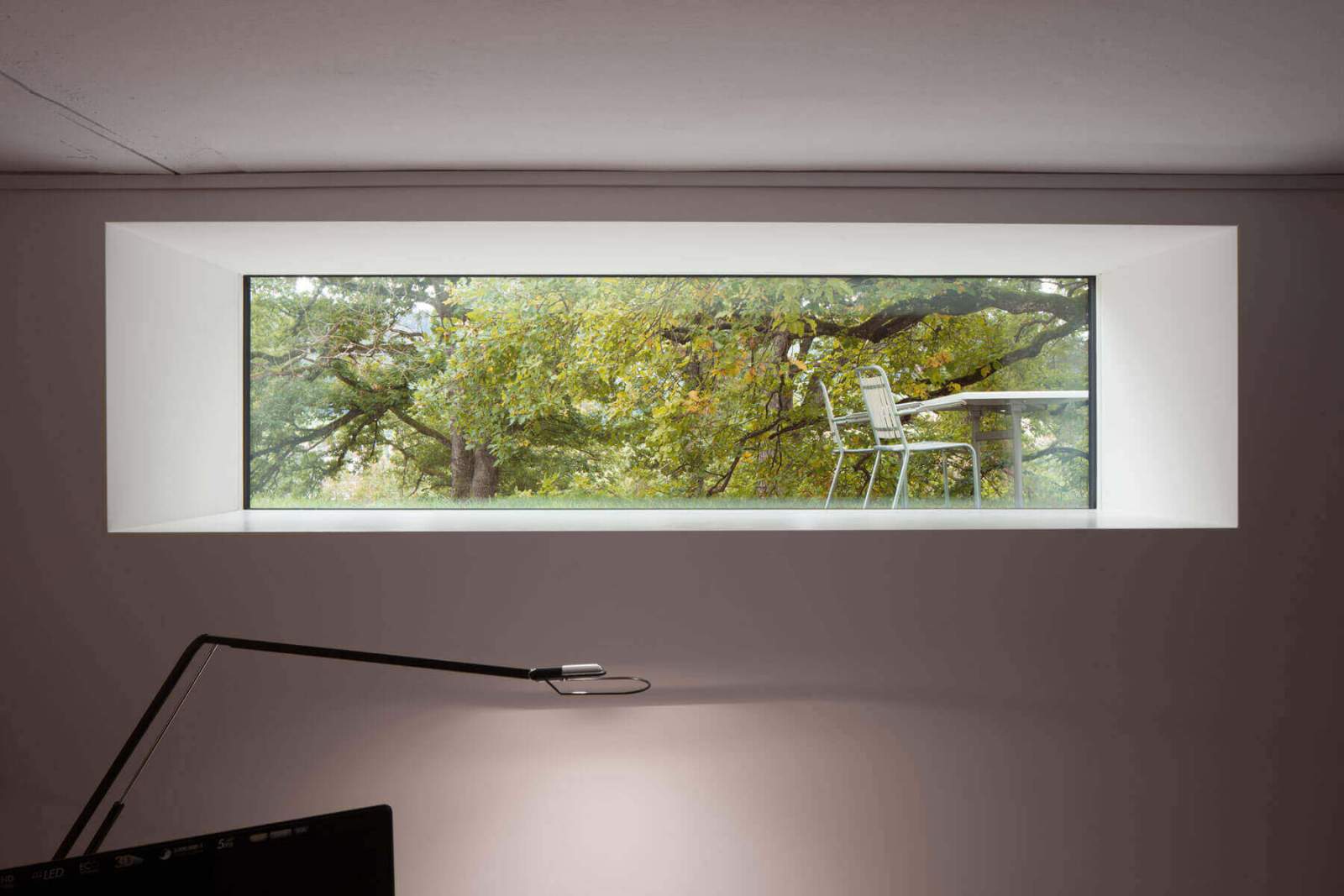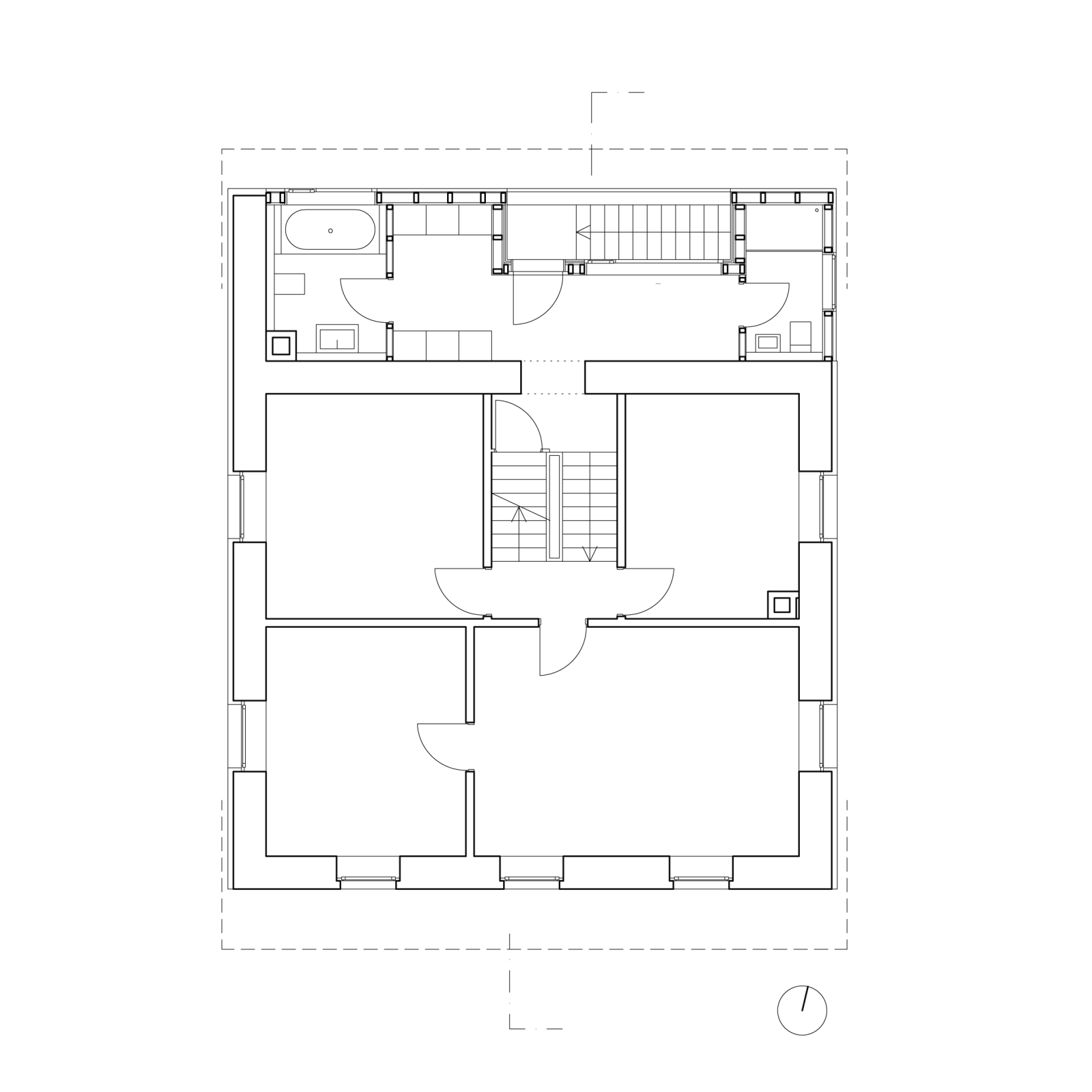 Die grössten Eingriffe erfährt das 1. Obergeschoss. Zugunsten einer grosszügigen Raumwirkung wird die Grundrissstruktur maximal aufgelöst und notwendige Wandabschnitte in raumbildende Körper integriert. Diese gliedern Küche, Wohn- und Arbeitsbereich. Das 2. Obergeschoss mit den Schlafräumen bleibt kleinteilig und erfährt bis auf die Öffnung zum Treppenraum kaum substantielle Eingriffe. Der ehemalige Estrich erhält zwei neue Dachfester und bietet den Kindern eine erweiterte Spielfläche. Um das ursprüngliche Fassadenbild zu erhalten, wurde lediglich das Dach saniert und alle Fenster ersetzt. Eine Photovoltaikanlage auf der südlichen Dachfläche ergänzt das energetische Konzept. Die haustechnischen Anlagen wurden modernisiert.