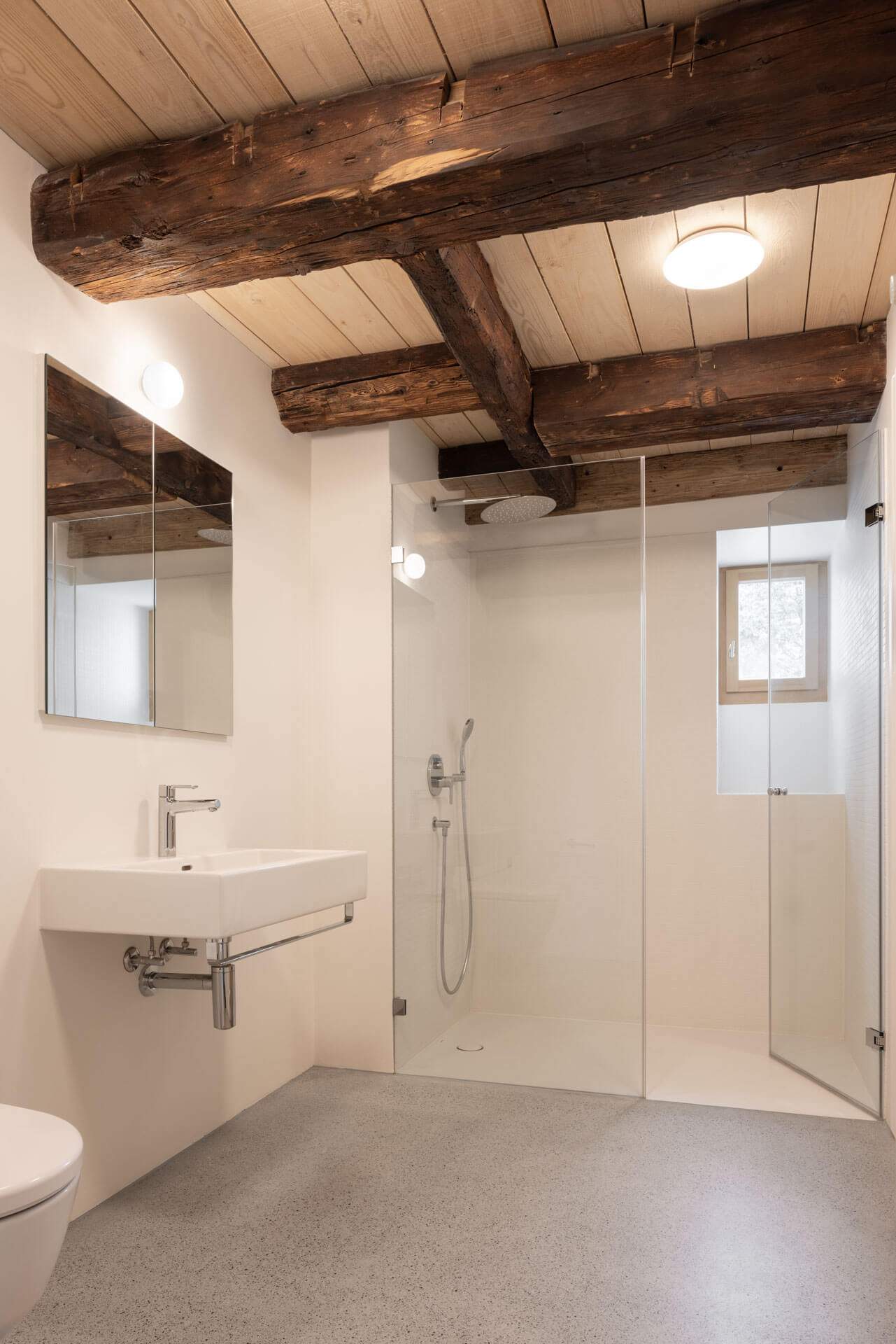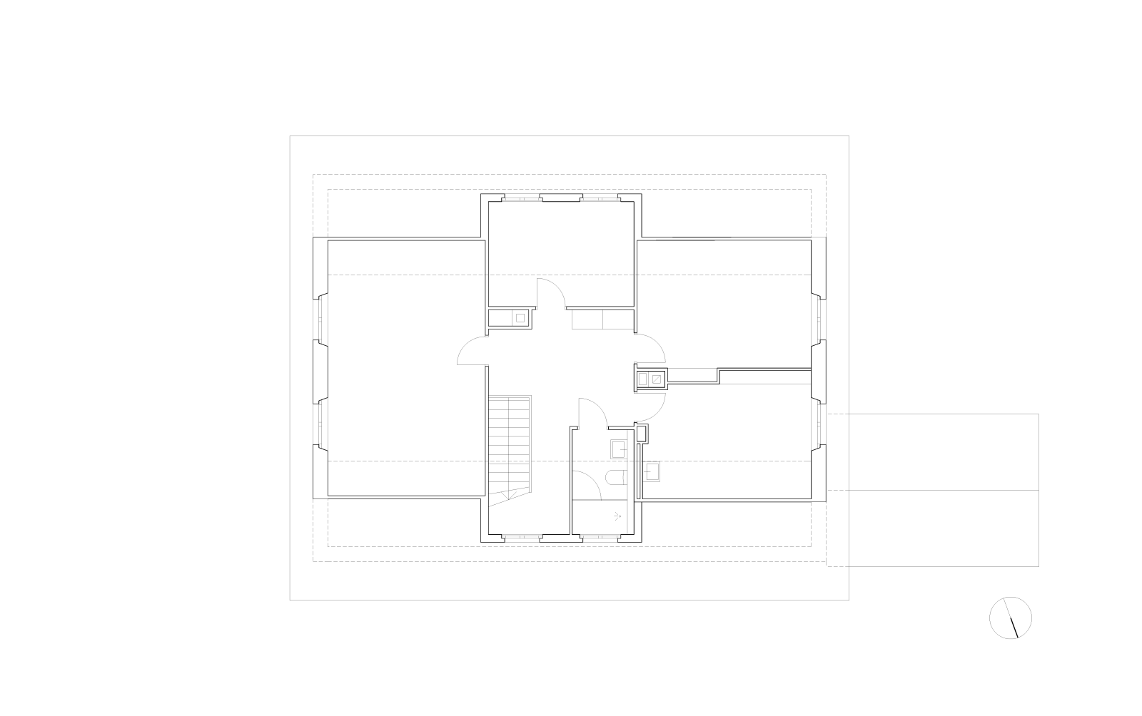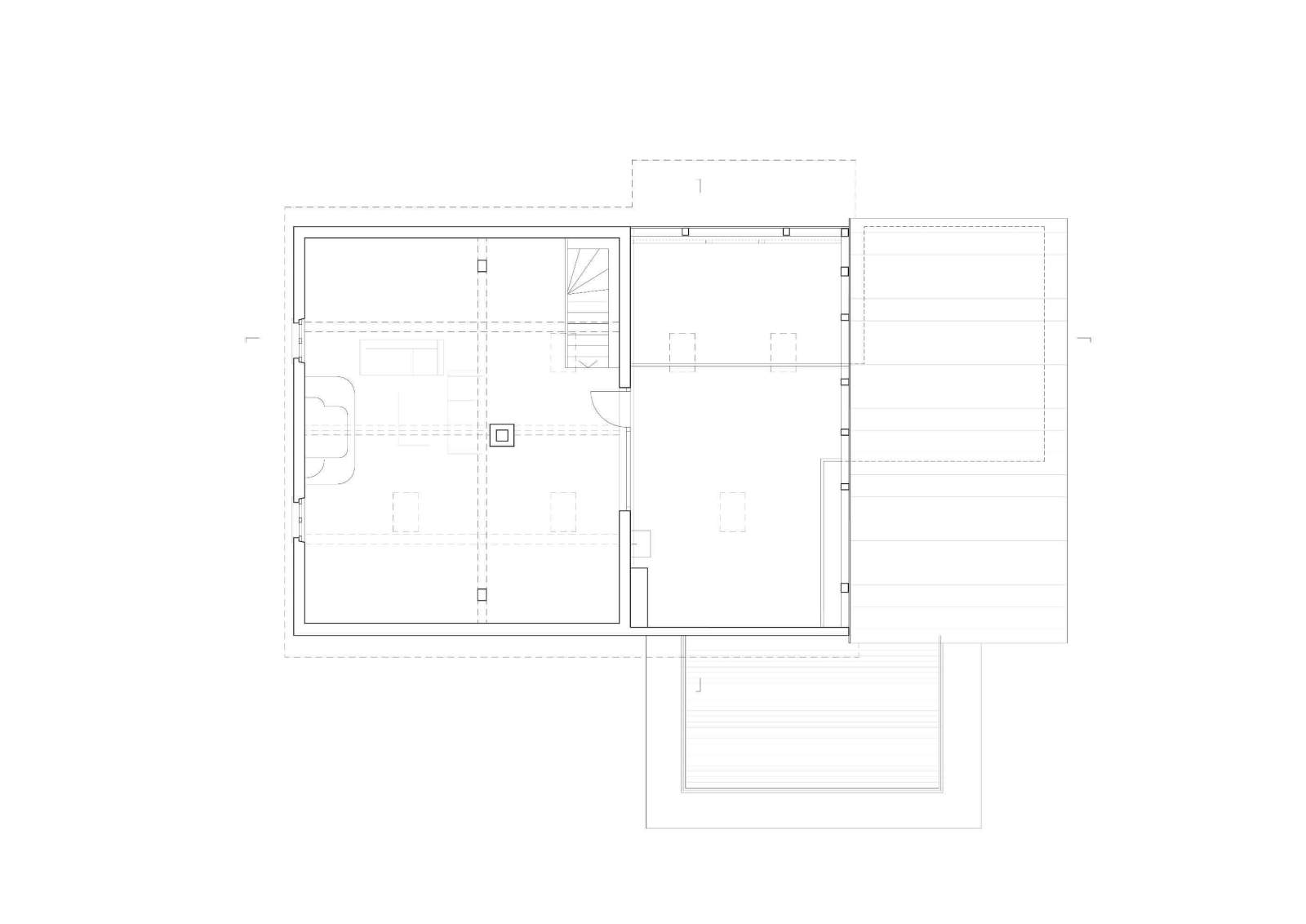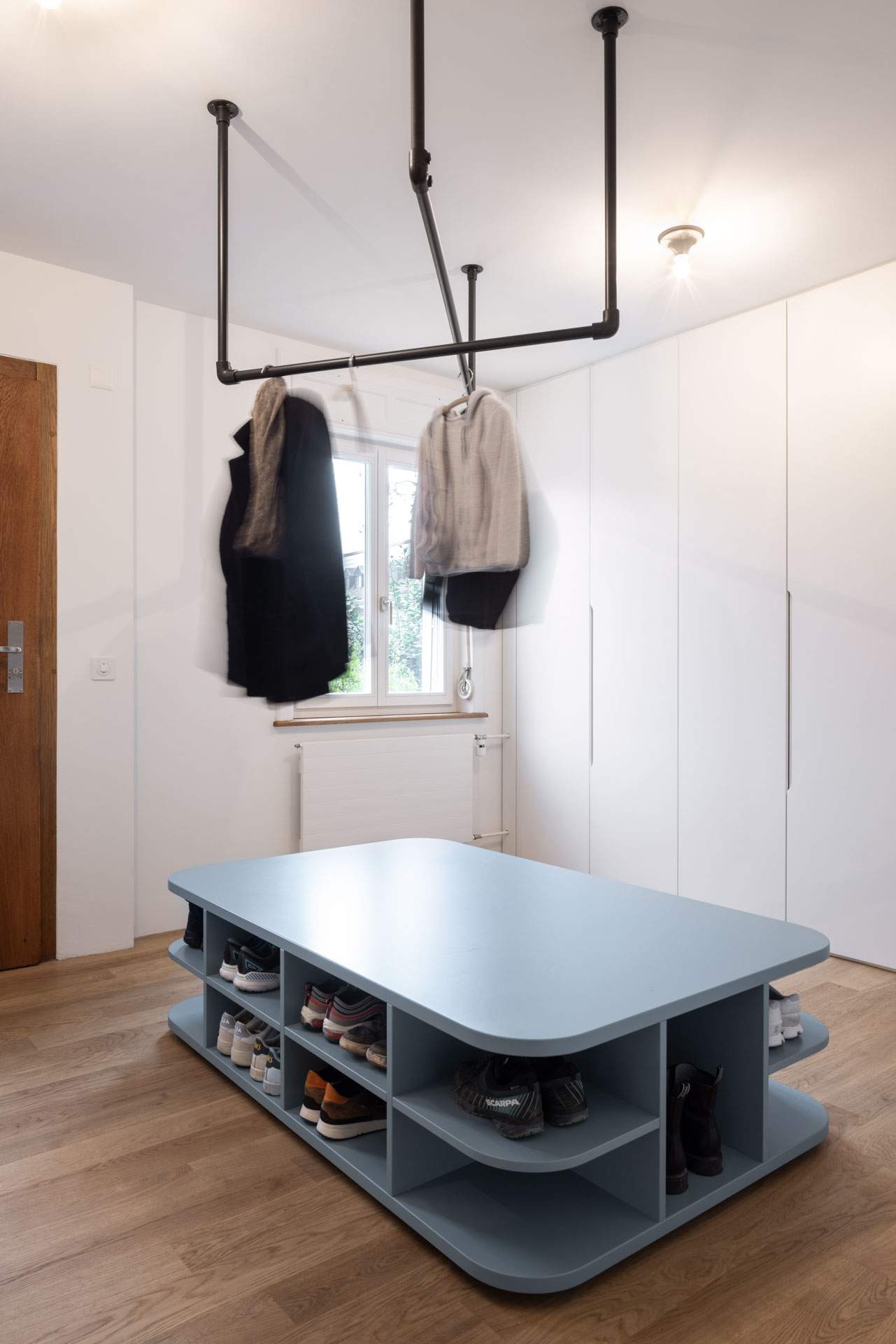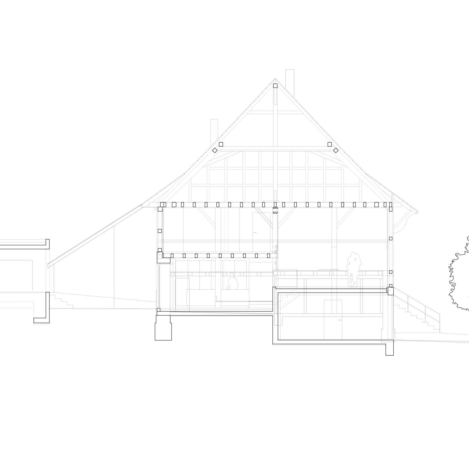 Die grössten Eingriffe erfährt das 1. Obergeschoss. Zugunsten einer grosszügigen Raumwirkung wird die Grundrissstruktur maximal aufgelöst und notwendige Wandabschnitte in raumbildende Körper integriert. Diese gliedern Küche, Wohn- und Arbeitsbereich. Das 2. Obergeschoss mit den Schlafräumen bleibt kleinteilig und erfährt bis auf die Öffnung zum Treppenraum kaum substantielle Eingriffe. Der ehemalige Estrich erhält zwei neue Dachfester und bietet den Kindern eine erweiterte Spielfläche. Um das ursprüngliche Fassadenbild zu erhalten, wurde lediglich das Dach saniert und alle Fenster ersetzt. Eine Photovoltaikanlage auf der südlichen Dachfläche ergänzt das energetische Konzept. Die haustechnischen Anlagen wurden modernisiert.