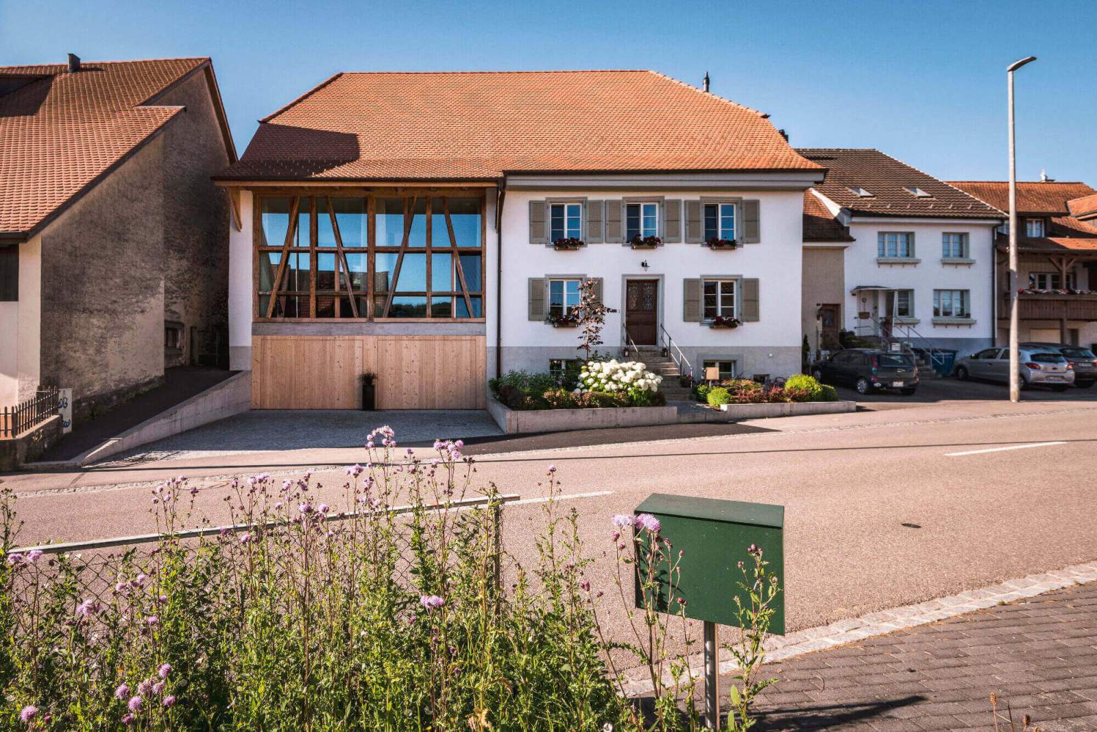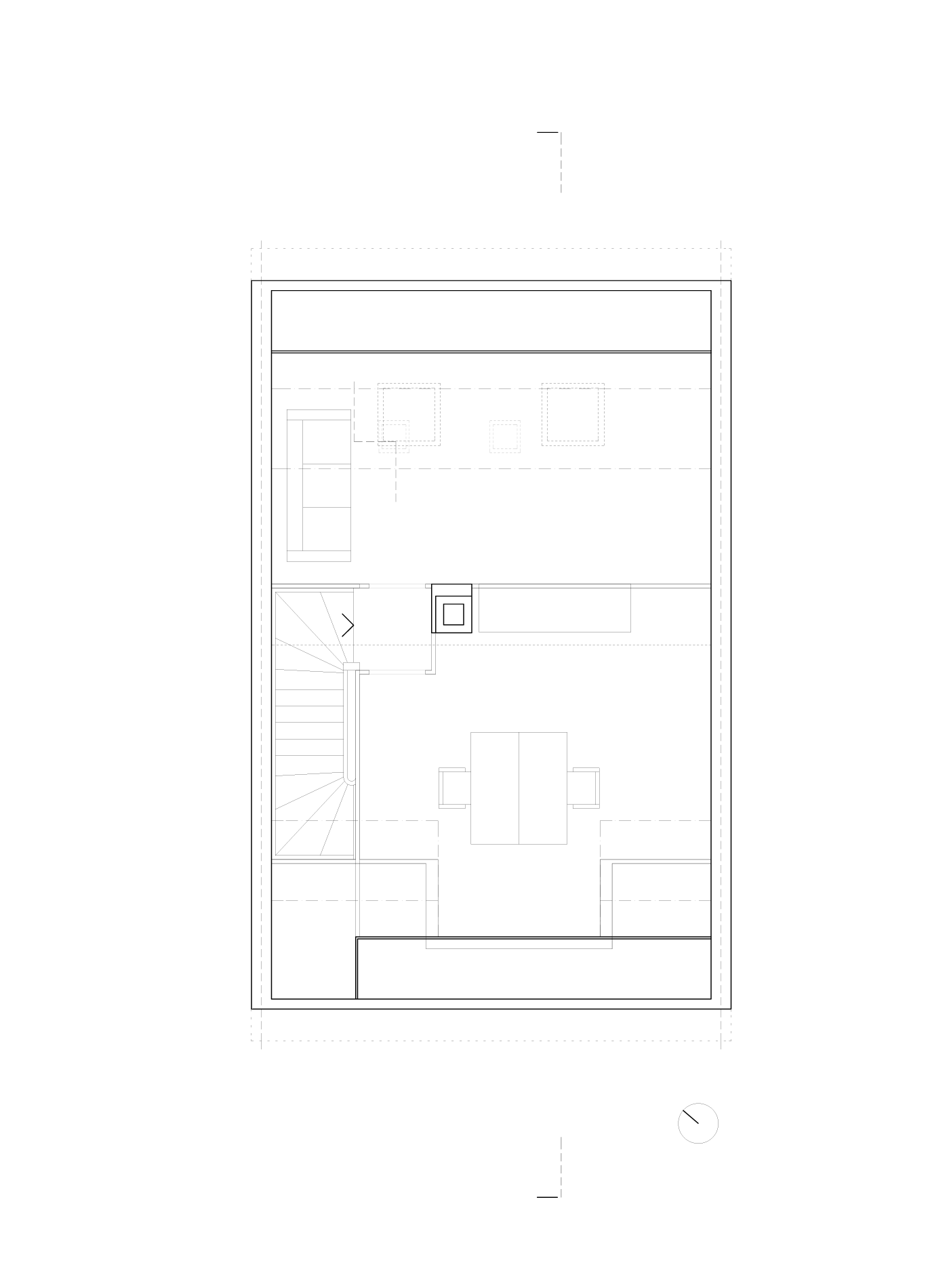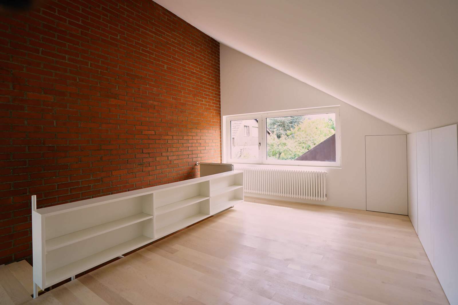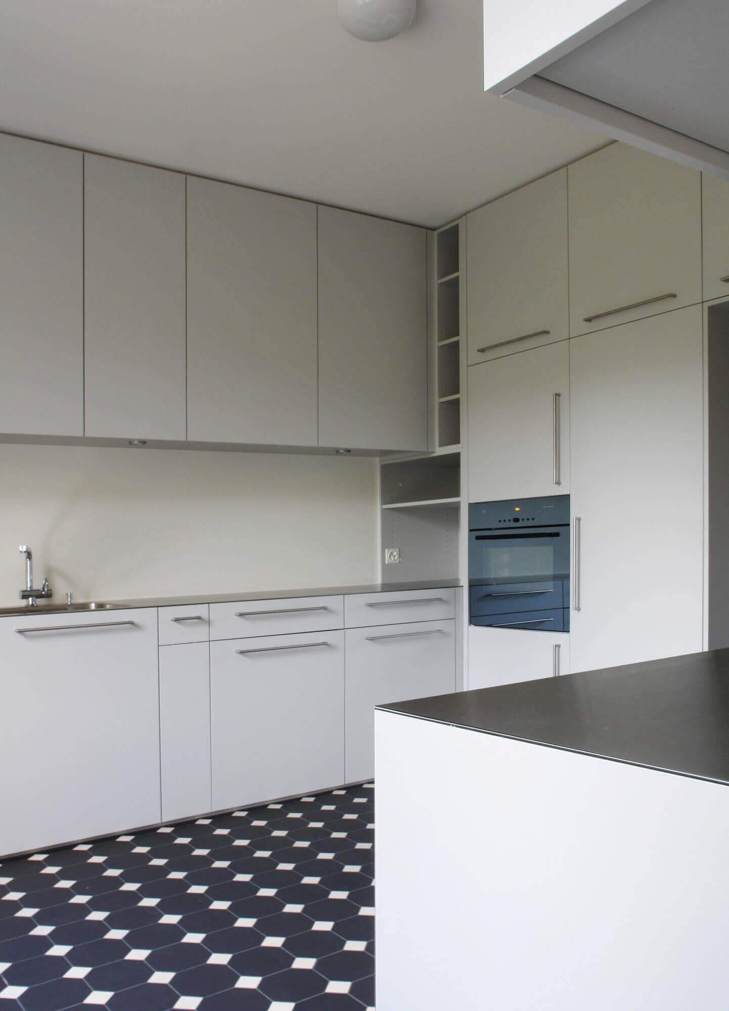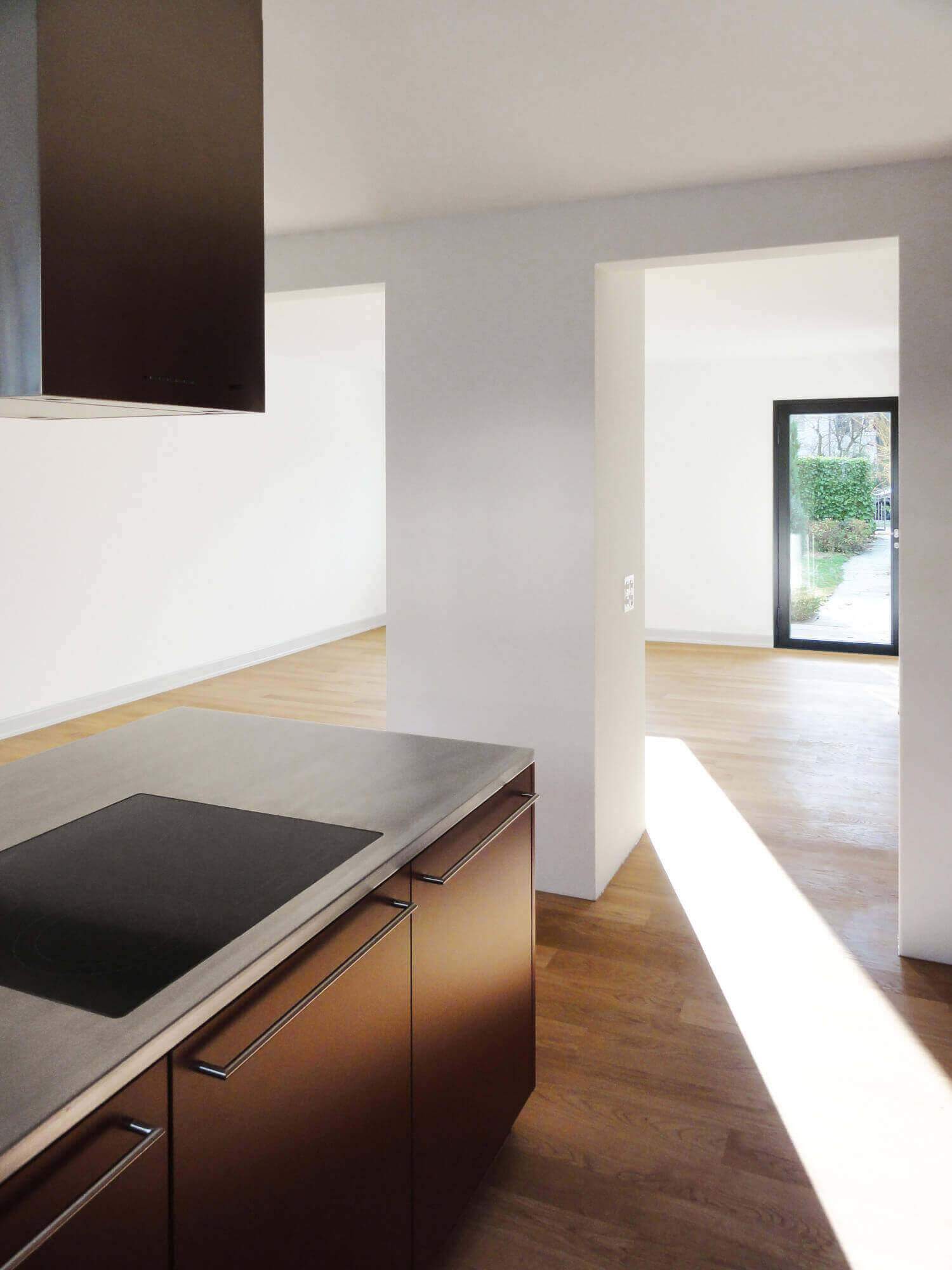 Die grössten Eingriffe erfährt das 1. Obergeschoss. Zugunsten einer grosszügigen Raumwirkung wird die Grundrissstruktur maximal aufgelöst und notwendige Wandabschnitte in raumbildende Körper integriert. Diese gliedern Küche, Wohn- und Arbeitsbereich. Das 2. Obergeschoss mit den Schlafräumen bleibt kleinteilig und erfährt bis auf die Öffnung zum Treppenraum kaum substantielle Eingriffe. Der ehemalige Estrich erhält zwei neue Dachfester und bietet den Kindern eine erweiterte Spielfläche. Um das ursprüngliche Fassadenbild zu erhalten, wurde lediglich das Dach saniert und alle Fenster ersetzt. Eine Photovoltaikanlage auf der südlichen Dachfläche ergänzt das energetische Konzept. Die haustechnischen Anlagen wurden modernisiert.