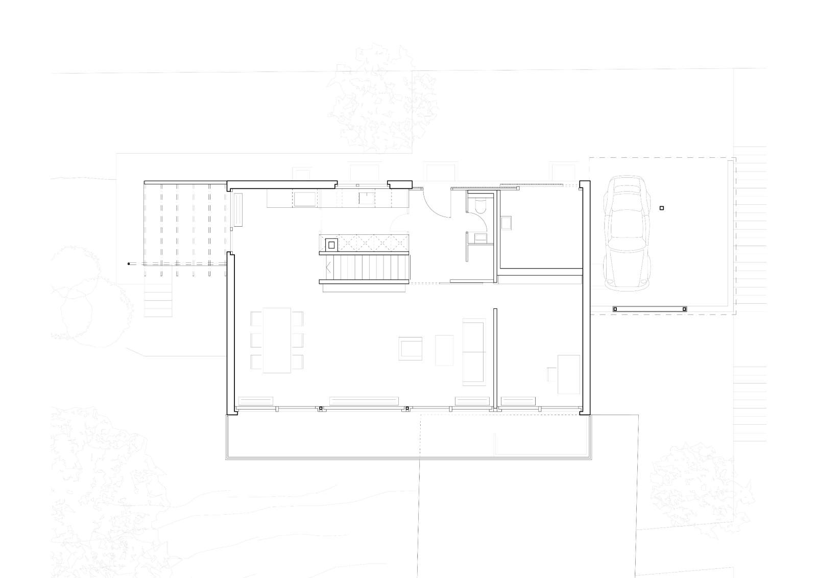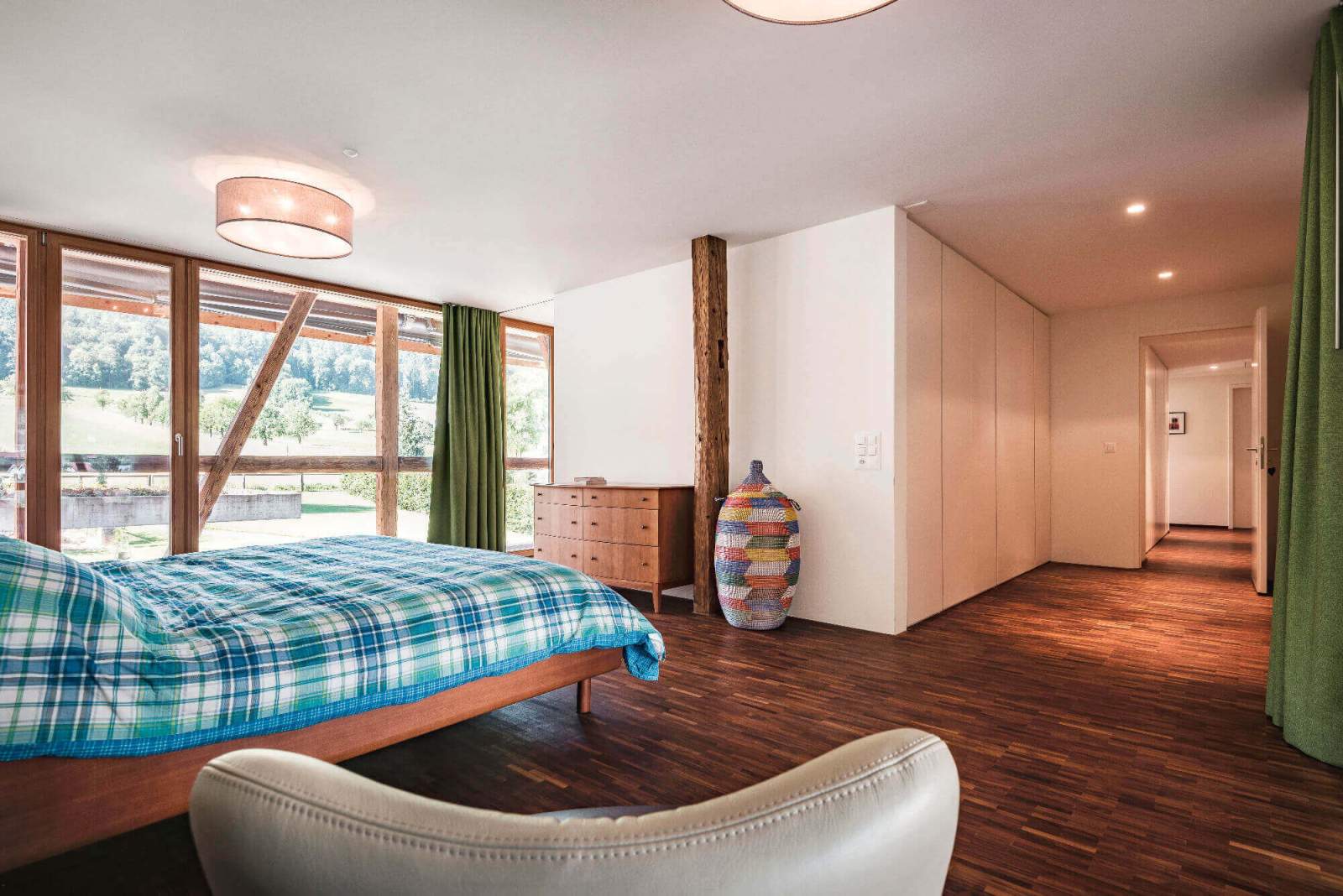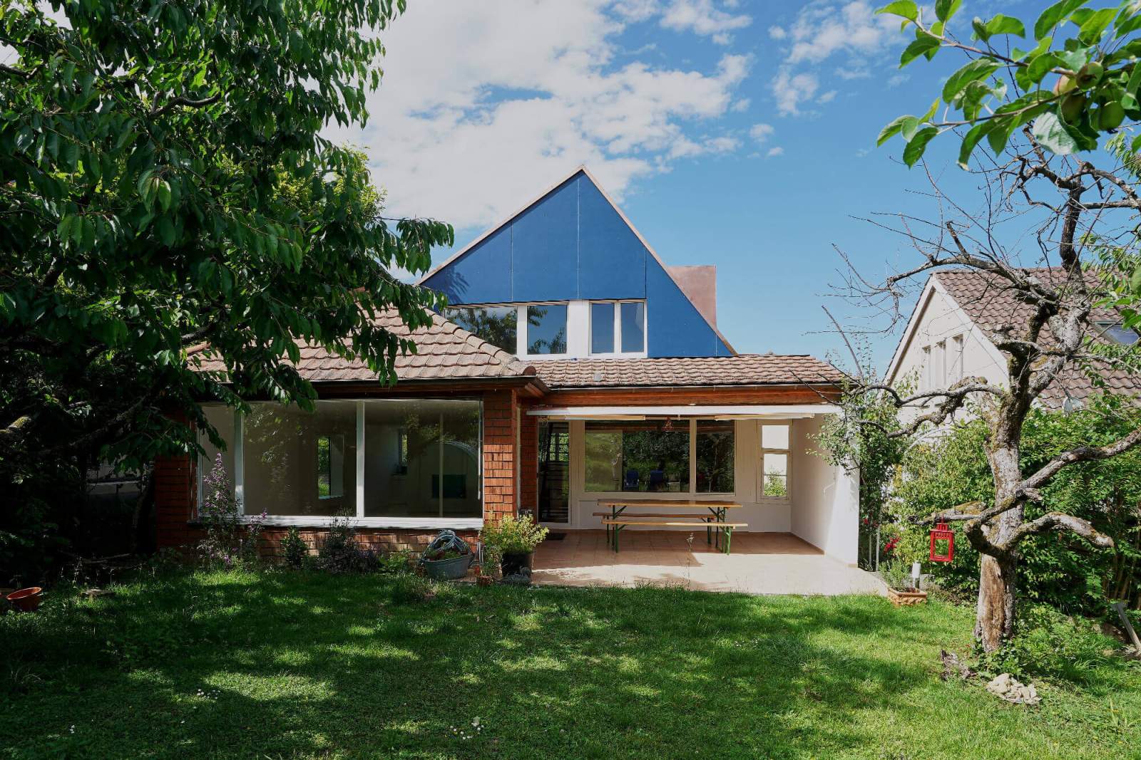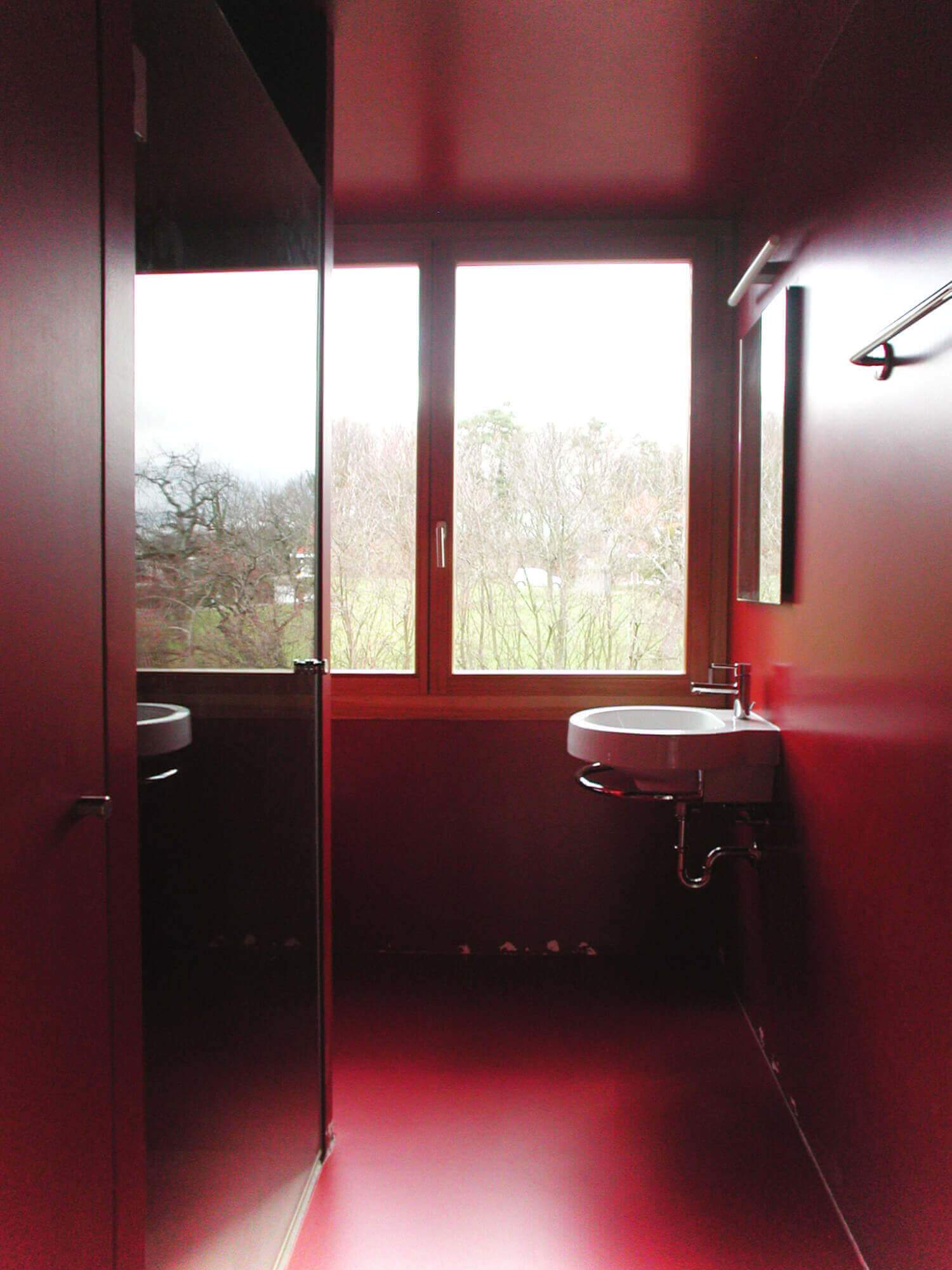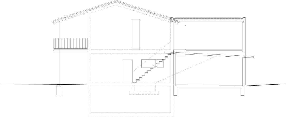 Die grössten Eingriffe erfährt das 1. Obergeschoss. Zugunsten einer grosszügigen Raumwirkung wird die Grundrissstruktur maximal aufgelöst und notwendige Wandabschnitte in raumbildende Körper integriert. Diese gliedern Küche, Wohn- und Arbeitsbereich. Das 2. Obergeschoss mit den Schlafräumen bleibt kleinteilig und erfährt bis auf die Öffnung zum Treppenraum kaum substantielle Eingriffe. Der ehemalige Estrich erhält zwei neue Dachfester und bietet den Kindern eine erweiterte Spielfläche. Um das ursprüngliche Fassadenbild zu erhalten, wurde lediglich das Dach saniert und alle Fenster ersetzt. Eine Photovoltaikanlage auf der südlichen Dachfläche ergänzt das energetische Konzept. Die haustechnischen Anlagen wurden modernisiert.