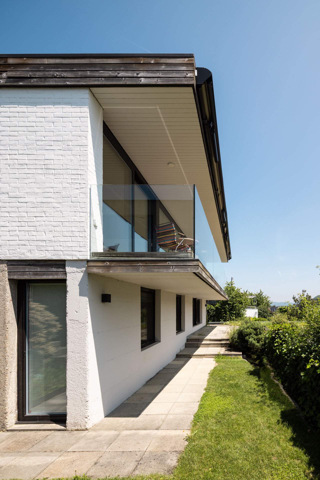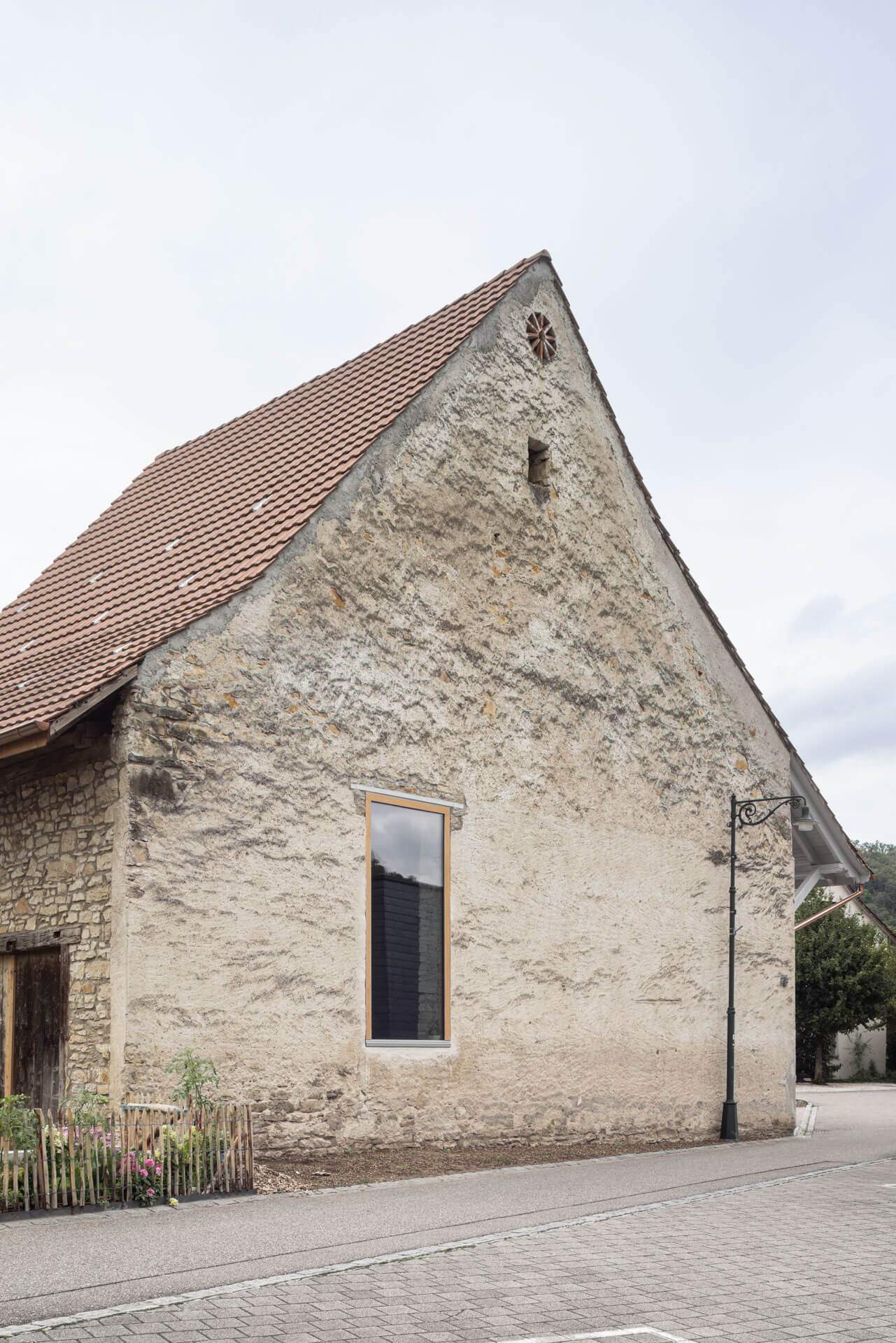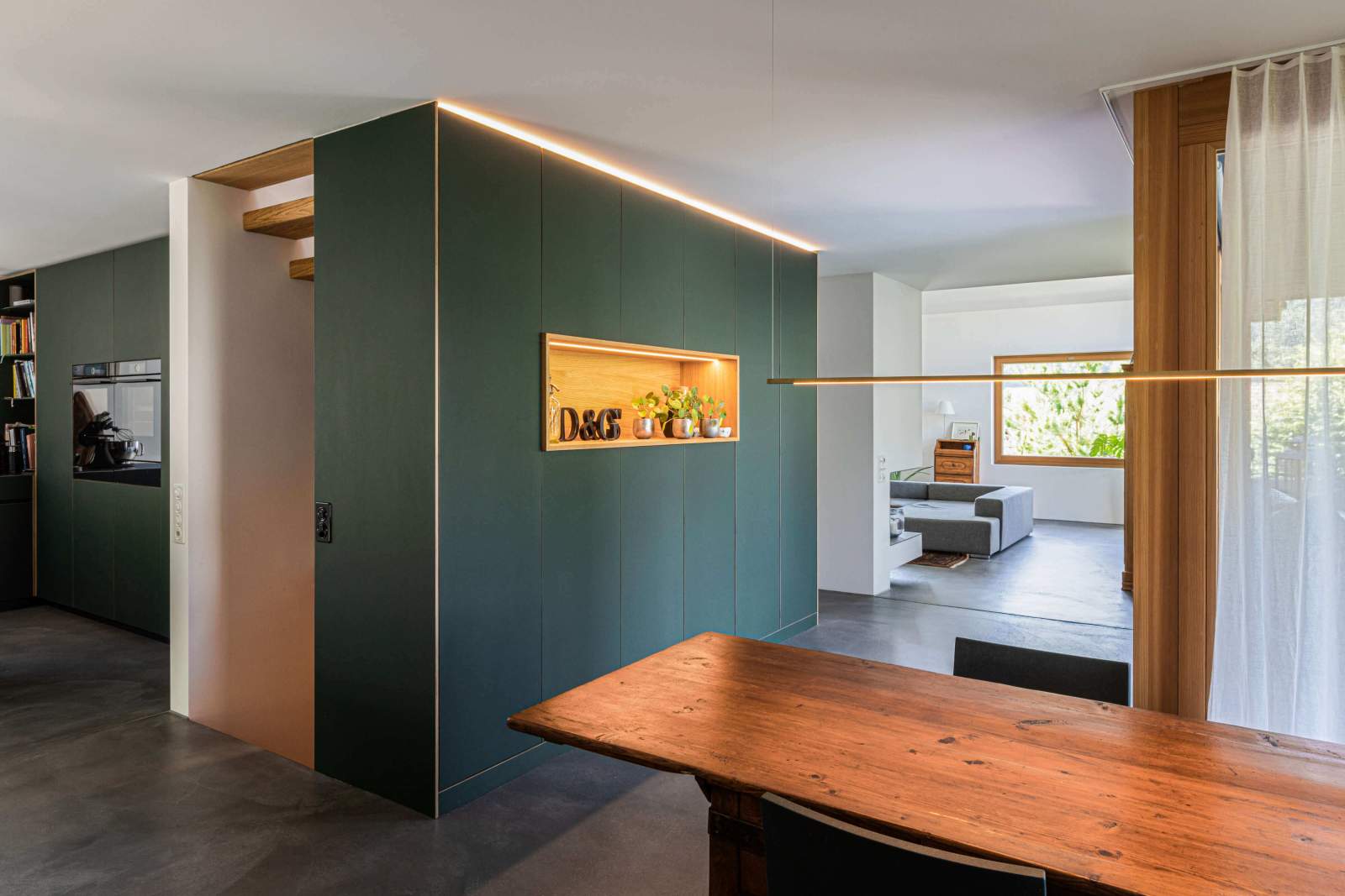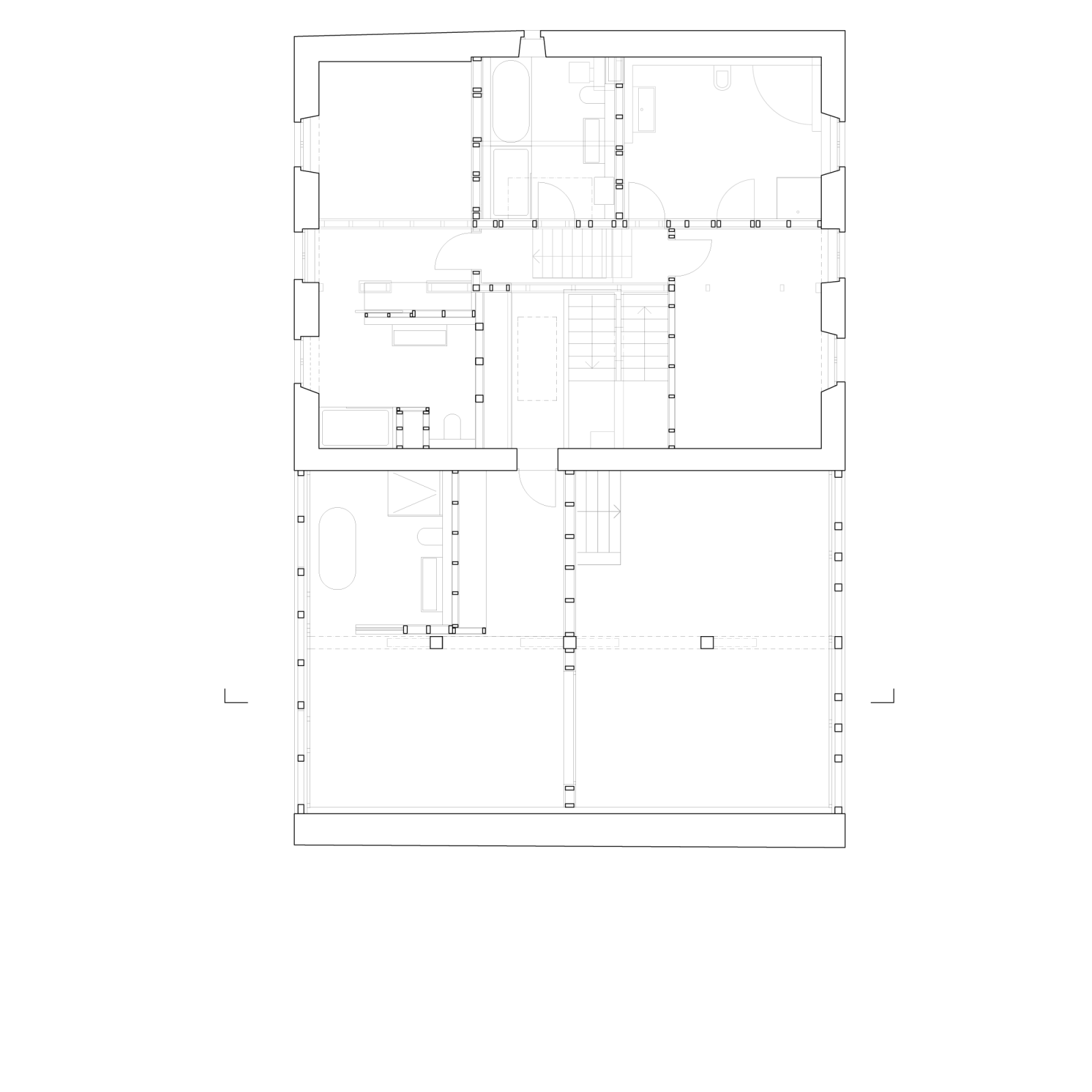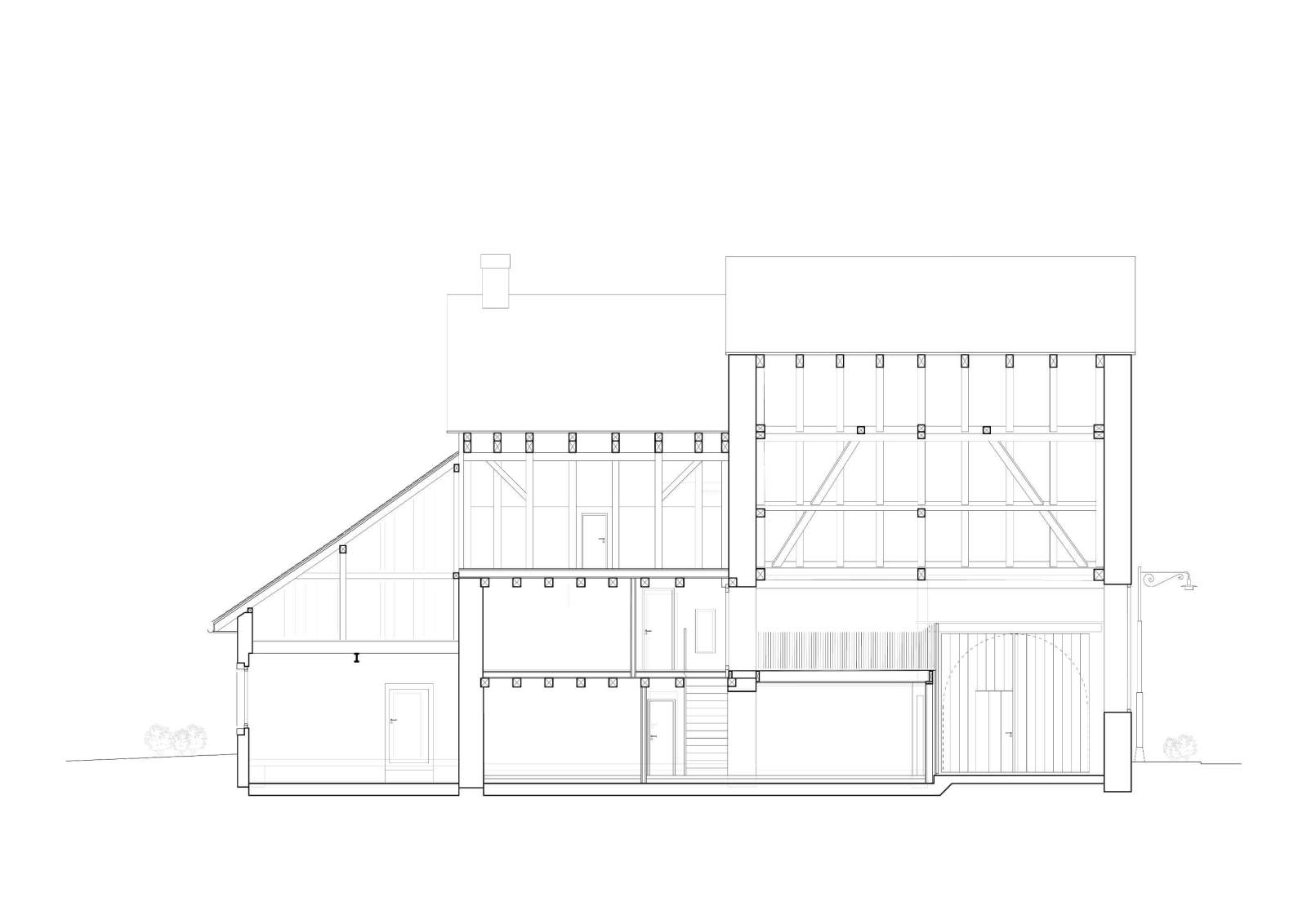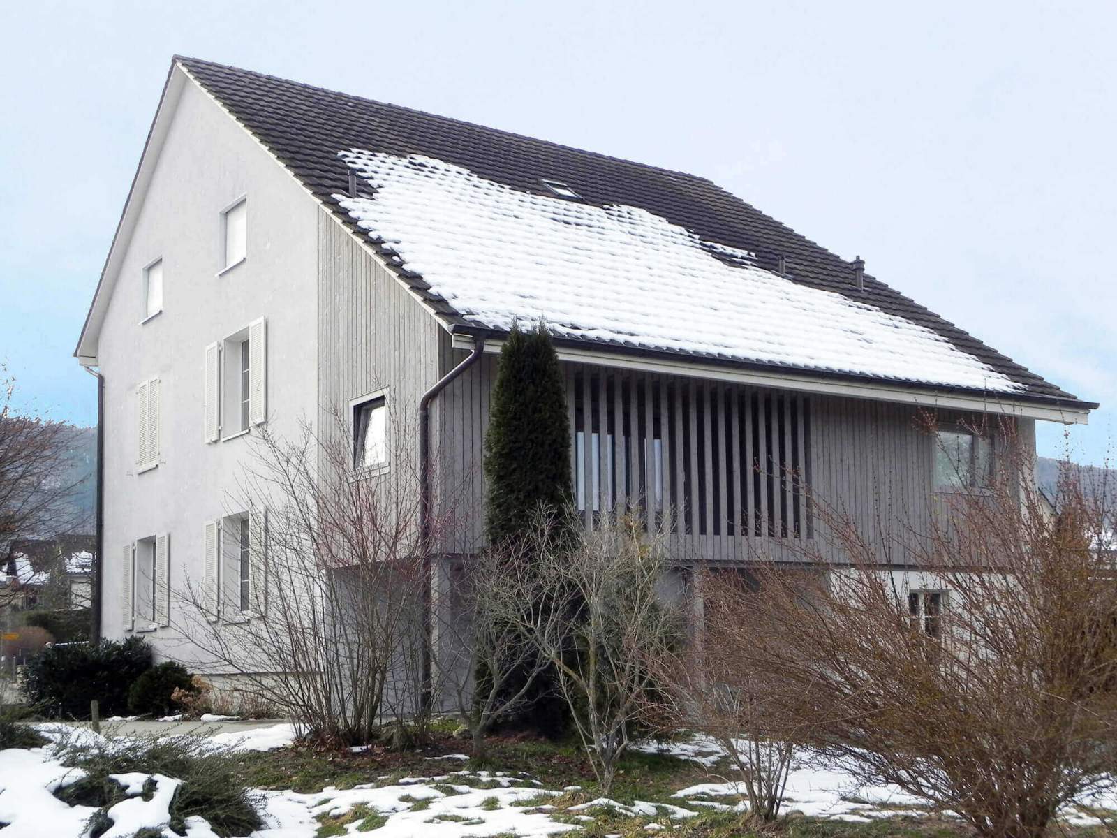 Die grössten Eingriffe erfährt das 1. Obergeschoss. Zugunsten einer grosszügigen Raumwirkung wird die Grundrissstruktur maximal aufgelöst und notwendige Wandabschnitte in raumbildende Körper integriert. Diese gliedern Küche, Wohn- und Arbeitsbereich. Das 2. Obergeschoss mit den Schlafräumen bleibt kleinteilig und erfährt bis auf die Öffnung zum Treppenraum kaum substantielle Eingriffe. Der ehemalige Estrich erhält zwei neue Dachfester und bietet den Kindern eine erweiterte Spielfläche. Um das ursprüngliche Fassadenbild zu erhalten, wurde lediglich das Dach saniert und alle Fenster ersetzt. Eine Photovoltaikanlage auf der südlichen Dachfläche ergänzt das energetische Konzept. Die haustechnischen Anlagen wurden modernisiert.