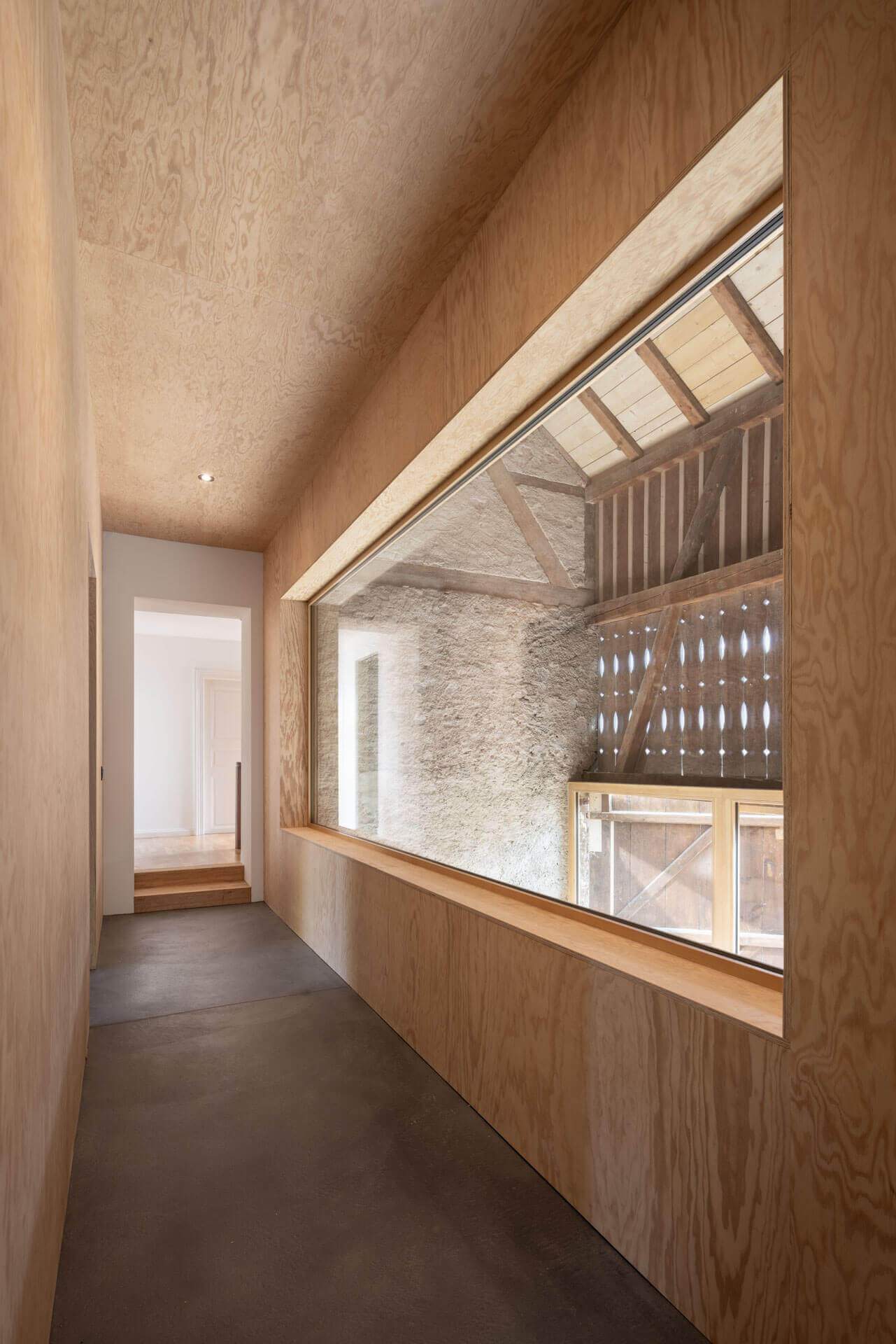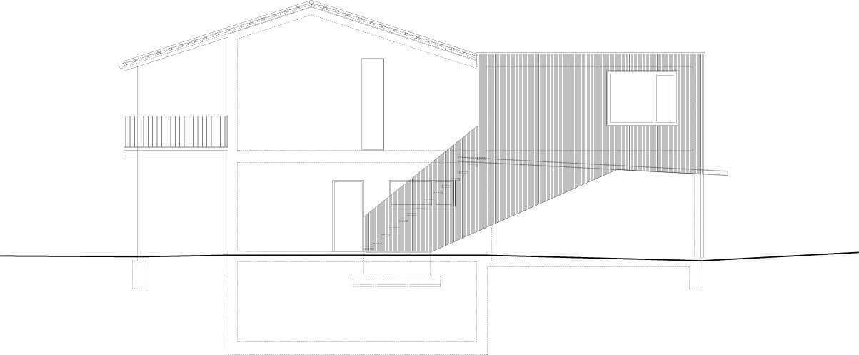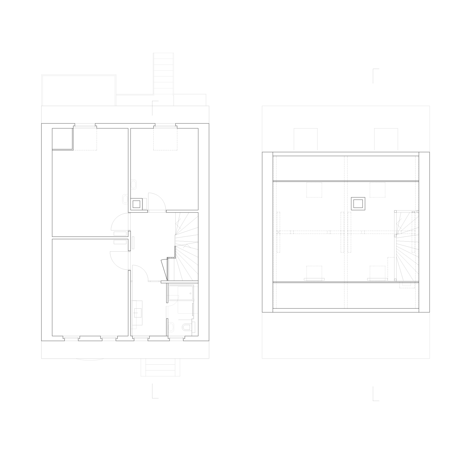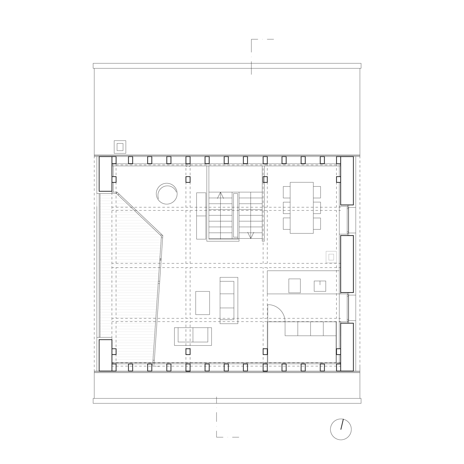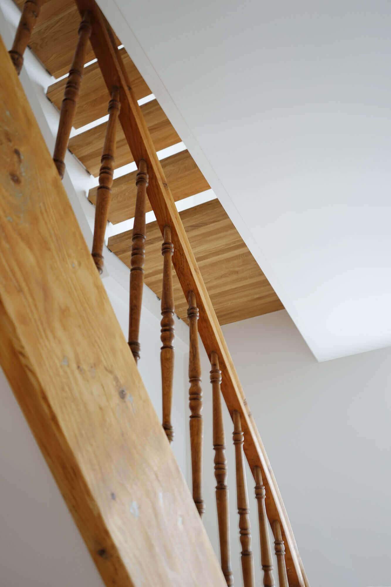 Die grössten Eingriffe erfährt das 1. Obergeschoss. Zugunsten einer grosszügigen Raumwirkung wird die Grundrissstruktur maximal aufgelöst und notwendige Wandabschnitte in raumbildende Körper integriert. Diese gliedern Küche, Wohn- und Arbeitsbereich. Das 2. Obergeschoss mit den Schlafräumen bleibt kleinteilig und erfährt bis auf die Öffnung zum Treppenraum kaum substantielle Eingriffe. Der ehemalige Estrich erhält zwei neue Dachfester und bietet den Kindern eine erweiterte Spielfläche. Um das ursprüngliche Fassadenbild zu erhalten, wurde lediglich das Dach saniert und alle Fenster ersetzt. Eine Photovoltaikanlage auf der südlichen Dachfläche ergänzt das energetische Konzept. Die haustechnischen Anlagen wurden modernisiert.