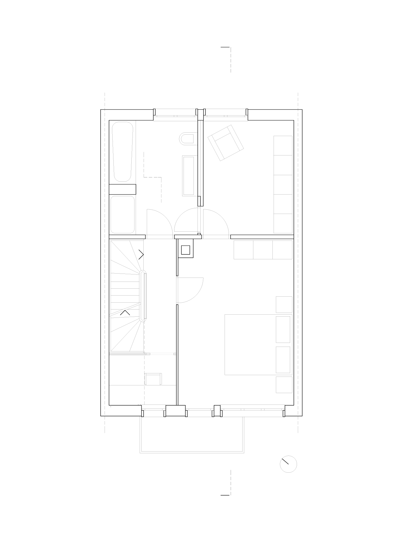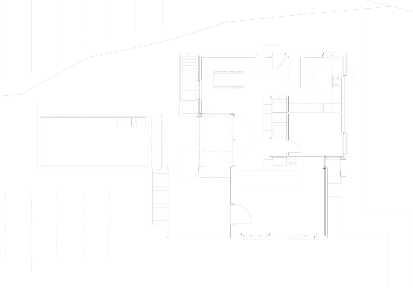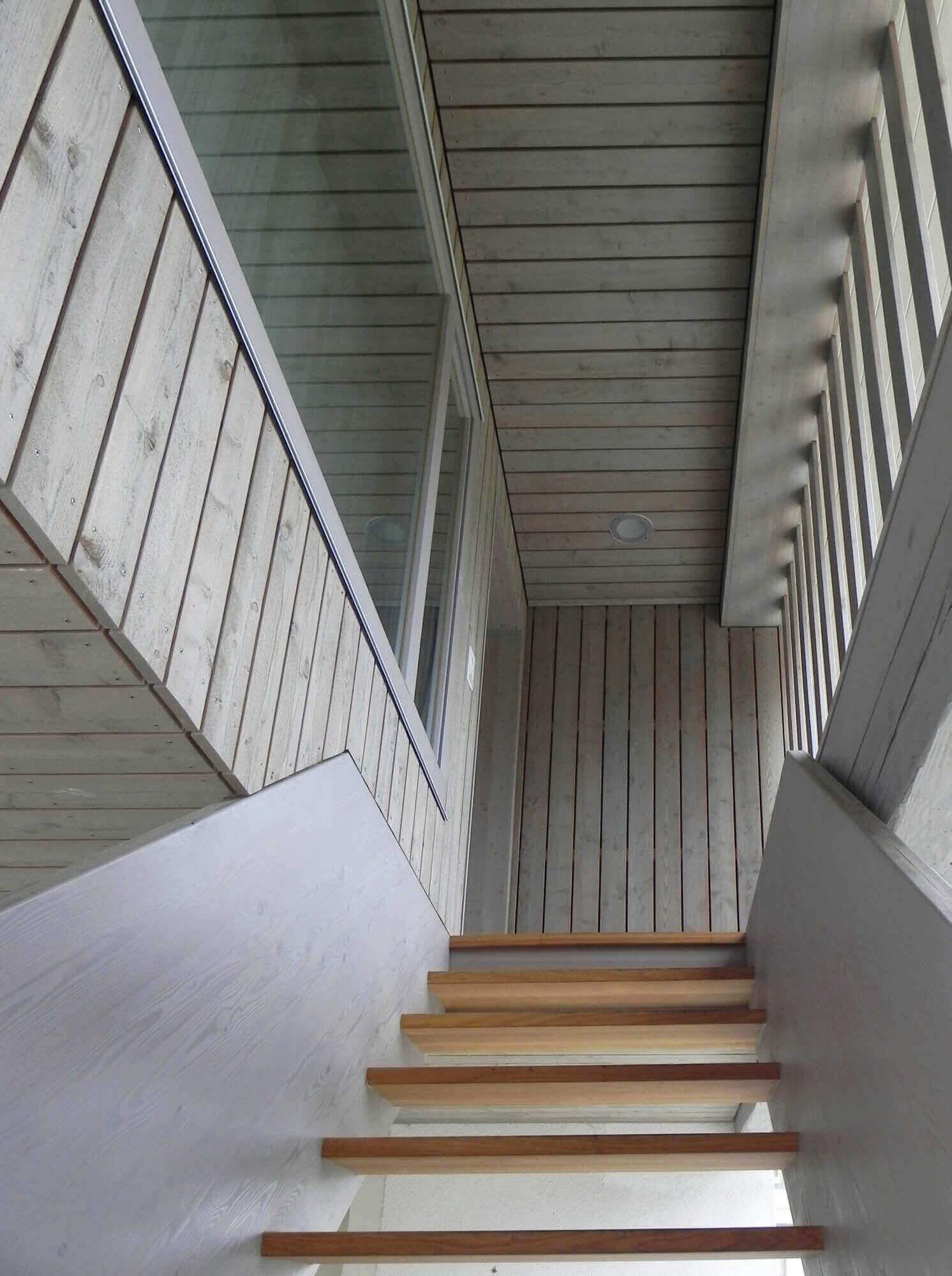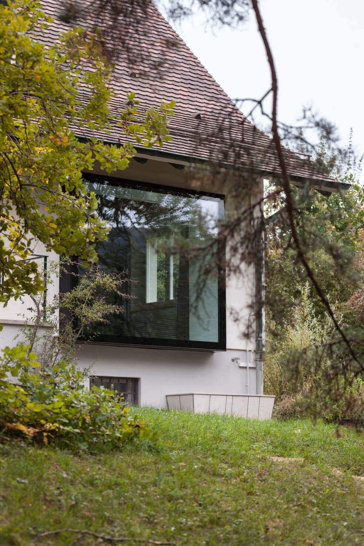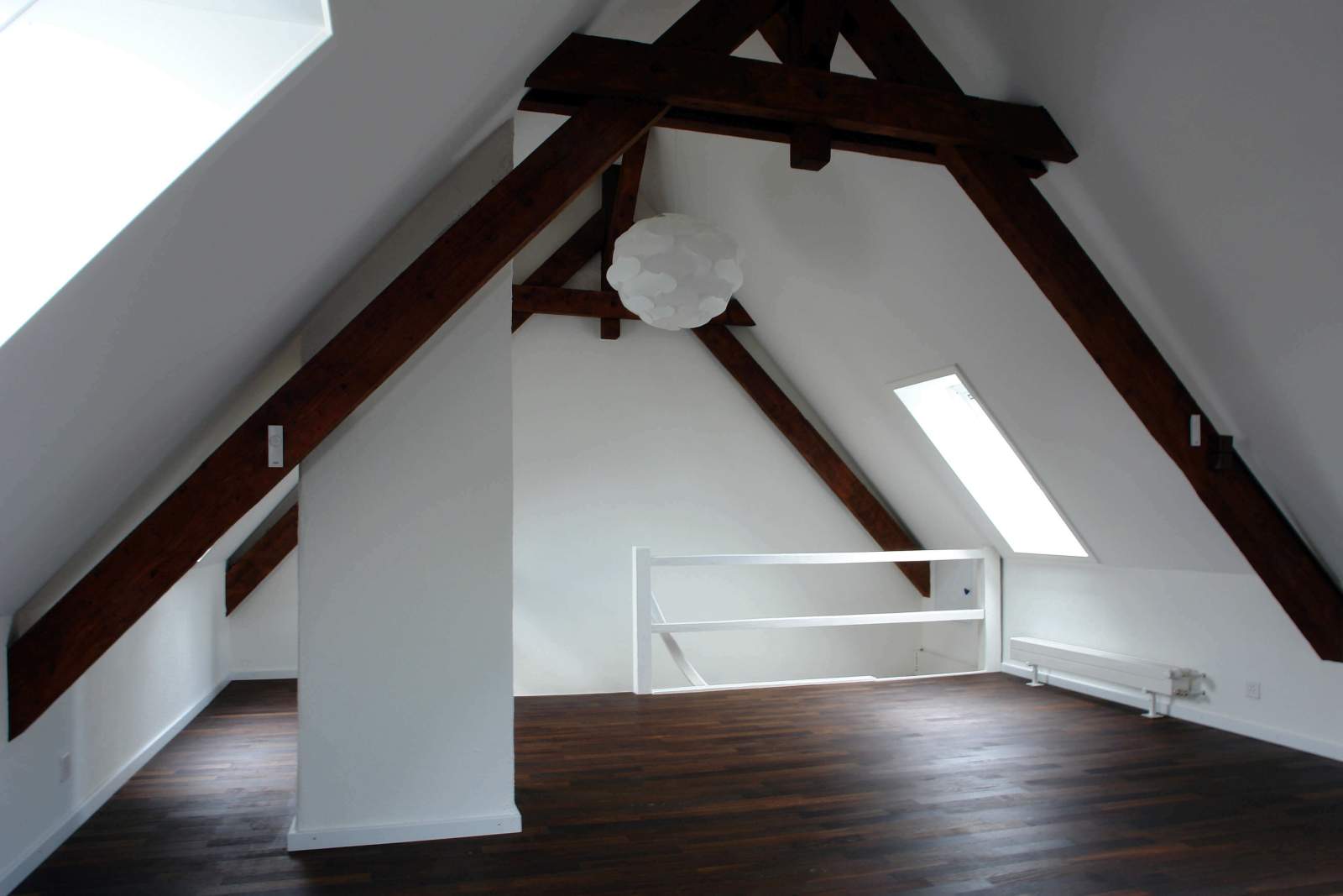 Die grössten Eingriffe erfährt das 1. Obergeschoss. Zugunsten einer grosszügigen Raumwirkung wird die Grundrissstruktur maximal aufgelöst und notwendige Wandabschnitte in raumbildende Körper integriert. Diese gliedern Küche, Wohn- und Arbeitsbereich. Das 2. Obergeschoss mit den Schlafräumen bleibt kleinteilig und erfährt bis auf die Öffnung zum Treppenraum kaum substantielle Eingriffe. Der ehemalige Estrich erhält zwei neue Dachfester und bietet den Kindern eine erweiterte Spielfläche. Um das ursprüngliche Fassadenbild zu erhalten, wurde lediglich das Dach saniert und alle Fenster ersetzt. Eine Photovoltaikanlage auf der südlichen Dachfläche ergänzt das energetische Konzept. Die haustechnischen Anlagen wurden modernisiert.