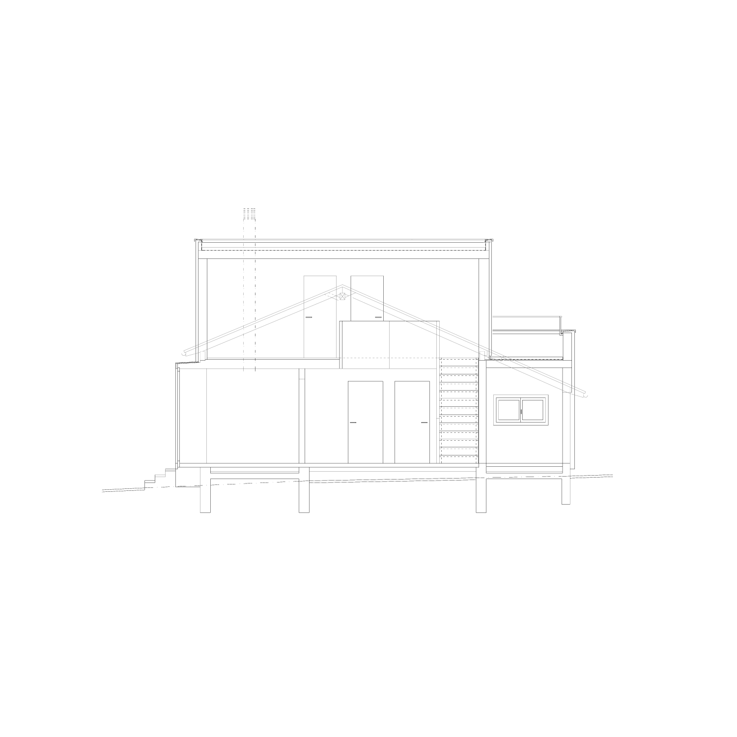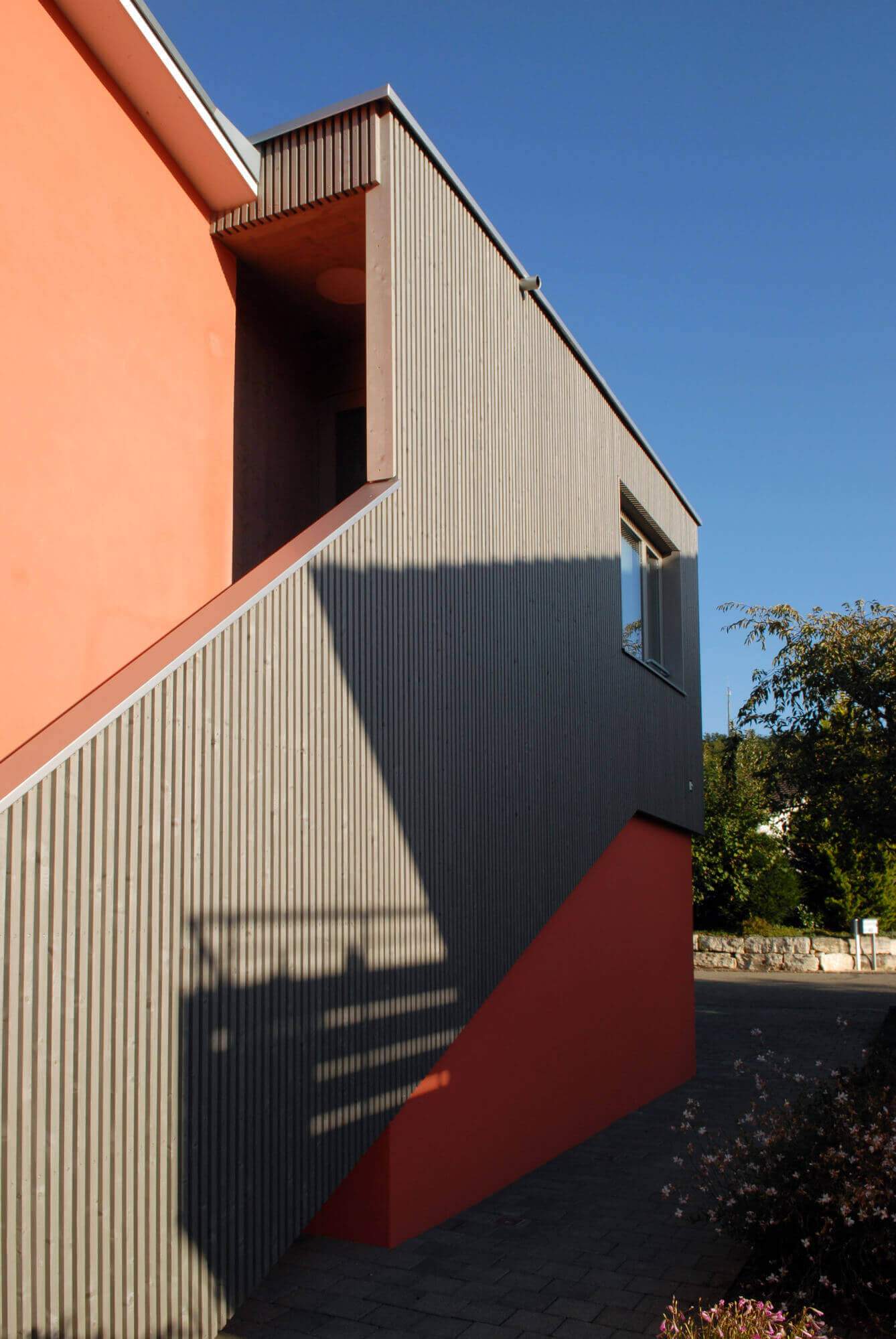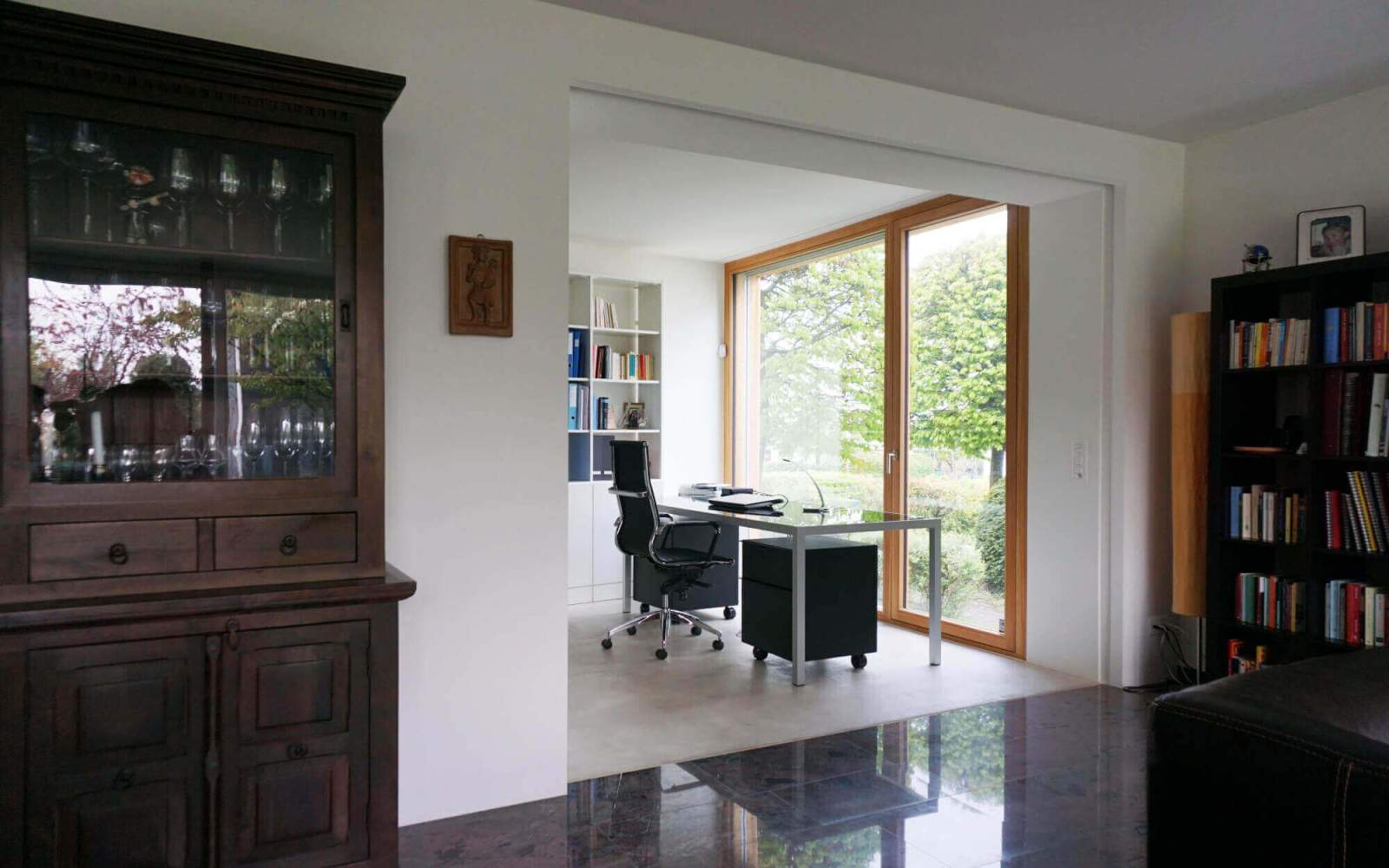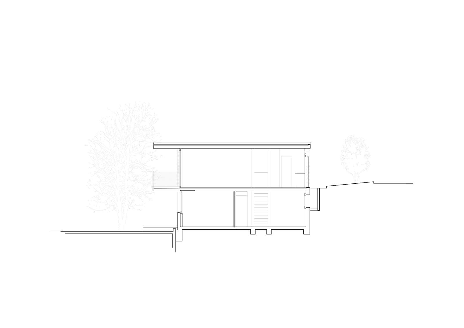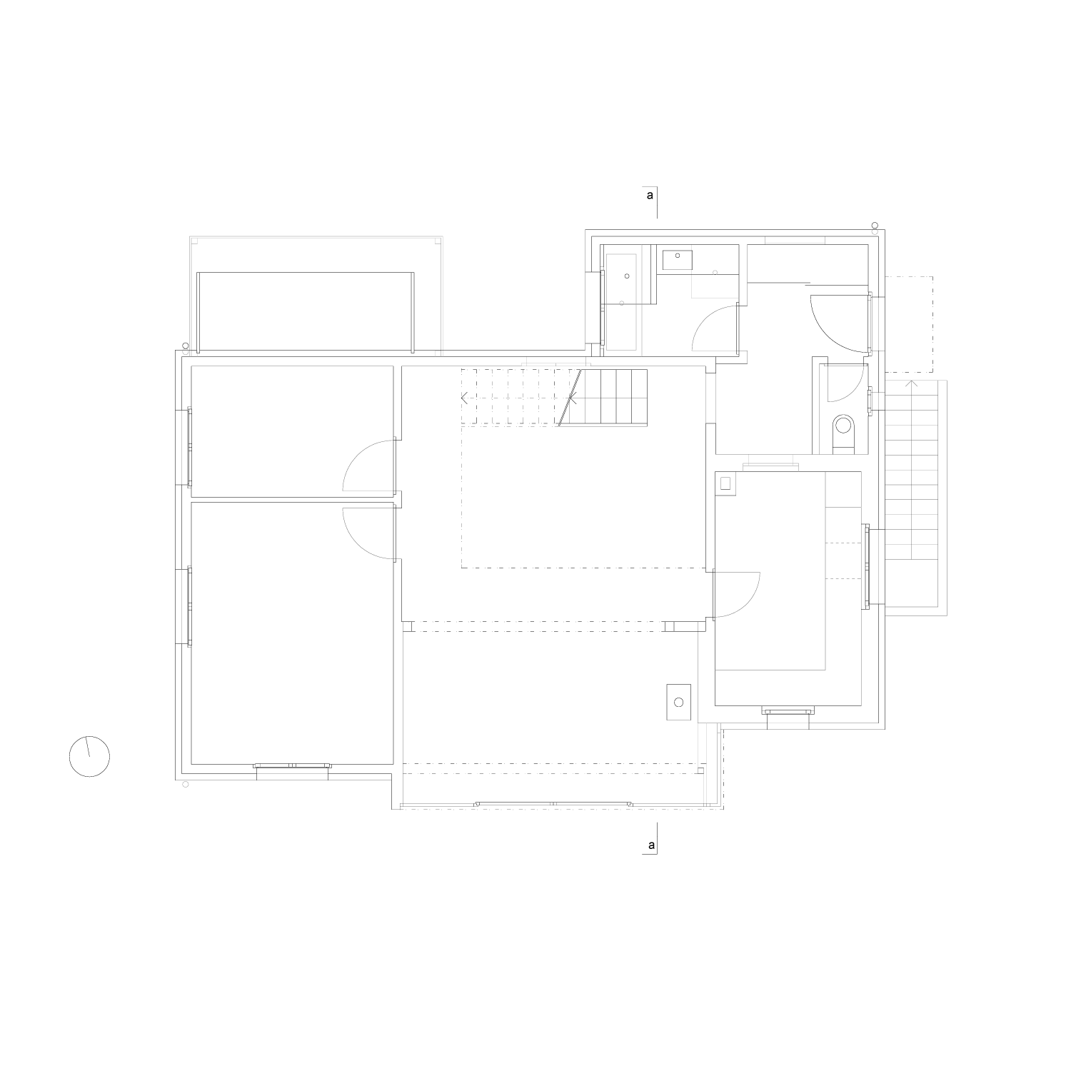 Die grössten Eingriffe erfährt das 1. Obergeschoss. Zugunsten einer grosszügigen Raumwirkung wird die Grundrissstruktur maximal aufgelöst und notwendige Wandabschnitte in raumbildende Körper integriert. Diese gliedern Küche, Wohn- und Arbeitsbereich. Das 2. Obergeschoss mit den Schlafräumen bleibt kleinteilig und erfährt bis auf die Öffnung zum Treppenraum kaum substantielle Eingriffe. Der ehemalige Estrich erhält zwei neue Dachfester und bietet den Kindern eine erweiterte Spielfläche. Um das ursprüngliche Fassadenbild zu erhalten, wurde lediglich das Dach saniert und alle Fenster ersetzt. Eine Photovoltaikanlage auf der südlichen Dachfläche ergänzt das energetische Konzept. Die haustechnischen Anlagen wurden modernisiert.