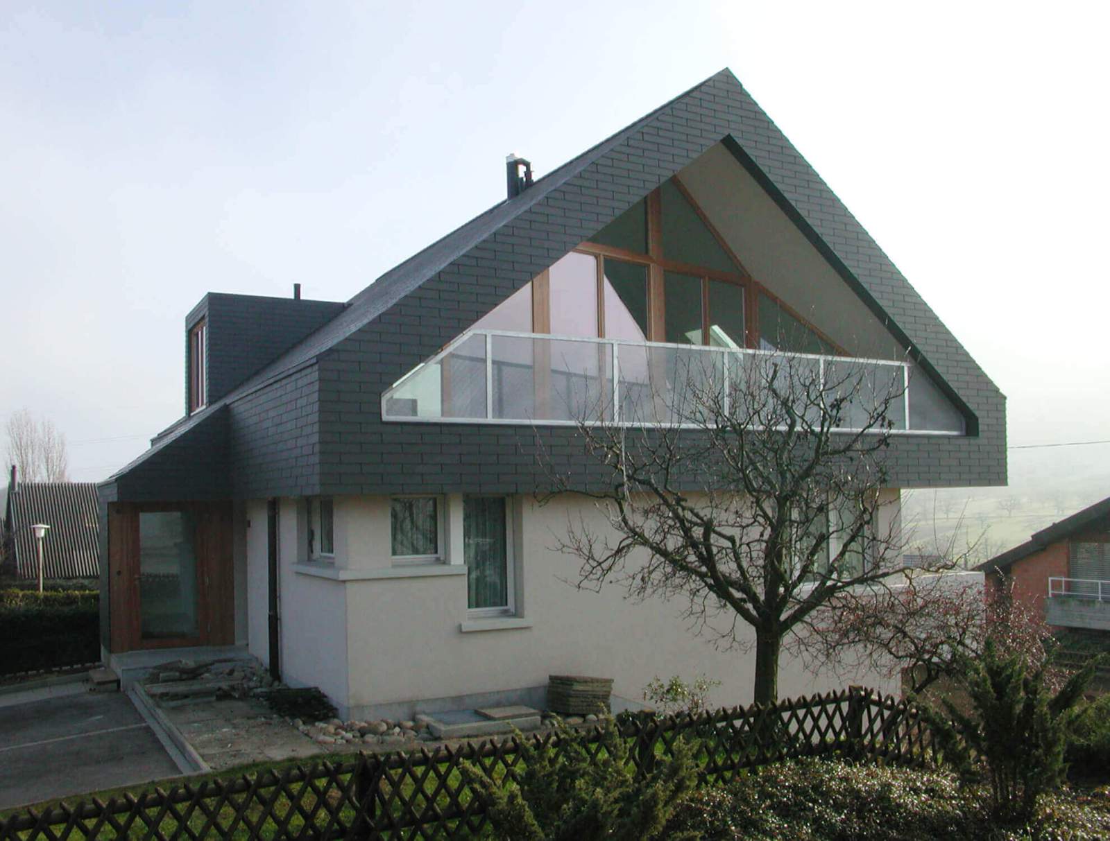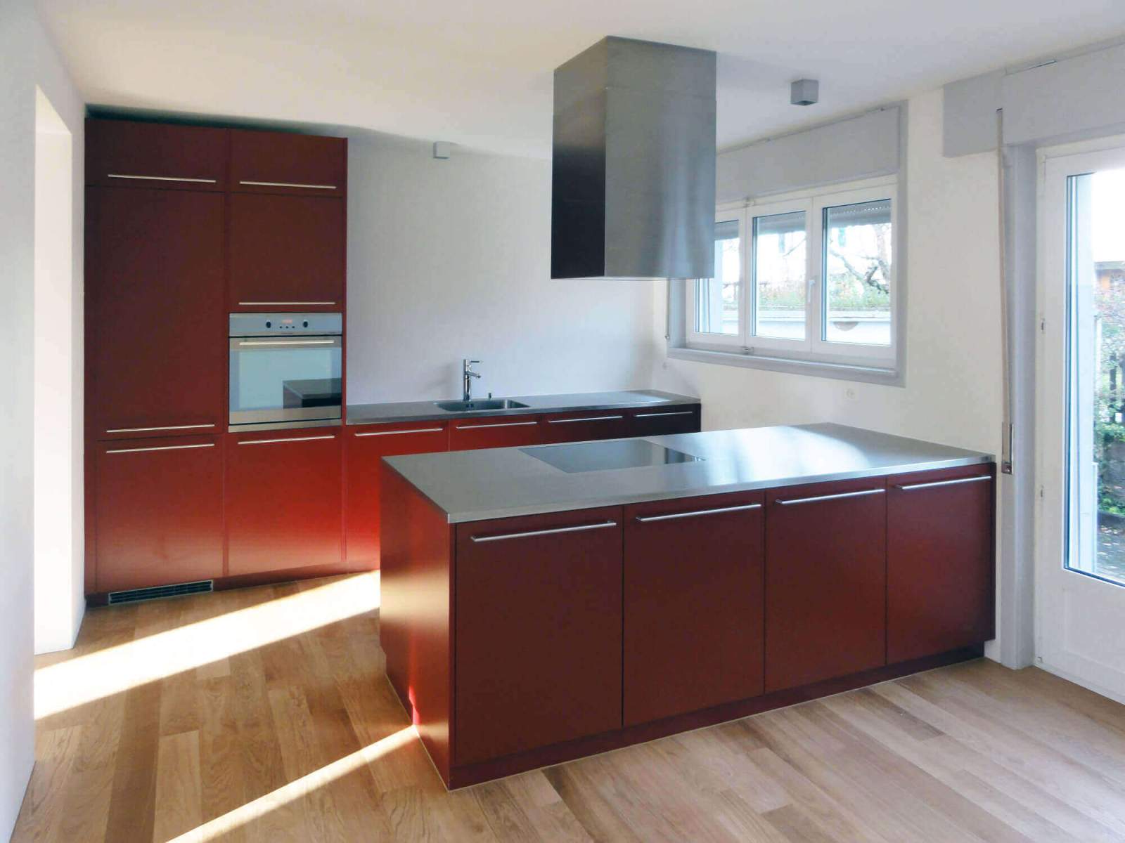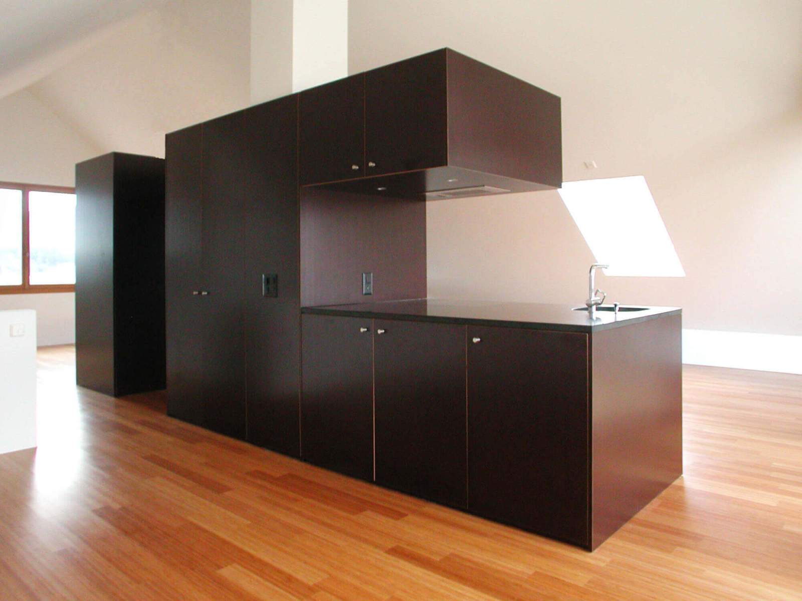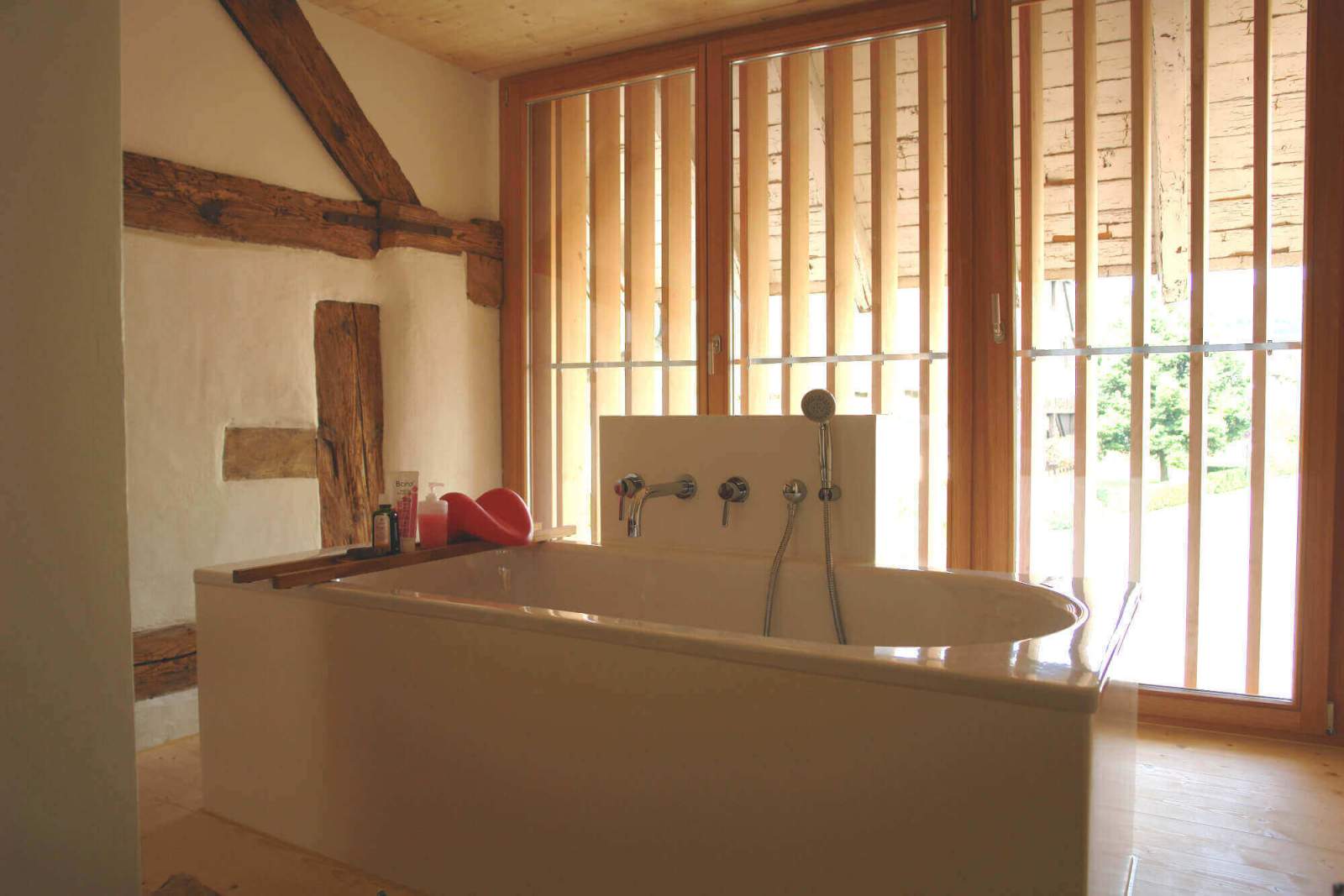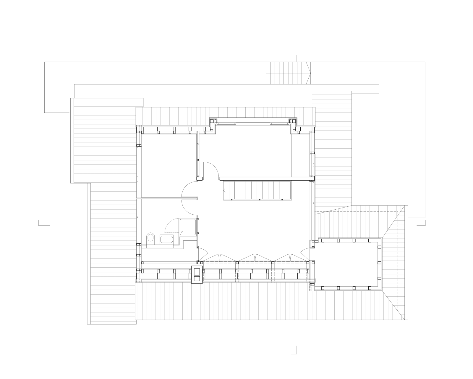 Die grössten Eingriffe erfährt das 1. Obergeschoss. Zugunsten einer grosszügigen Raumwirkung wird die Grundrissstruktur maximal aufgelöst und notwendige Wandabschnitte in raumbildende Körper integriert. Diese gliedern Küche, Wohn- und Arbeitsbereich. Das 2. Obergeschoss mit den Schlafräumen bleibt kleinteilig und erfährt bis auf die Öffnung zum Treppenraum kaum substantielle Eingriffe. Der ehemalige Estrich erhält zwei neue Dachfester und bietet den Kindern eine erweiterte Spielfläche. Um das ursprüngliche Fassadenbild zu erhalten, wurde lediglich das Dach saniert und alle Fenster ersetzt. Eine Photovoltaikanlage auf der südlichen Dachfläche ergänzt das energetische Konzept. Die haustechnischen Anlagen wurden modernisiert.