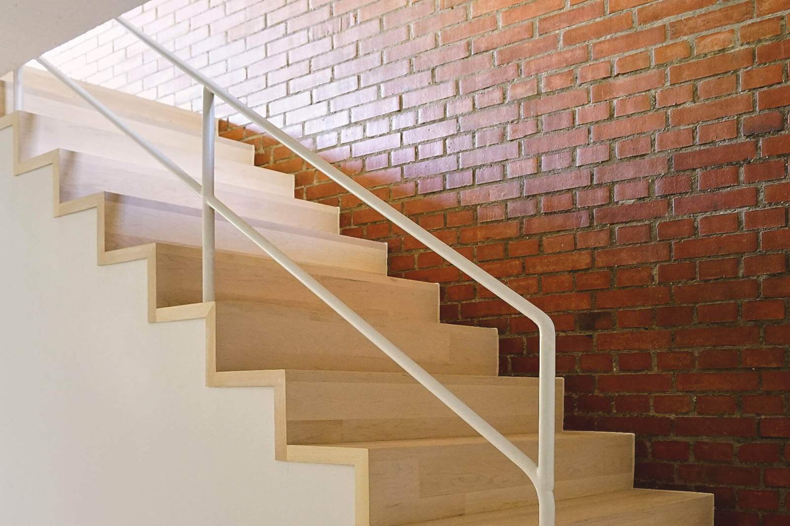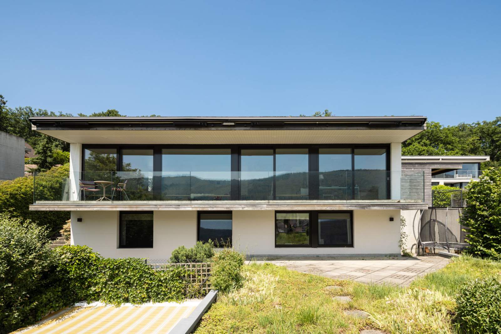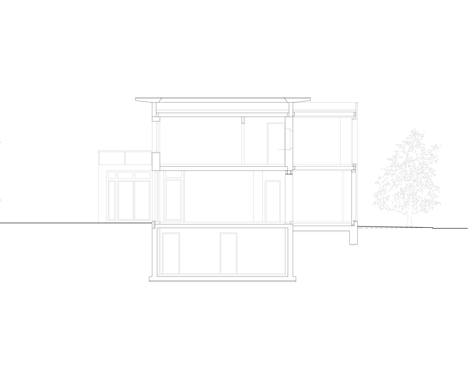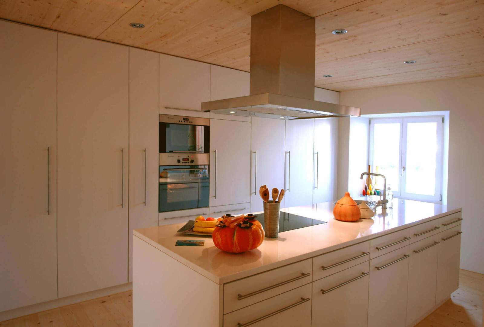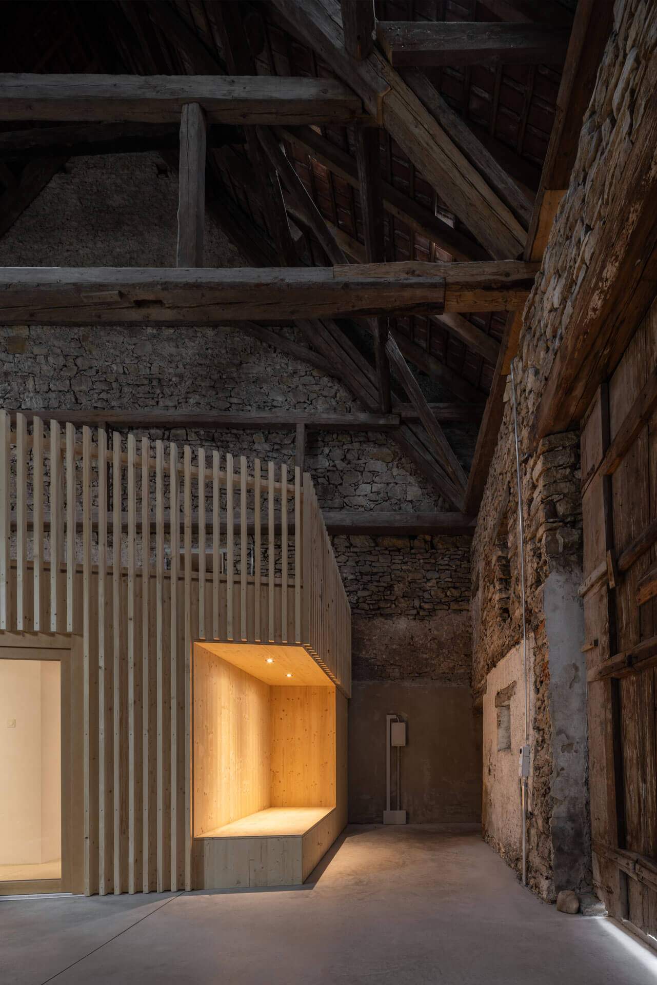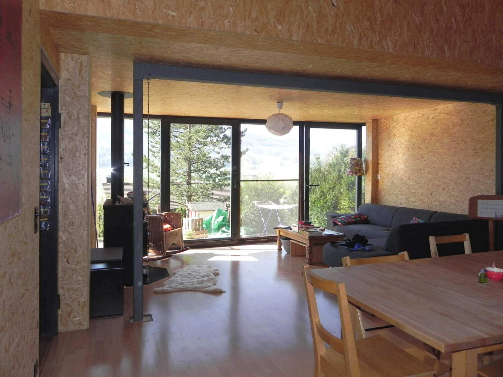 Die grössten Eingriffe erfährt das 1. Obergeschoss. Zugunsten einer grosszügigen Raumwirkung wird die Grundrissstruktur maximal aufgelöst und notwendige Wandabschnitte in raumbildende Körper integriert. Diese gliedern Küche, Wohn- und Arbeitsbereich. Das 2. Obergeschoss mit den Schlafräumen bleibt kleinteilig und erfährt bis auf die Öffnung zum Treppenraum kaum substantielle Eingriffe. Der ehemalige Estrich erhält zwei neue Dachfester und bietet den Kindern eine erweiterte Spielfläche. Um das ursprüngliche Fassadenbild zu erhalten, wurde lediglich das Dach saniert und alle Fenster ersetzt. Eine Photovoltaikanlage auf der südlichen Dachfläche ergänzt das energetische Konzept. Die haustechnischen Anlagen wurden modernisiert.