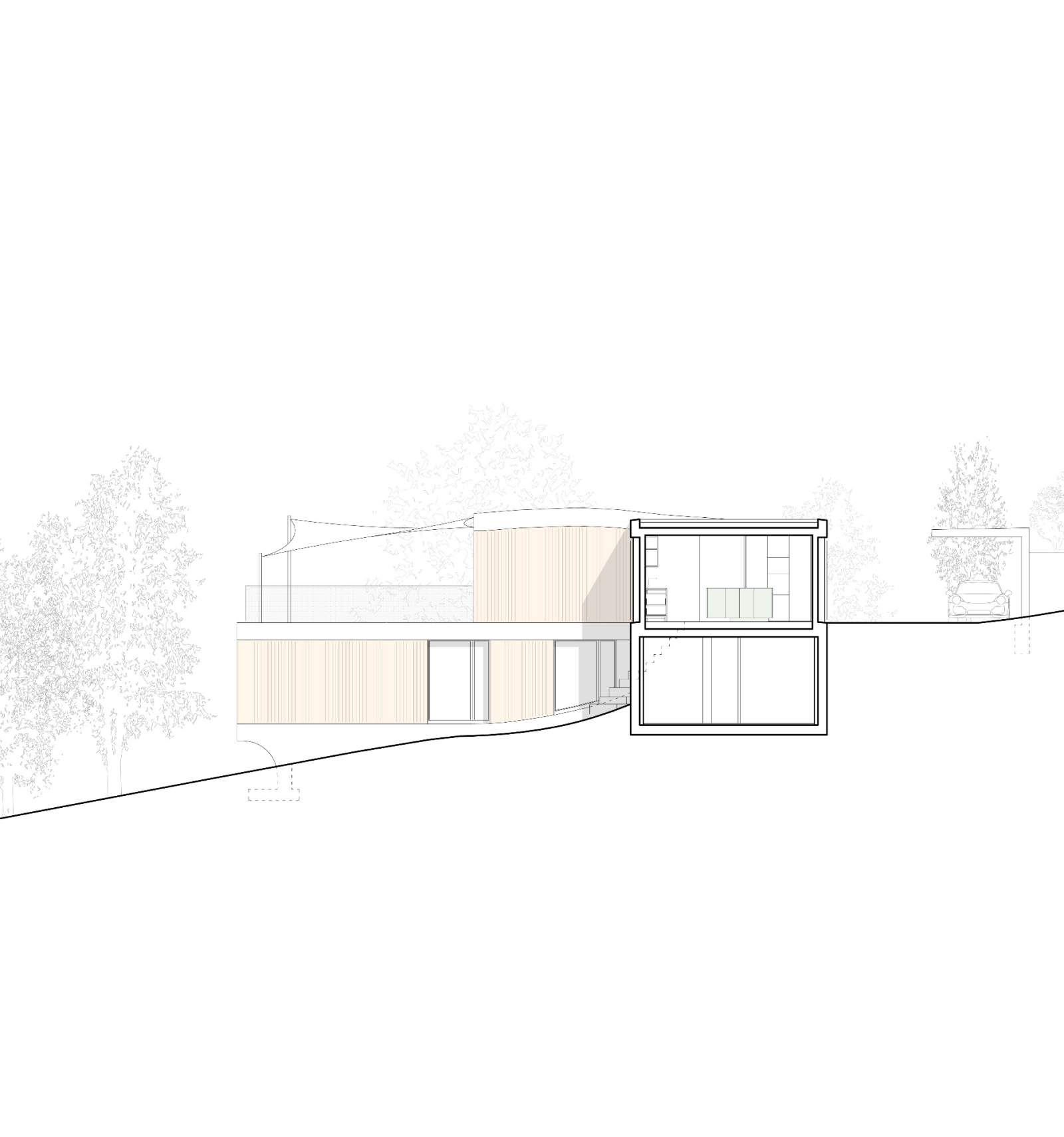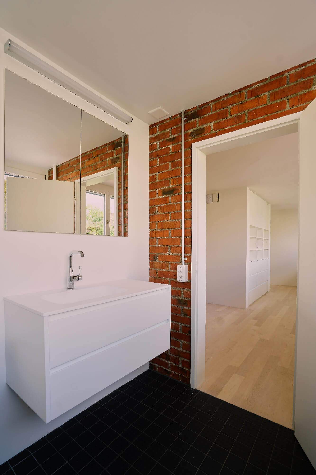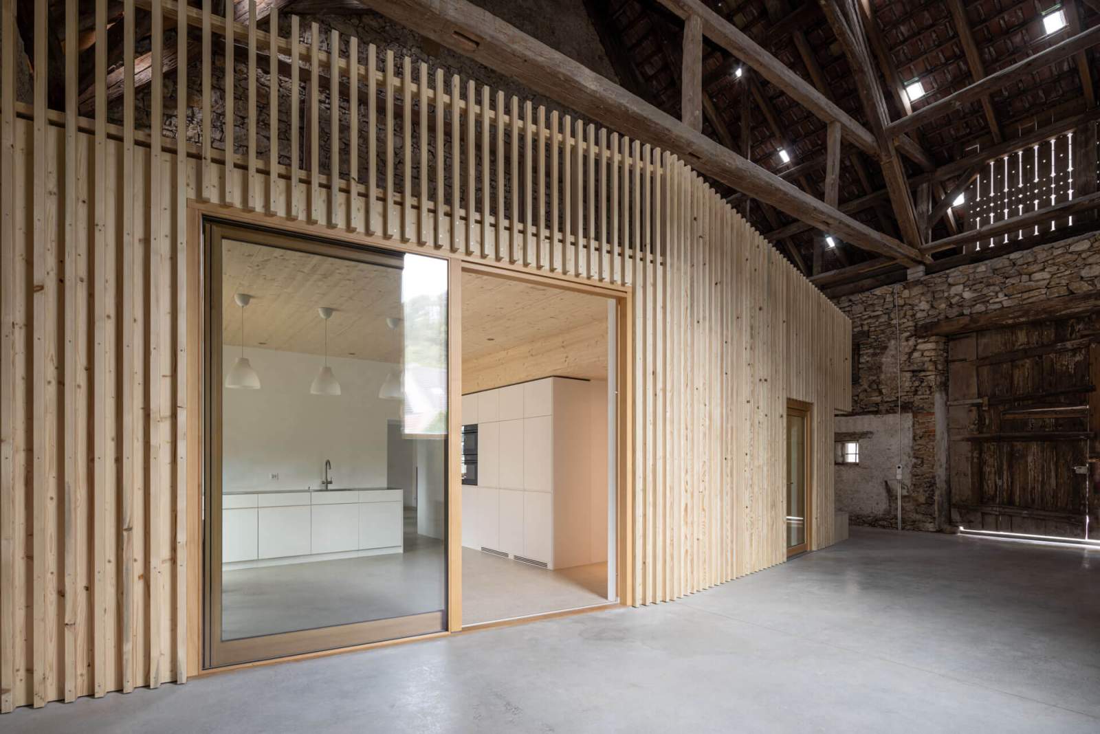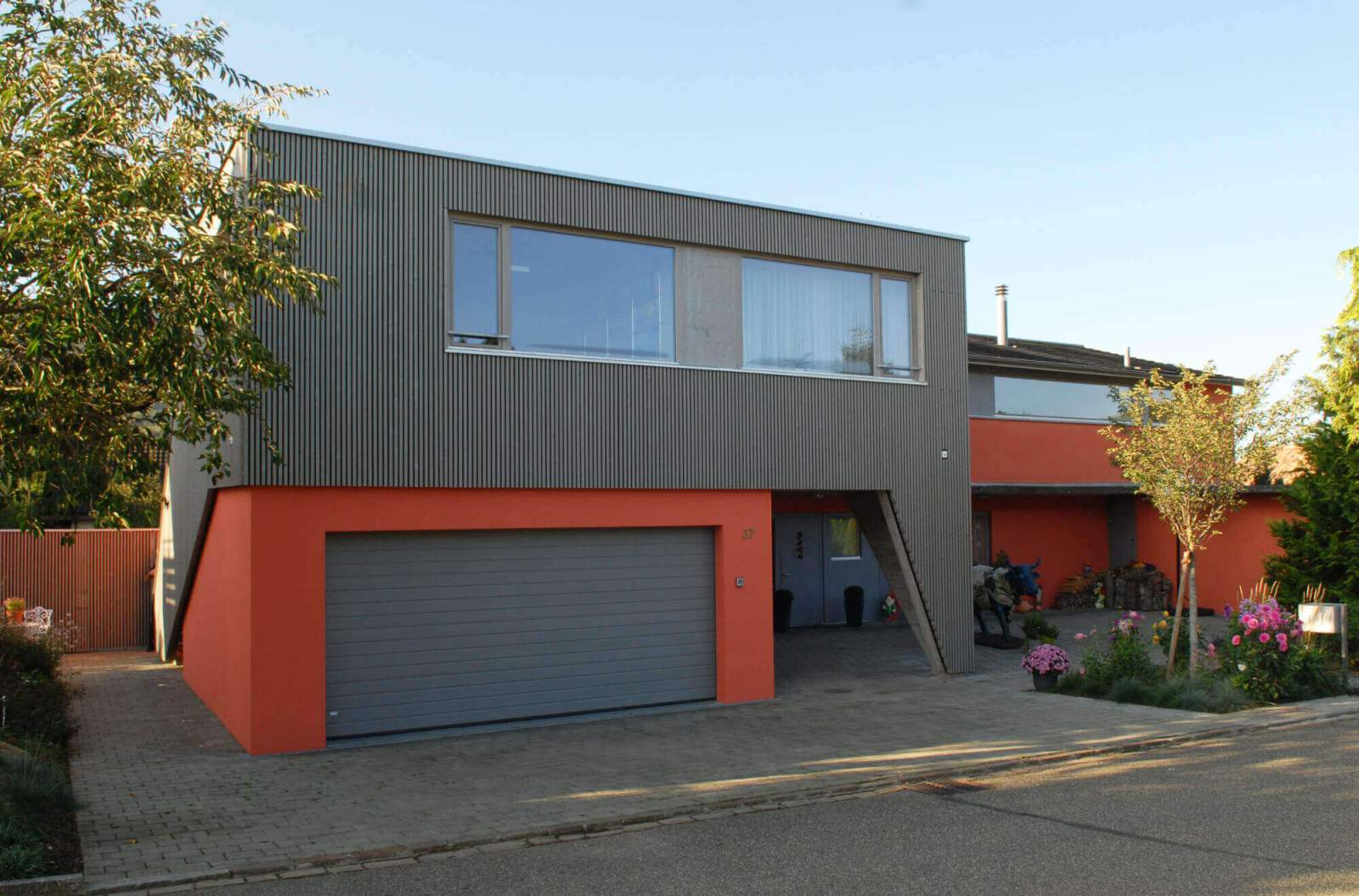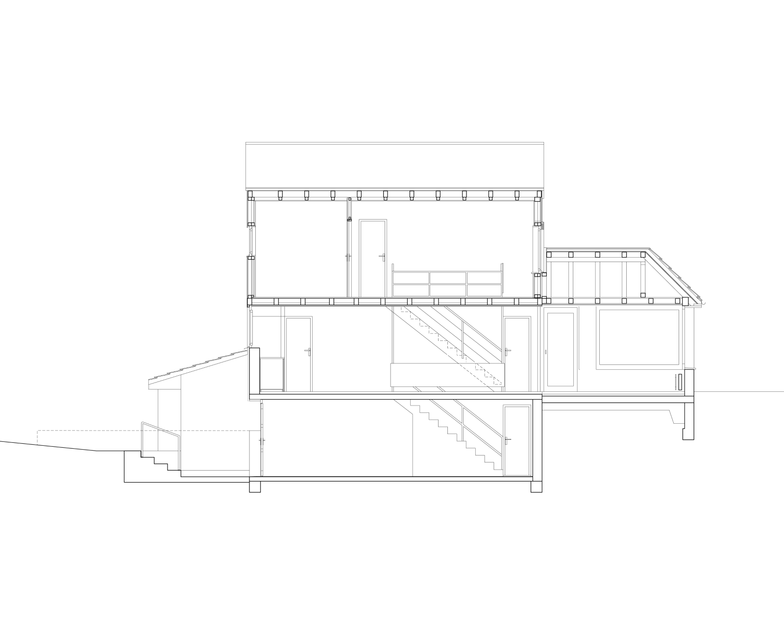 Die grössten Eingriffe erfährt das 1. Obergeschoss. Zugunsten einer grosszügigen Raumwirkung wird die Grundrissstruktur maximal aufgelöst und notwendige Wandabschnitte in raumbildende Körper integriert. Diese gliedern Küche, Wohn- und Arbeitsbereich. Das 2. Obergeschoss mit den Schlafräumen bleibt kleinteilig und erfährt bis auf die Öffnung zum Treppenraum kaum substantielle Eingriffe. Der ehemalige Estrich erhält zwei neue Dachfester und bietet den Kindern eine erweiterte Spielfläche. Um das ursprüngliche Fassadenbild zu erhalten, wurde lediglich das Dach saniert und alle Fenster ersetzt. Eine Photovoltaikanlage auf der südlichen Dachfläche ergänzt das energetische Konzept. Die haustechnischen Anlagen wurden modernisiert.