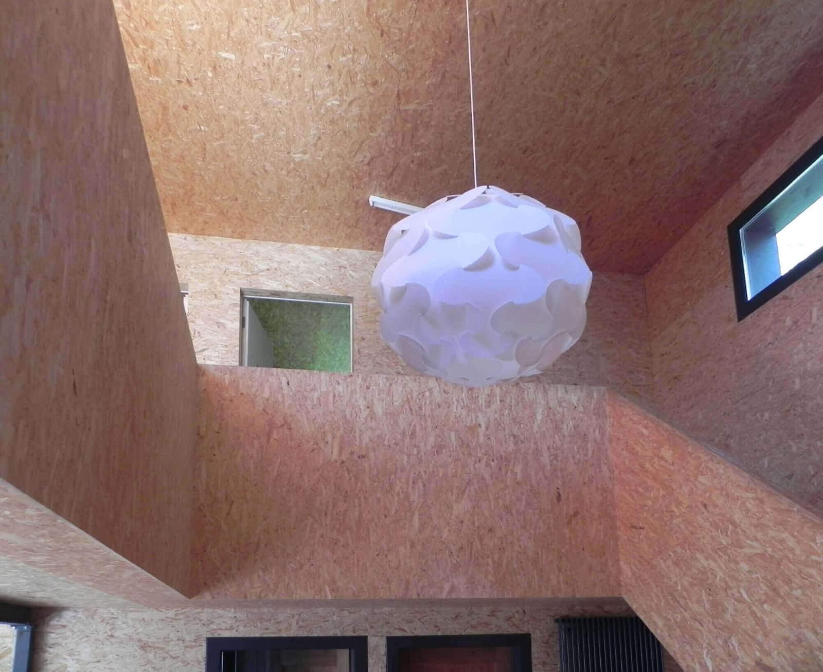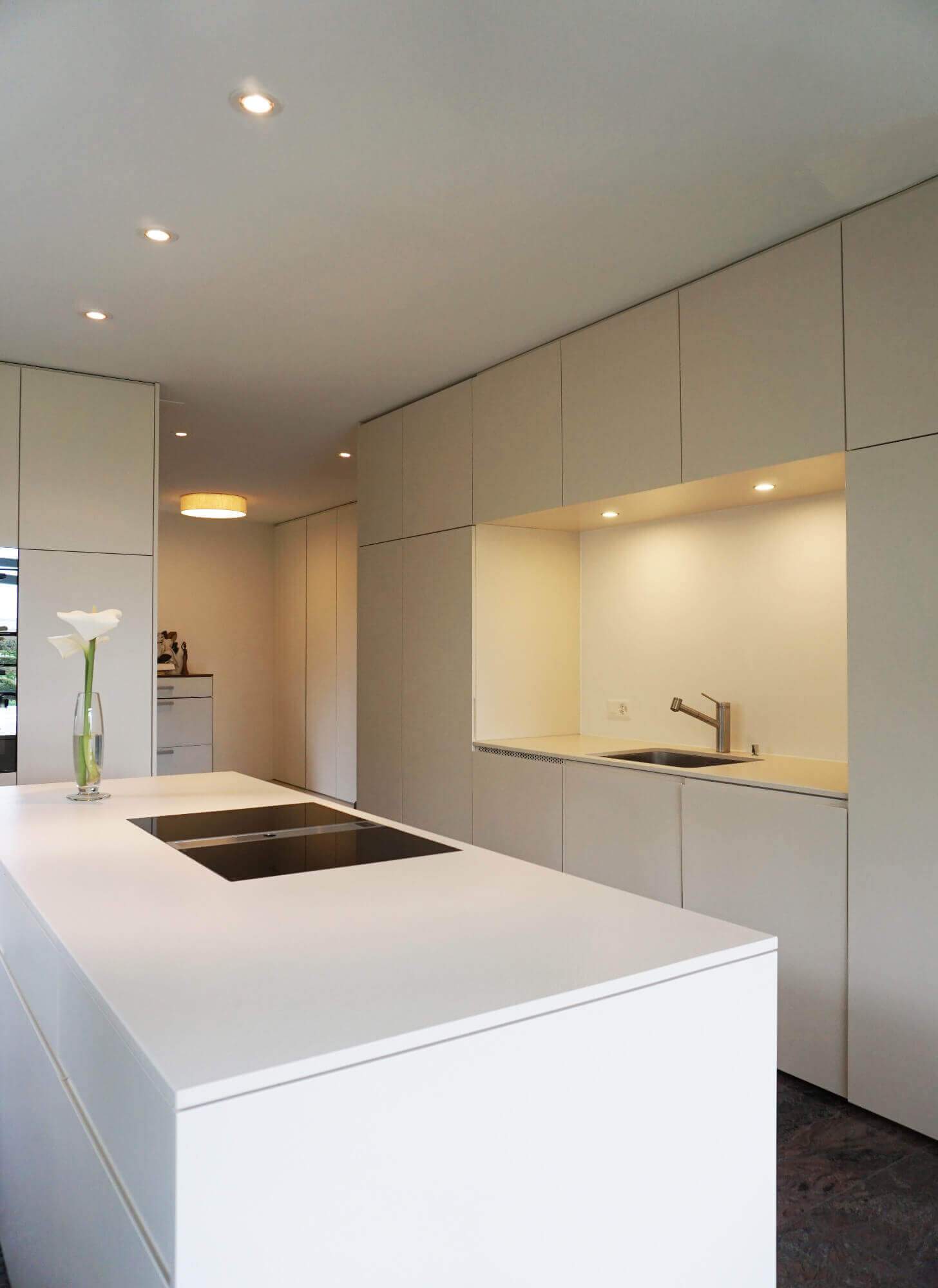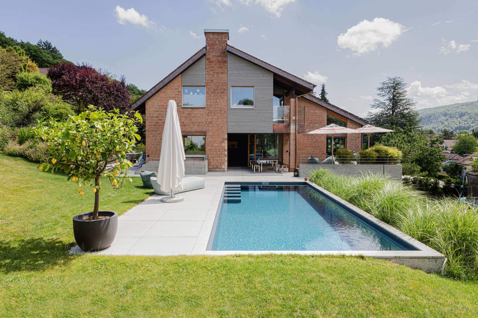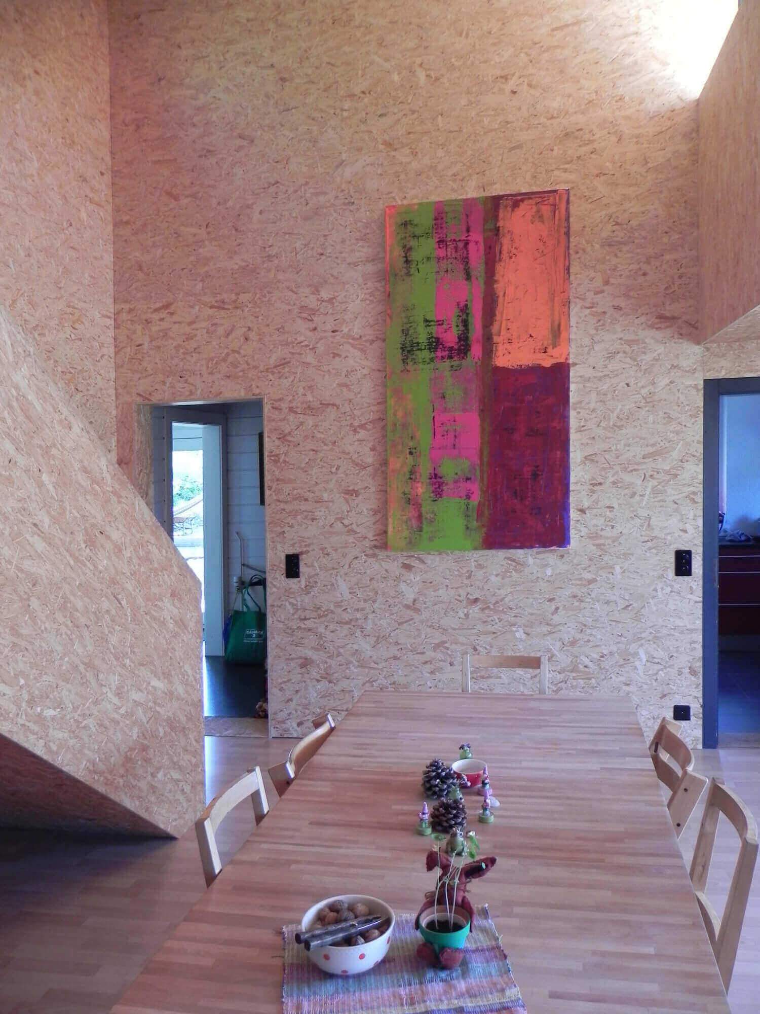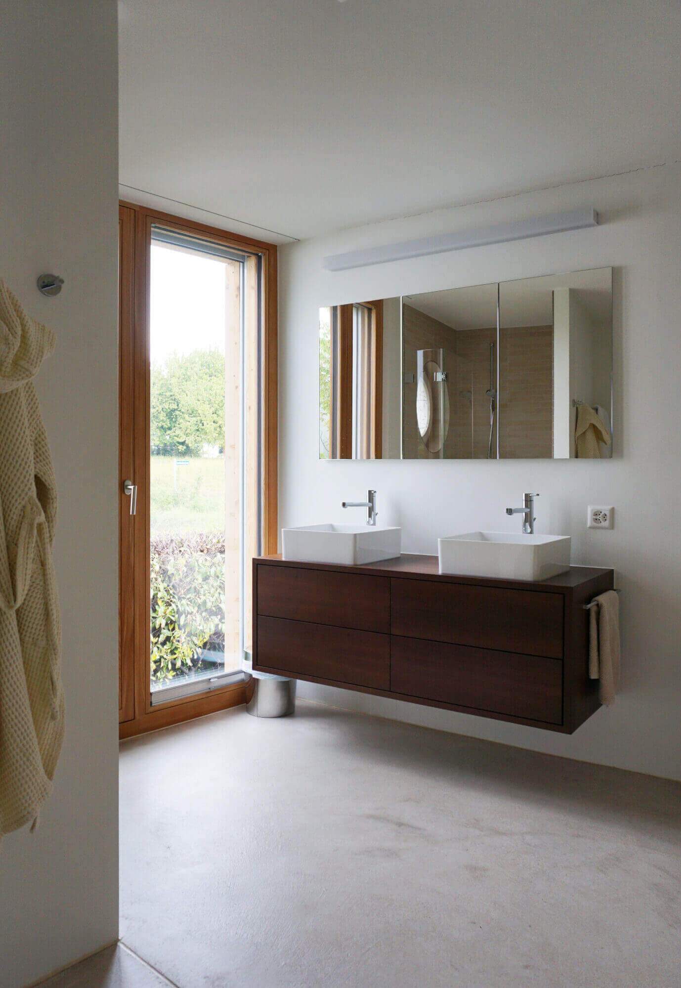 Die grössten Eingriffe erfährt das 1. Obergeschoss. Zugunsten einer grosszügigen Raumwirkung wird die Grundrissstruktur maximal aufgelöst und notwendige Wandabschnitte in raumbildende Körper integriert. Diese gliedern Küche, Wohn- und Arbeitsbereich. Das 2. Obergeschoss mit den Schlafräumen bleibt kleinteilig und erfährt bis auf die Öffnung zum Treppenraum kaum substantielle Eingriffe. Der ehemalige Estrich erhält zwei neue Dachfester und bietet den Kindern eine erweiterte Spielfläche. Um das ursprüngliche Fassadenbild zu erhalten, wurde lediglich das Dach saniert und alle Fenster ersetzt. Eine Photovoltaikanlage auf der südlichen Dachfläche ergänzt das energetische Konzept. Die haustechnischen Anlagen wurden modernisiert.
