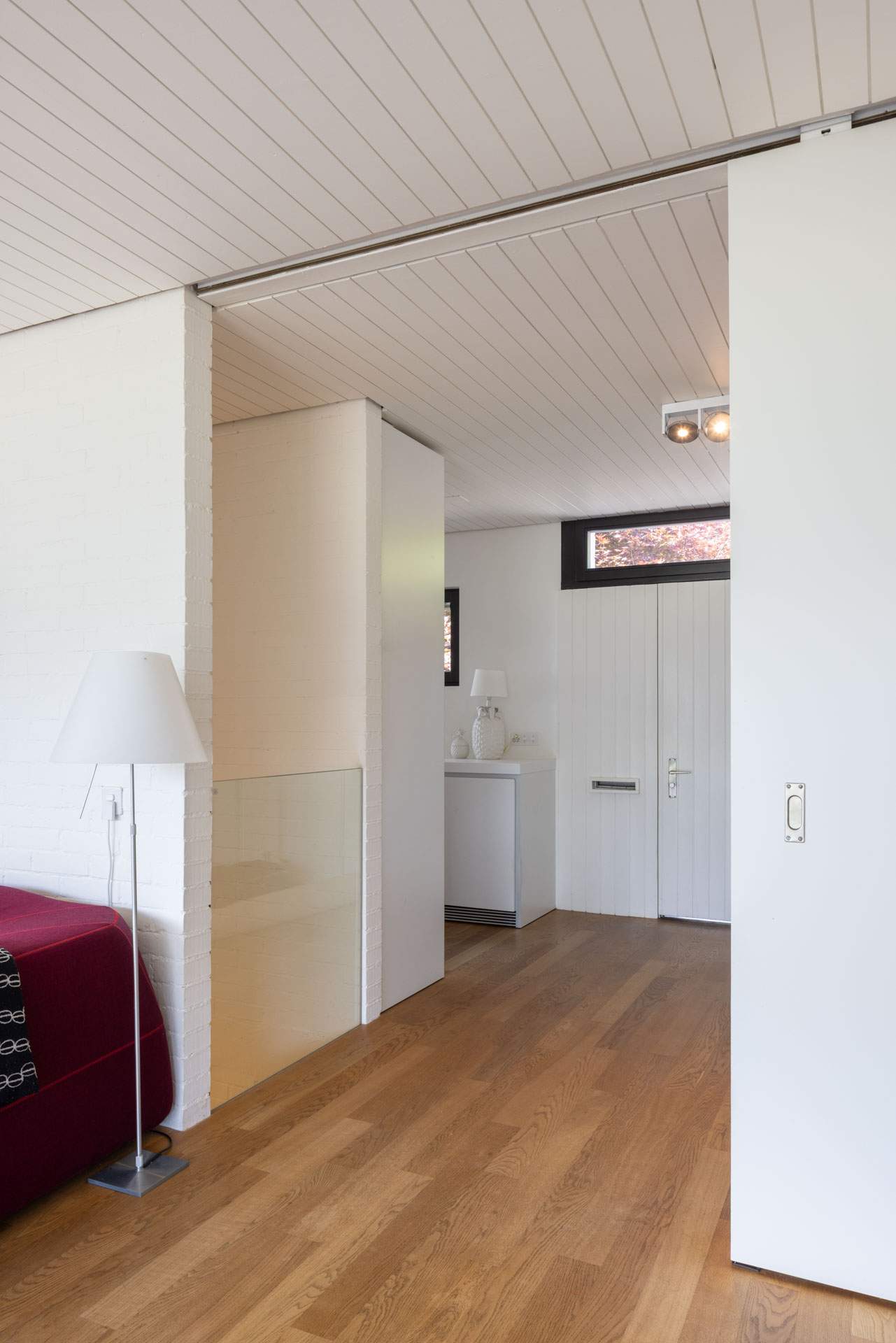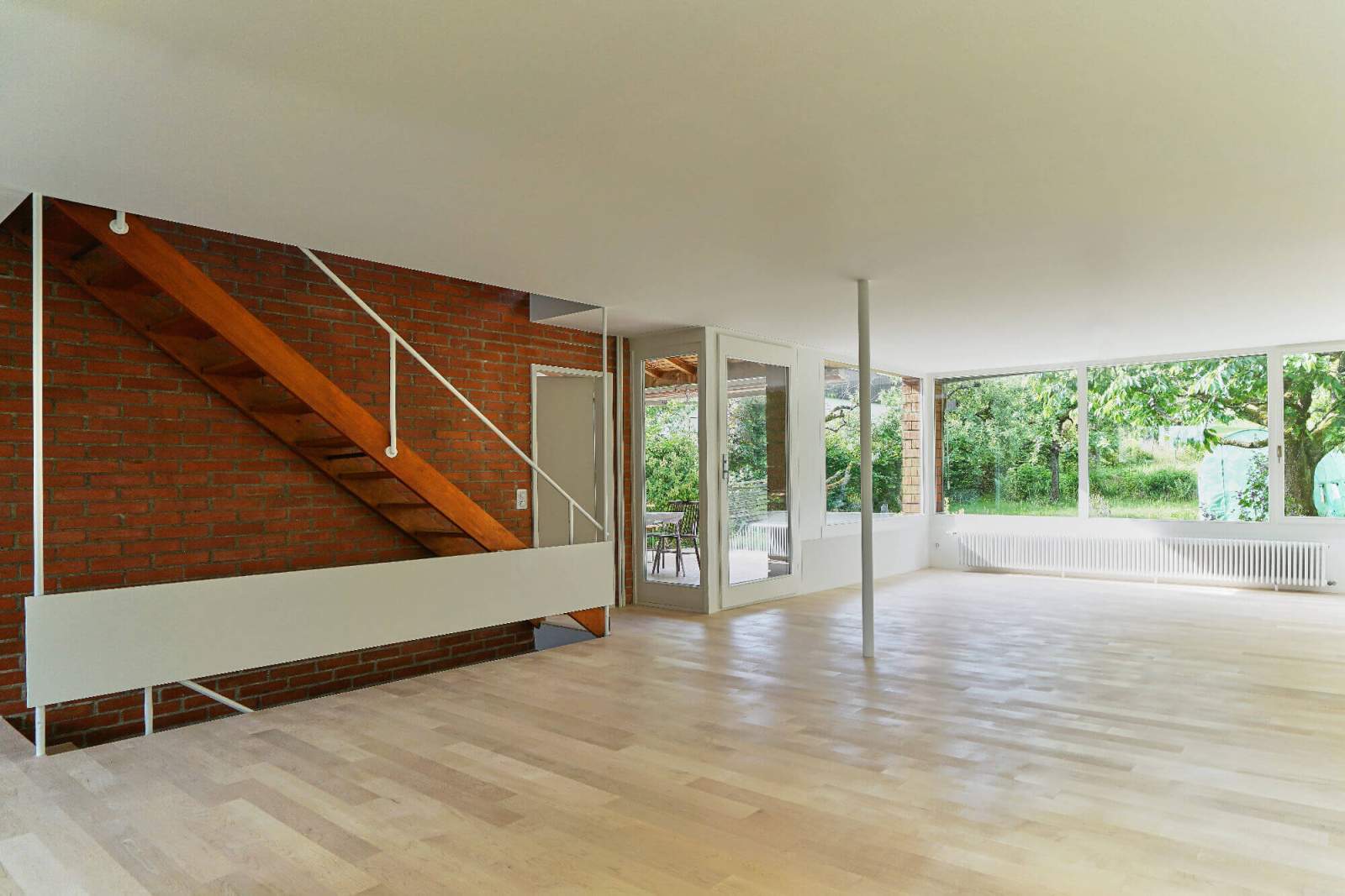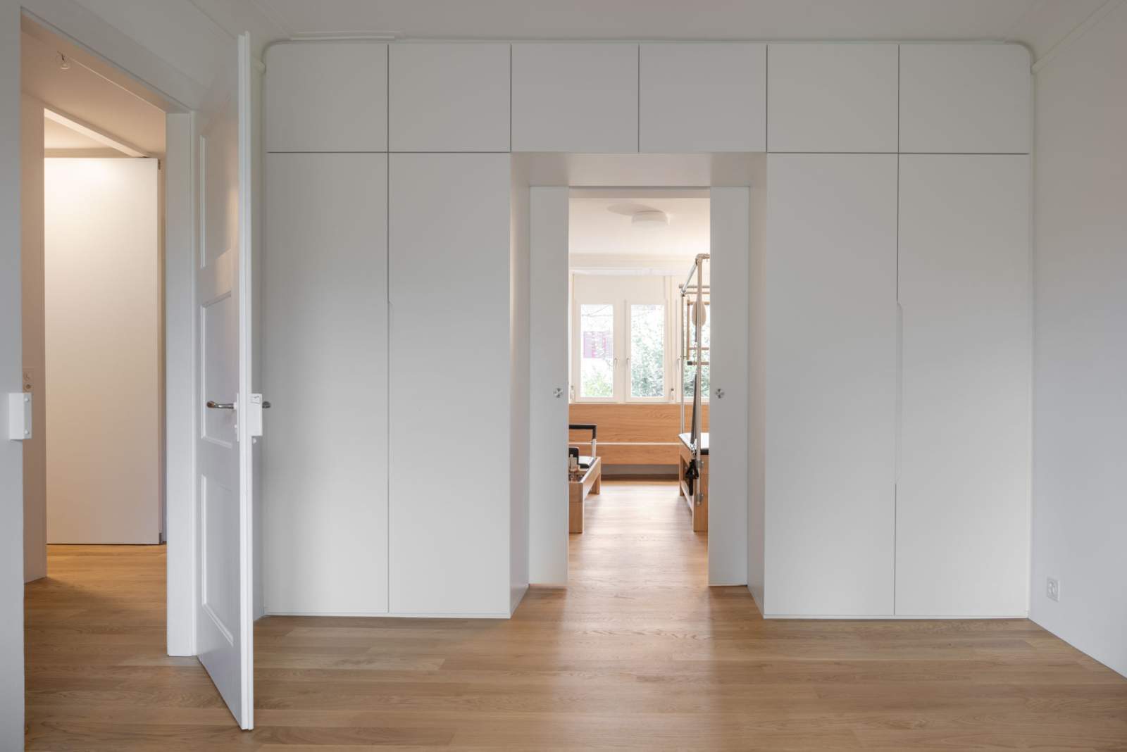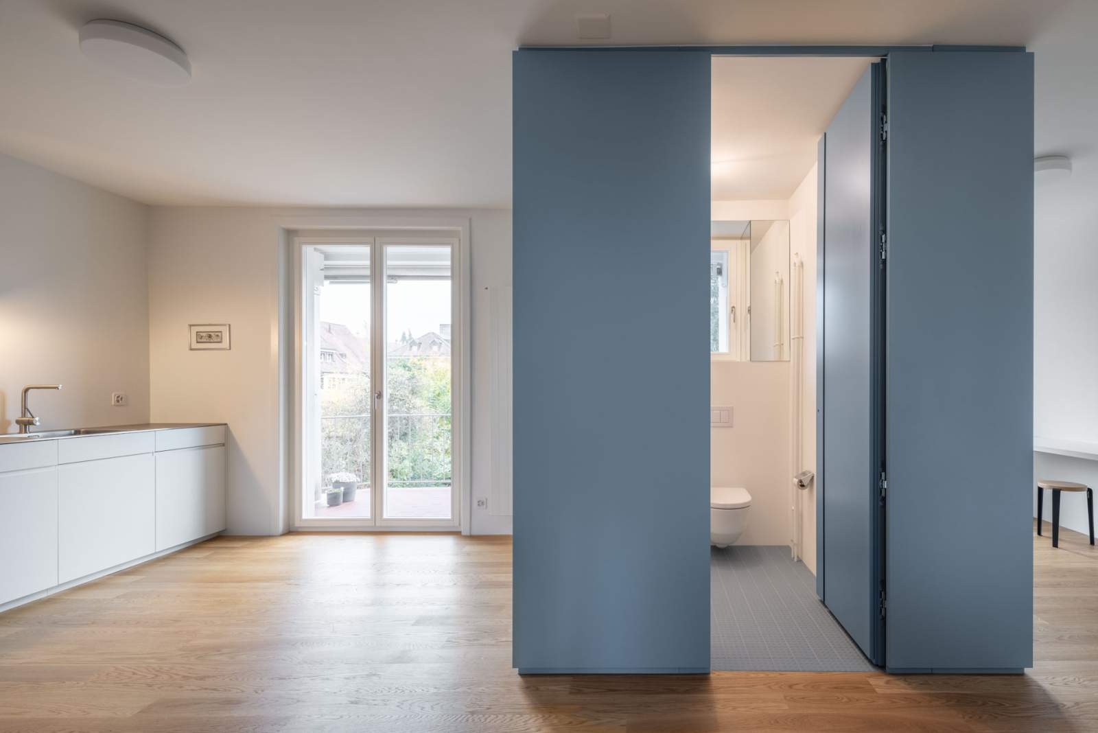 Gleich im Erdgeschoss weicht der schlanke Treppenhausflur einem grosszügigen Eingangsbereich mit freistehender Garderobe. Dieser Bereich dient als Verteiler zwischen der flexiblen Erdgeschossnutzung und den Hauptwohnräumen. Die zwei grossen Zimmer im Erdgeschoss sind über Schiebetüren frei kombinierbar. Das modernisierte Duschbad und die kompakte Teeküche vervollständigen diese Einheit. Direkt zur Treppe gelangt man über eine raumhohe Pendeltüre. Diese findet sich in jedem Geschoss wieder und vereint die Räume mit dem Treppenraum.