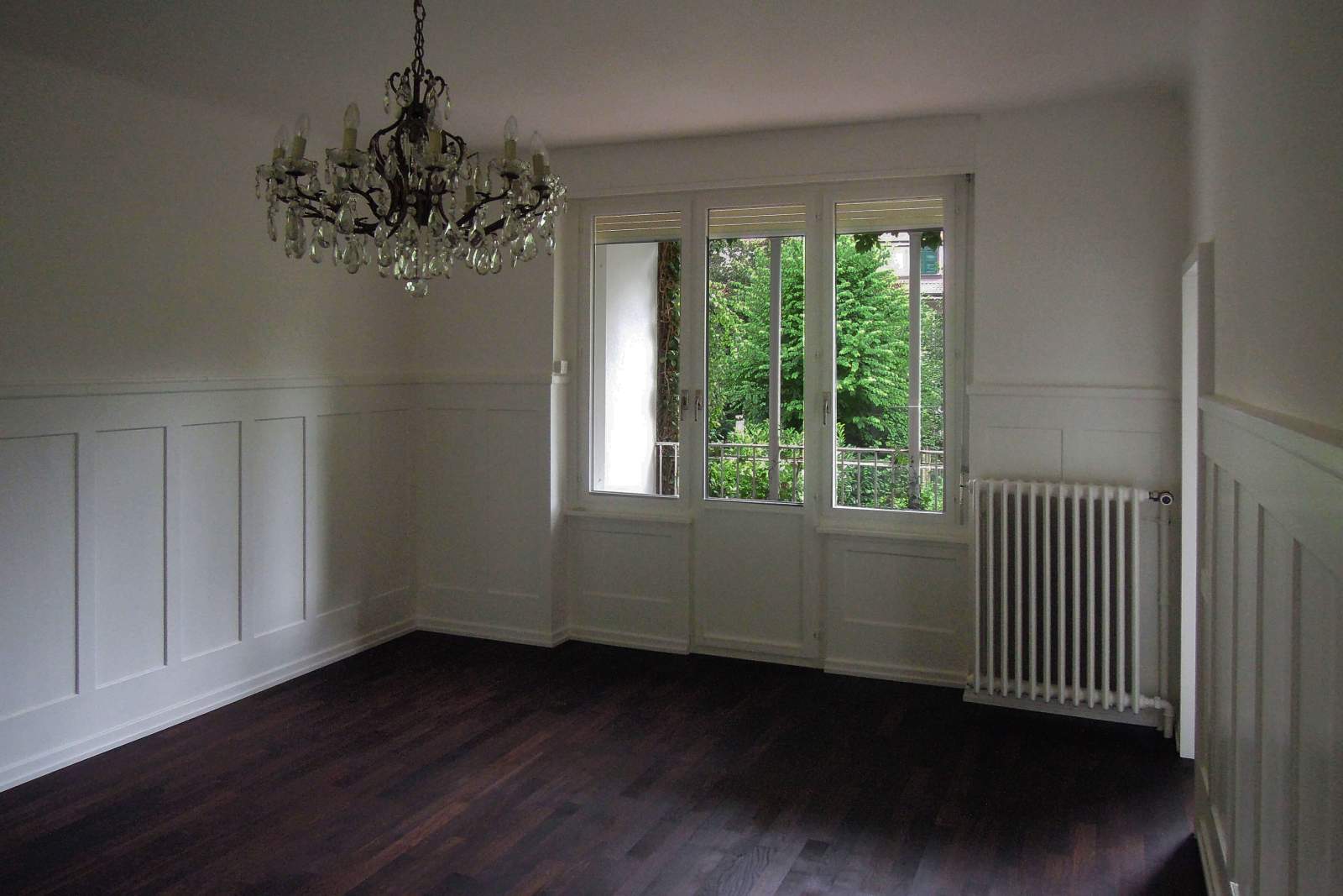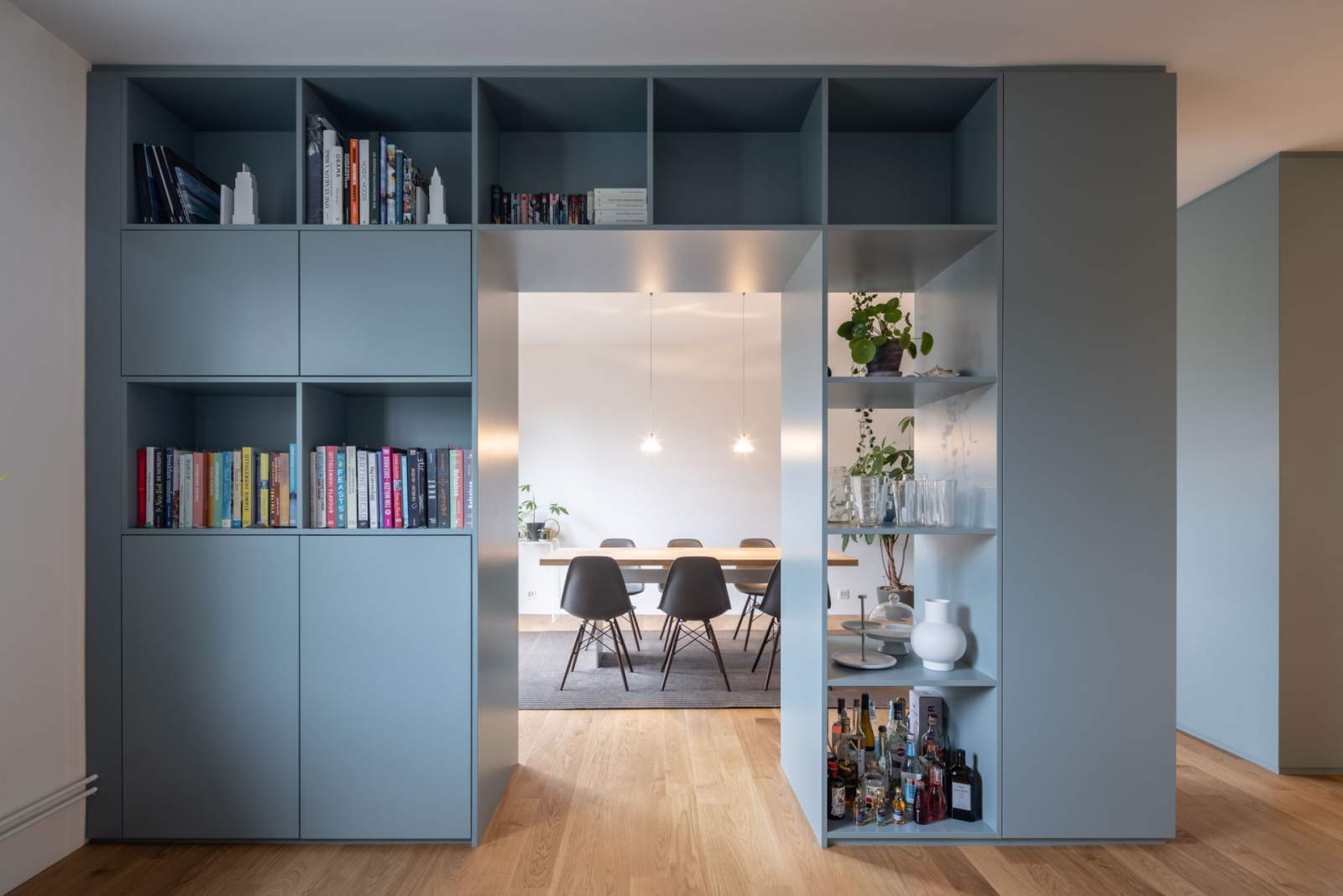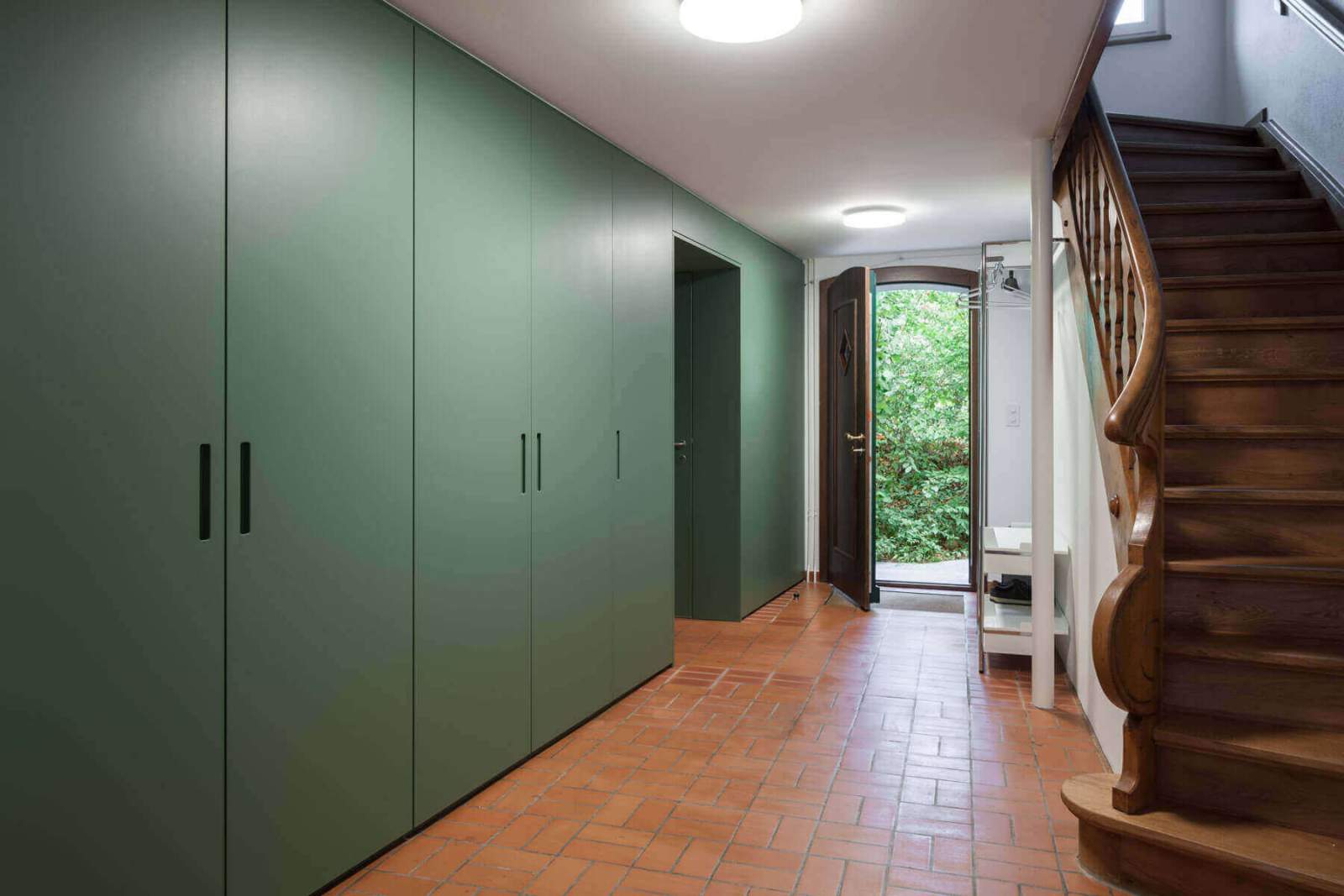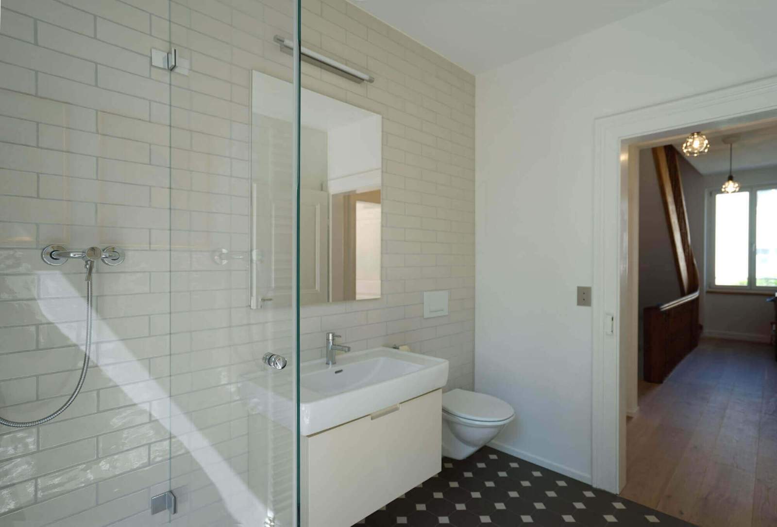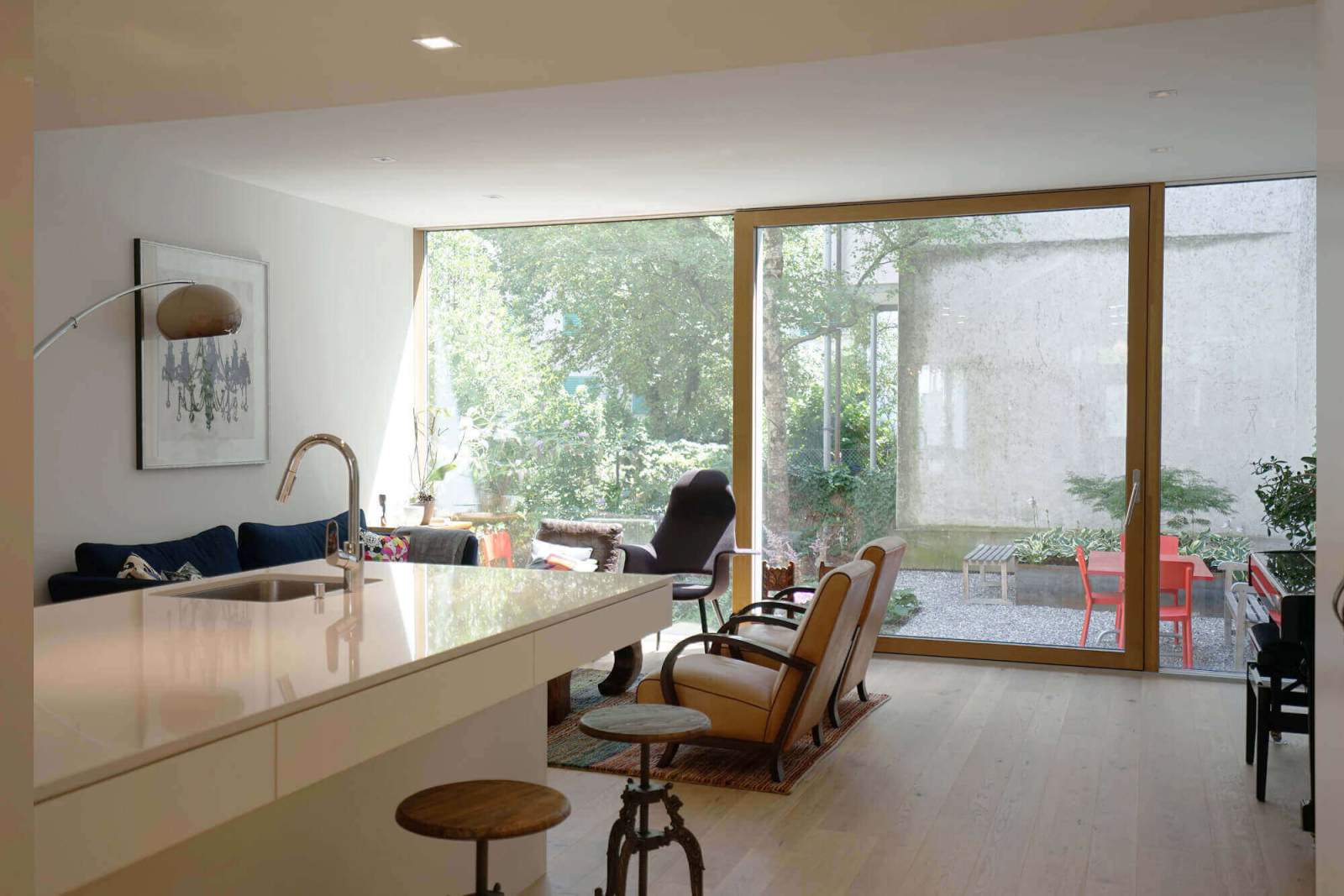 Gleich im Erdgeschoss weicht der schlanke Treppenhausflur einem grosszügigen Eingangsbereich mit freistehender Garderobe. Dieser Bereich dient als Verteiler zwischen der flexiblen Erdgeschossnutzung und den Hauptwohnräumen. Die zwei grossen Zimmer im Erdgeschoss sind über Schiebetüren frei kombinierbar. Das modernisierte Duschbad und die kompakte Teeküche vervollständigen diese Einheit. Direkt zur Treppe gelangt man über eine raumhohe Pendeltüre. Diese findet sich in jedem Geschoss wieder und vereint die Räume mit dem Treppenraum.