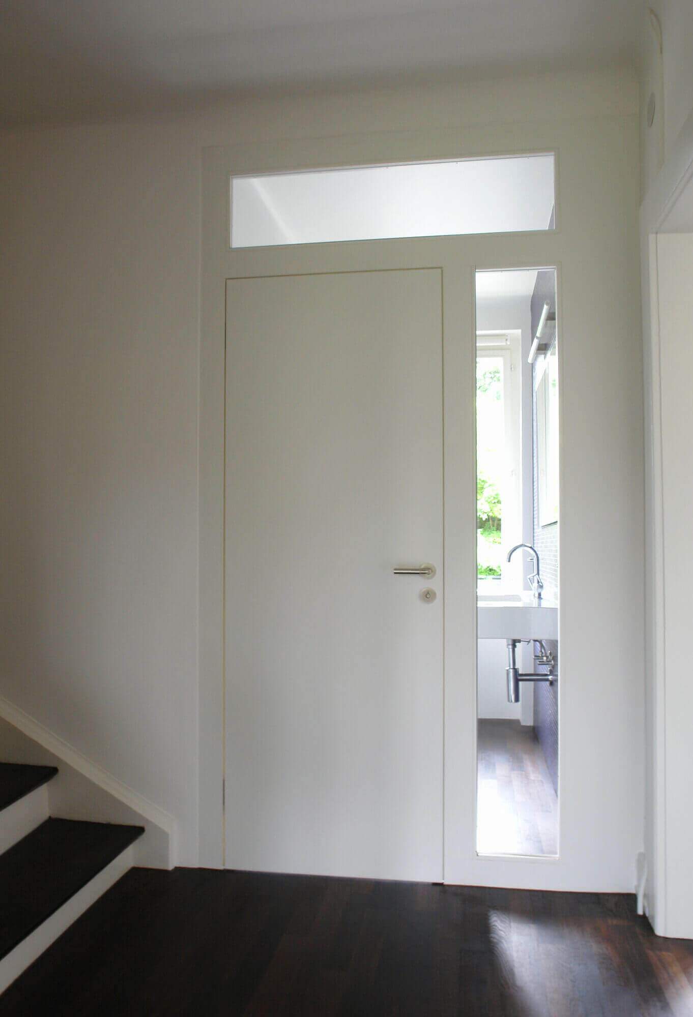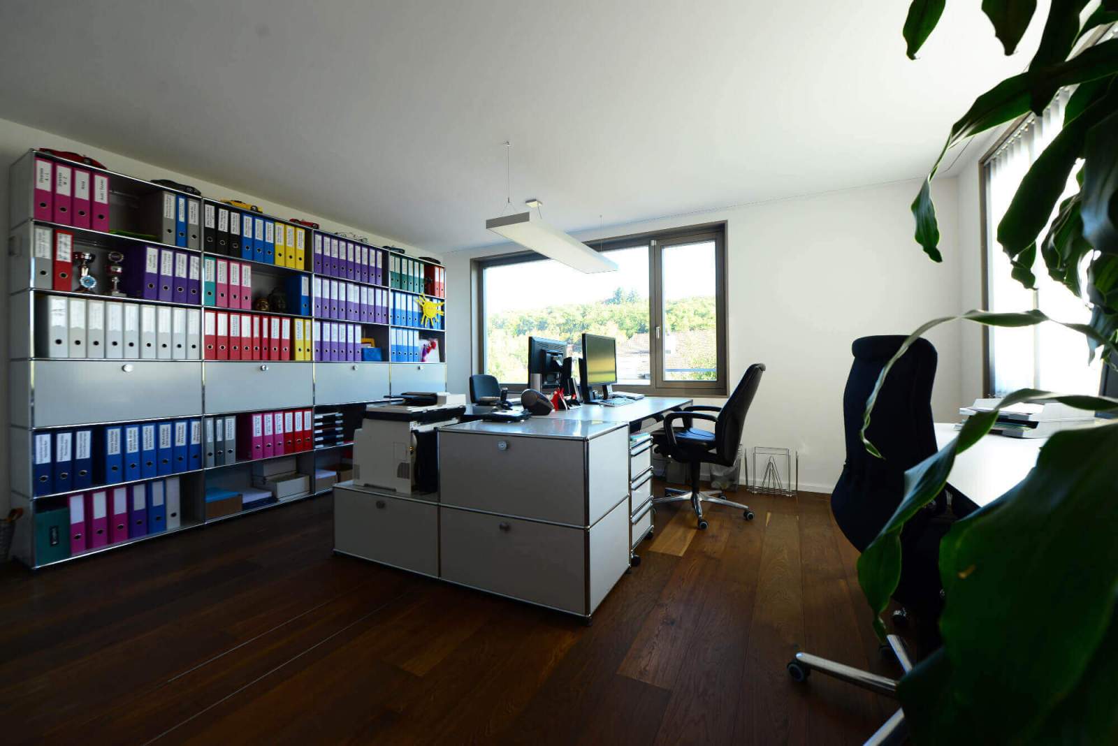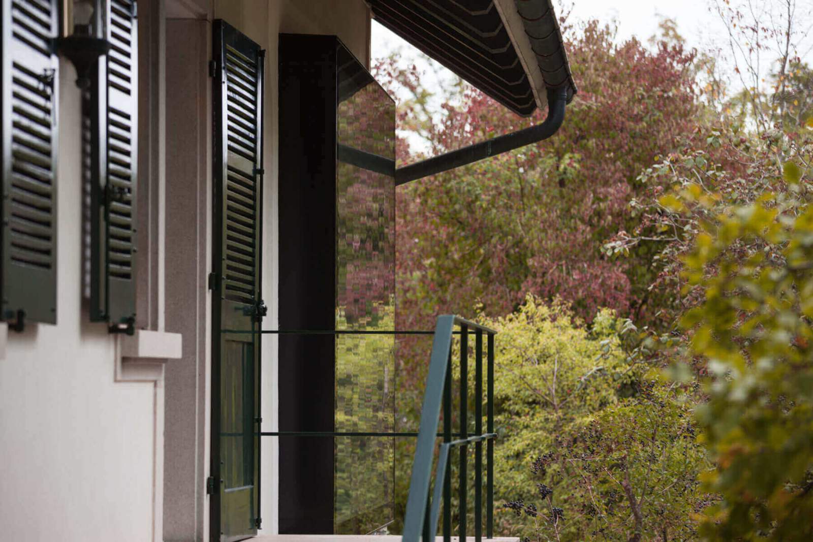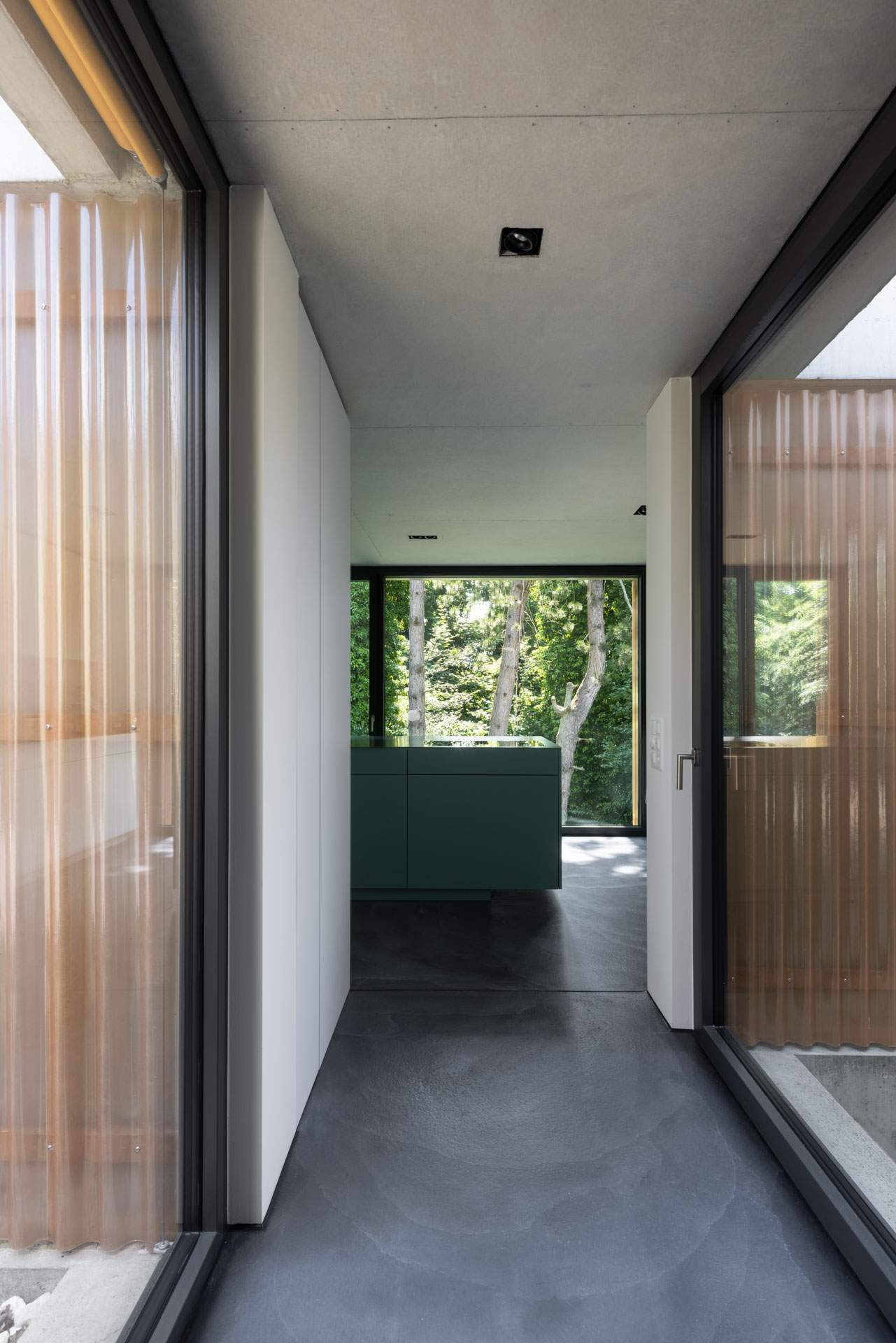 Gleich im Erdgeschoss weicht der schlanke Treppenhausflur einem grosszügigen Eingangsbereich mit freistehender Garderobe. Dieser Bereich dient als Verteiler zwischen der flexiblen Erdgeschossnutzung und den Hauptwohnräumen. Die zwei grossen Zimmer im Erdgeschoss sind über Schiebetüren frei kombinierbar. Das modernisierte Duschbad und die kompakte Teeküche vervollständigen diese Einheit. Direkt zur Treppe gelangt man über eine raumhohe Pendeltüre. Diese findet sich in jedem Geschoss wieder und vereint die Räume mit dem Treppenraum.